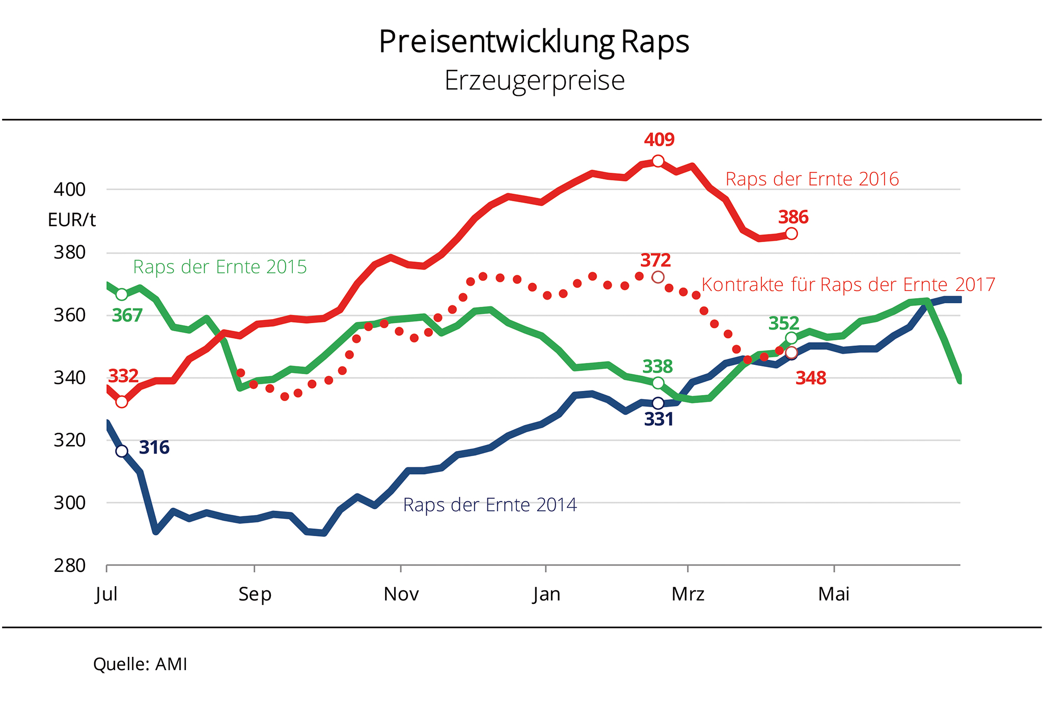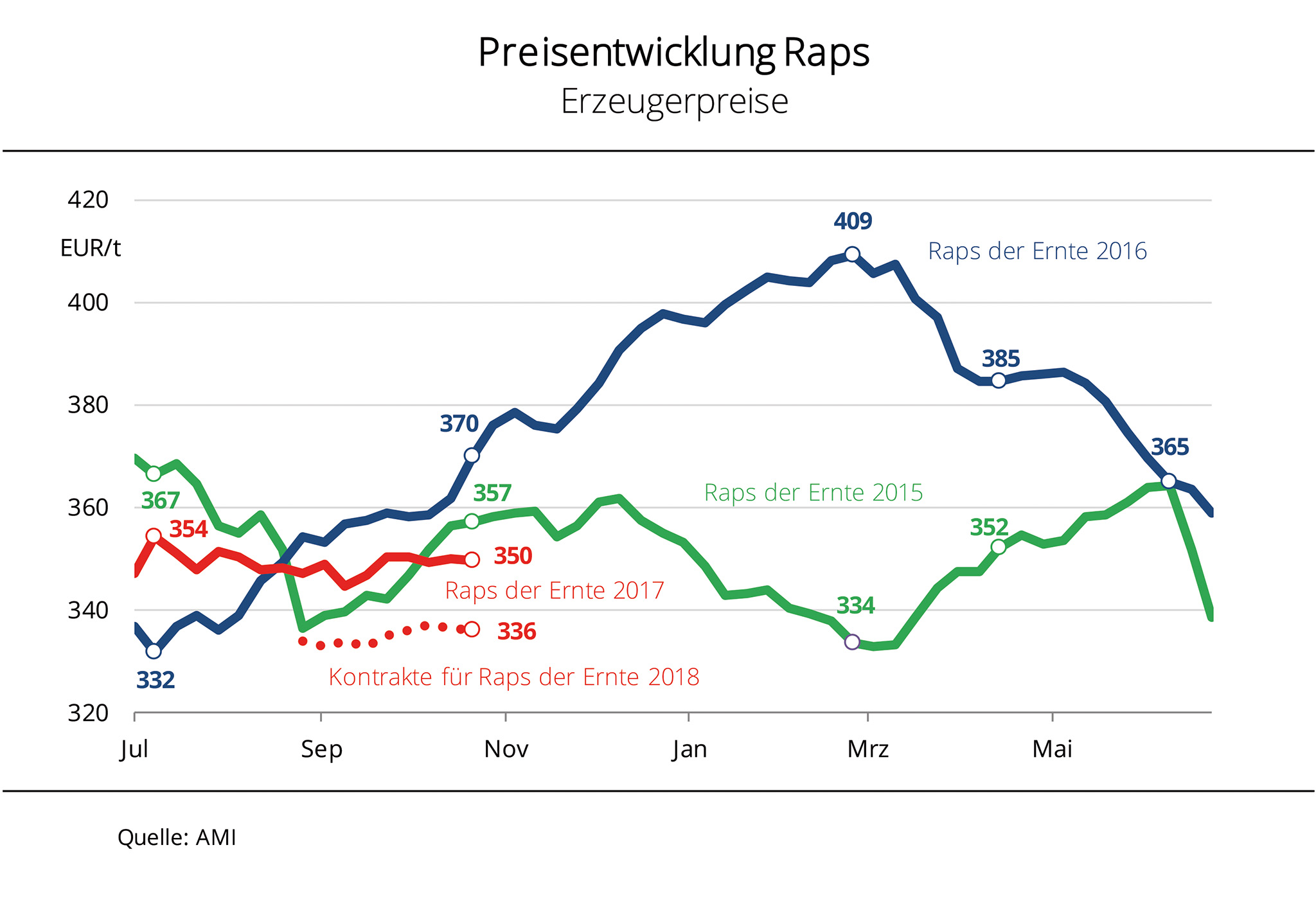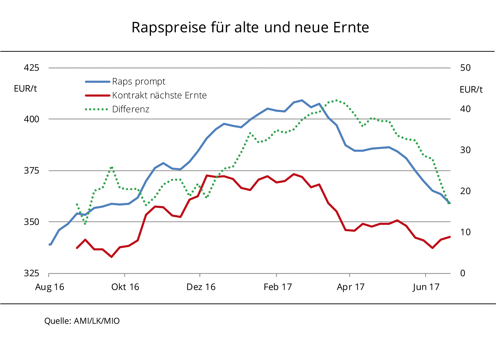 Preise für alterntige Ware und Preise für die neue Ernte nähern sich etwas an. Die rückläufige Entwicklung der Kontraktpreise zur neuen Ernte hat die Talsohle durchschritten. Nachdem im März 2017 die Spitzenpreise in diesem Jahr erzielten worden waren, ging es danach stetig bergab. Grund hierfür waren die im Zuge fallender US-Sojakurse schwächeren Terminnotierungen in Paris und in Chicago. Nach Angaben der Agrarmarkt Informations-Gesellschaft mbH (AMI) lässt allerdings die Aussicht auf eine komfortable Sojaversorgung weltweit den Kursen keinen Spielraum nach oben. Außerdem wurde die europäische Rapsnachfrage seitdem Frühjahr 2017 mit Raps aus Australien reichlich bedient. Vor diesem Hintergrund hoffen Erzeuger, dass sich die Preislinien im Bereich um 350 EUR/t treffen werden.