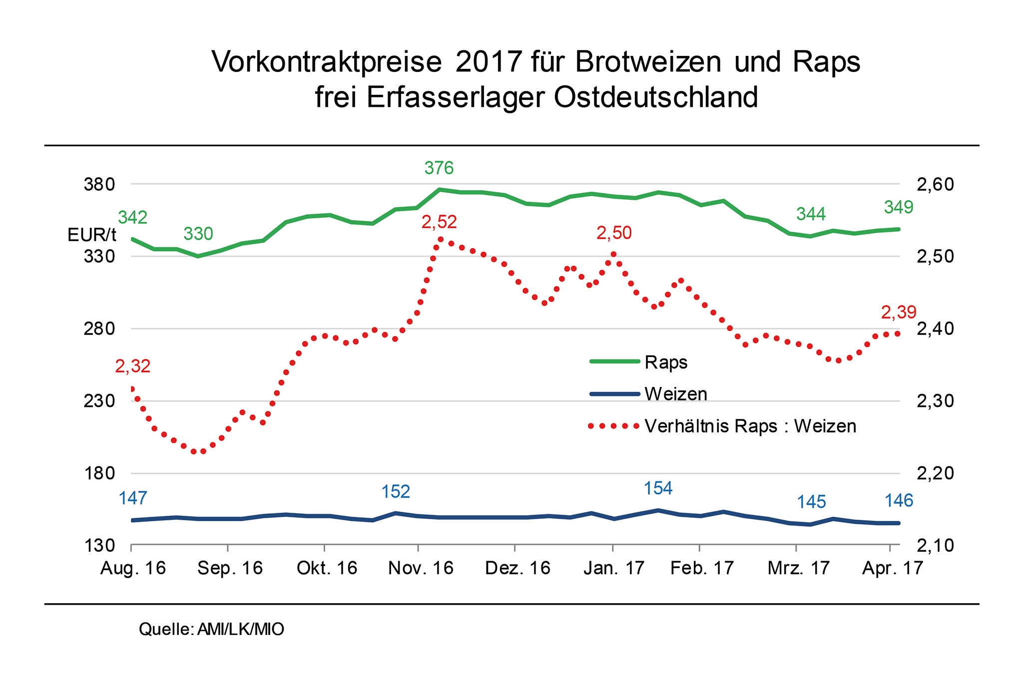 Der Preisabstand der Vorkontrakte für Weizen und Raps liegt aktuell bei rund 220 EUR/t und erreicht damit fast den Saisonhöchststand. Der Abstand der Vorkontraktpreise zwischen Brotweizen und Raps zur Ernte 2017 hat sich in den vergangenen Monaten in Ostdeutschland zunehmend vergrößert. Während Weizen immer preisgünstiger wurde, hat sich Raps ex Ernte verteuert. Dies beruht primär auf der unterschiedlichen globalen Versorgungslage 2016/17, die sich auch auf die nächste Saison auswirkt. Für 2016/17 werden eine weltweite Rekorderzeugung von knapp 750 Mio. t Weizen erwartet. Demgegenüber kann die Rapserzeugung den zu erwartenden Verbrauch nicht decken, was zu Lasten der Vorräte geht, die sich um über 5 % reduzieren werden. Nach Angaben der Agrarmarkt Informationsgesellschaft mbH (AMI) werden für Brotweizen ex Ernte durchschnittlich 150 EUR/t frei Erfasserlager geboten und damit auf Grund der anhaltend üppigen Versorgung genauso viel wie für prompte Ware. Die aktuell knappe Versorgung mit Raps wirkt sich entsprechend auch auf das Preisniveau für die kommende Ernte aus. Frei Erfasserlager werden derzeit für Raps 371 EUR/t gefordert. Das sind zwar 34 EUR/t weniger als für prompte Ware, da eine komfortablere Versorgung 2017/18 erwartet wird, aber immer noch 50 EUR mehr als zum Vorjahreszeitpunkt.