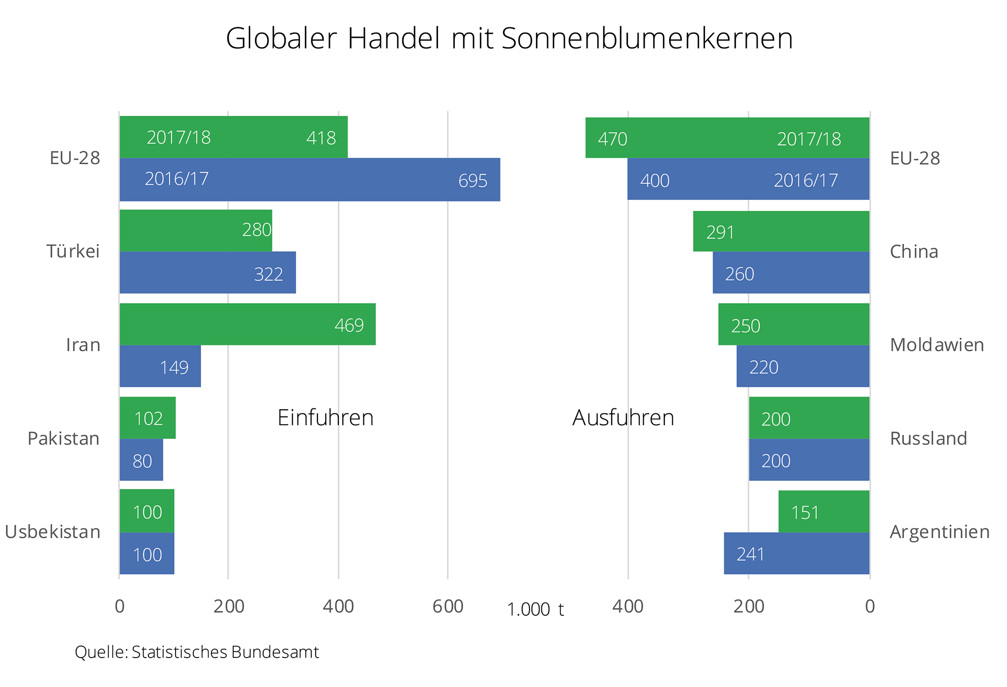 Der Internationale Getreiderat (IGC) erwartet einen Rückgang des globalen Handels mit Sonnenblumenkernen. Der geringere Importbedarf der EU-28 limitiert die Nachfrage. Die bessere Versorgung mit Ölsaaten in wichtigen Importländern der EU-28 verringert die Nachfrage nach Sonnenblumenkernen. Deshalb könnte 2017/18 die EU-28 wieder zum Nettoexporteur werden. 2016/17 hatte die geringe Rapsernte in der Gemeinschaft zu einem erhöhten Bedarf an Ölsaaten geführt, so auch an Sonnenblumenkernen. Die Importe stiegen auf fast 700.000 t, während die Exporte auf 400.000 t schrumpften. Für das kommende Wirtschaftsjahr sollen nach Meinung des IGC die Importe auf 418.000 t zurückgehen. Gleichzeitig wird mit einer Sonnenblumenernte um 9 Mio. t gerechnet, so dass das Exportpotenzial für 2017/18 aktuell bei 470.000 t gesehen wird. Weltweit wird der globale Handel 2017/18 auf 1,9 Mio. t taxiert, das wären 200.000 t weniger als 2016/17. Nach Angaben der Agrarmarkt Informations-Gesellschaft (AMI) wird der geringere Bedarf der EU-28 vor allem in der Ukraine zu einem Exportrückgang von rund 44 % auf 125.000 t führen.