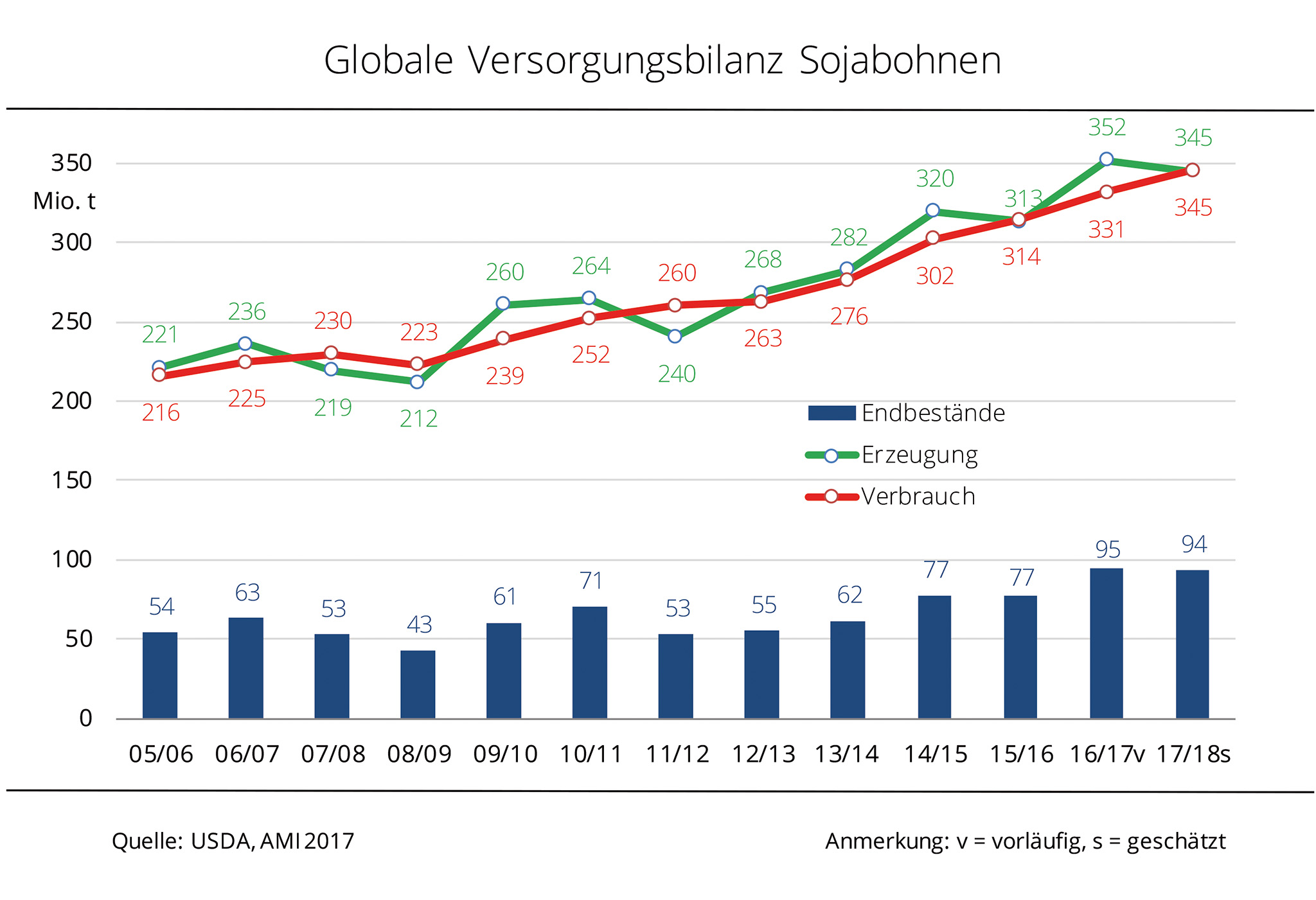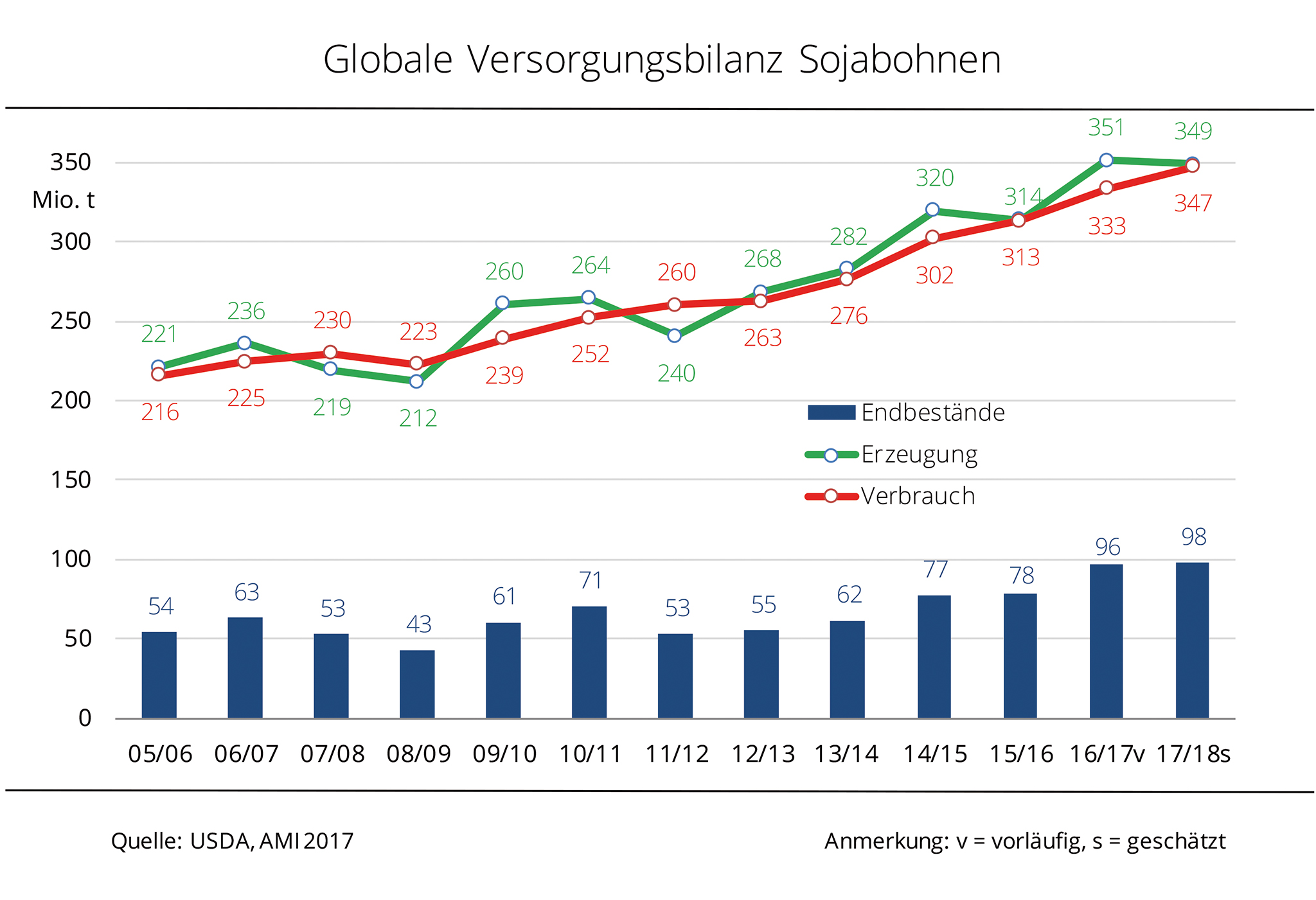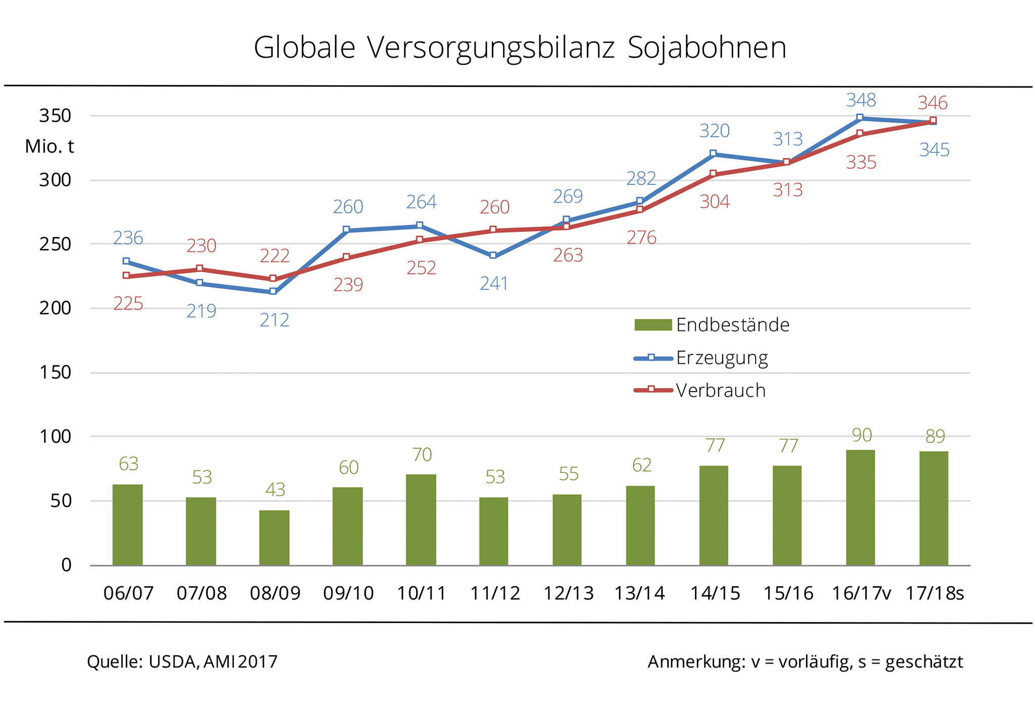 Im laufenden Wirtschaftsjahr soll weltweit die zweitgrößte Sojaernte seit Beginn der Aufzeichnungen eingefahren werden. Das klingt nach üppiger Versorgung – die Realität sieht aber wohl anders aus. Ende 2017/18 gehen die Vorräte sogar leicht zurück. Große Erntemengen führen zu niedrigeren Preisniveaus und die kurbeln die Nachfrage an. Die Nachfrage nach Sojabohnen soll nach aktuellen Schätzungen global auf 345,3 Mio. t steigen, (plus 14 Mio. t gegenüber 2016/17). Das würde nach Einschätzung der Agrarmarkt Informationsgesellschaft mbH (AMI) die erwartete Erzeugung von 345 Mio. t zwar nur knapp übersteigen und ginge damit zu Lasten der Vorräte. Diese könnten um über 1 Mio. t auf 93,5 Mio. t sinken. Die prognostizierten Endbestände an Sojabohnen 2017/18 würden rein rechnerisch die Nachfrage noch für 99 Tage decken, vor einem Jahr war es eine Woche mehr. Diese Aussicht limitiert den Preisspielraum nach unten.