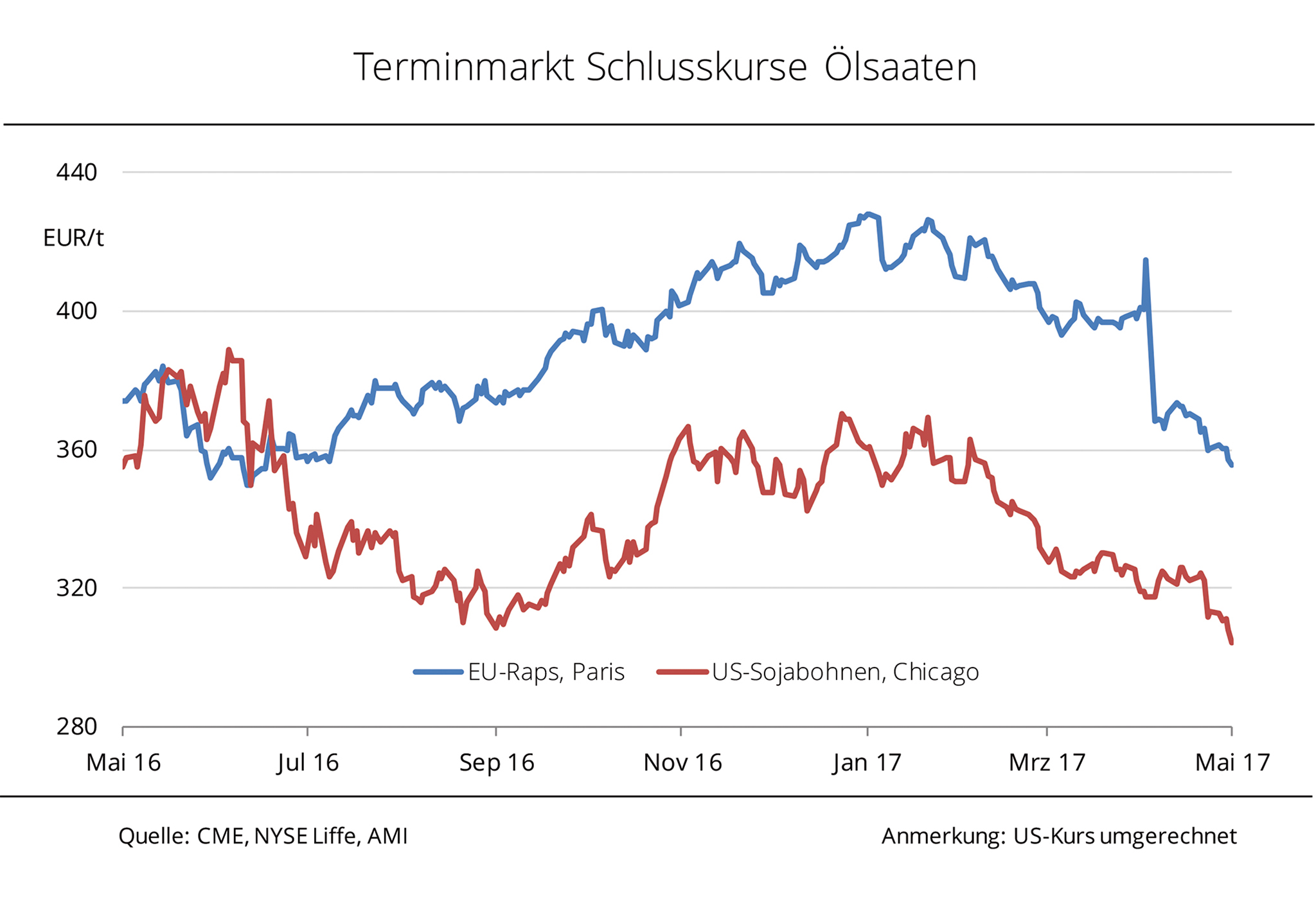 Die üppige globale Versorgung mit Sojabohnen und Flächenausweitungen in den USA für die kommende Ernte 2017 haben die Sojakurse in Chicago unter Druck gesetzt. Raps in Paris gibt ebenfalls nach, kann sich aber dank unsicherer Ernteerwartungen noch auf Vorjahresniveau halten. Der Fronttermin für Soja in Chicago fiel diese Woche auf 9,26 USD je Bushel, umgerechnet 304 EUR/t, und schloss damit auf dem tiefsten Stand seit April 2016. Durch die Rekordernten in Südamerika Anfang des Jahres lastet die üppige globale Versorgung auf den Terminnotierungen. Darüber hinaus wird die US-Sojaanbaufläche für die kommende Ernte 2017 deutlich über 36 Mio. ha geschätzt und damit rund 6 % größer als im Vorjahr, was zusätzlichen Druck ausübt. Nach Angaben der Agrarmarkt Informations-Gesellschaft mbH (AMI) können sich die Rapskurse in Paris den Vorgaben aus Übersee nicht entziehen. Allerdings fällt der Kursrückgang weniger stark aus. Nach den Höchstständen im Januar 2017 haben die Rapsnotierungen zwar rund 17 % auf aktuell 356 EUR/t nachgegeben, tendieren jedoch in etwa auf Vorjahresniveau. Vor dem Hintergrund der unsicheren Ernteerwartungen für die Ernte 2017 von bisher rund 21 Mio. t für die EU-28, dürfte die absehbar enge Rapsbilanz in der europäischen Gemeinschaft kursstützend wirken.