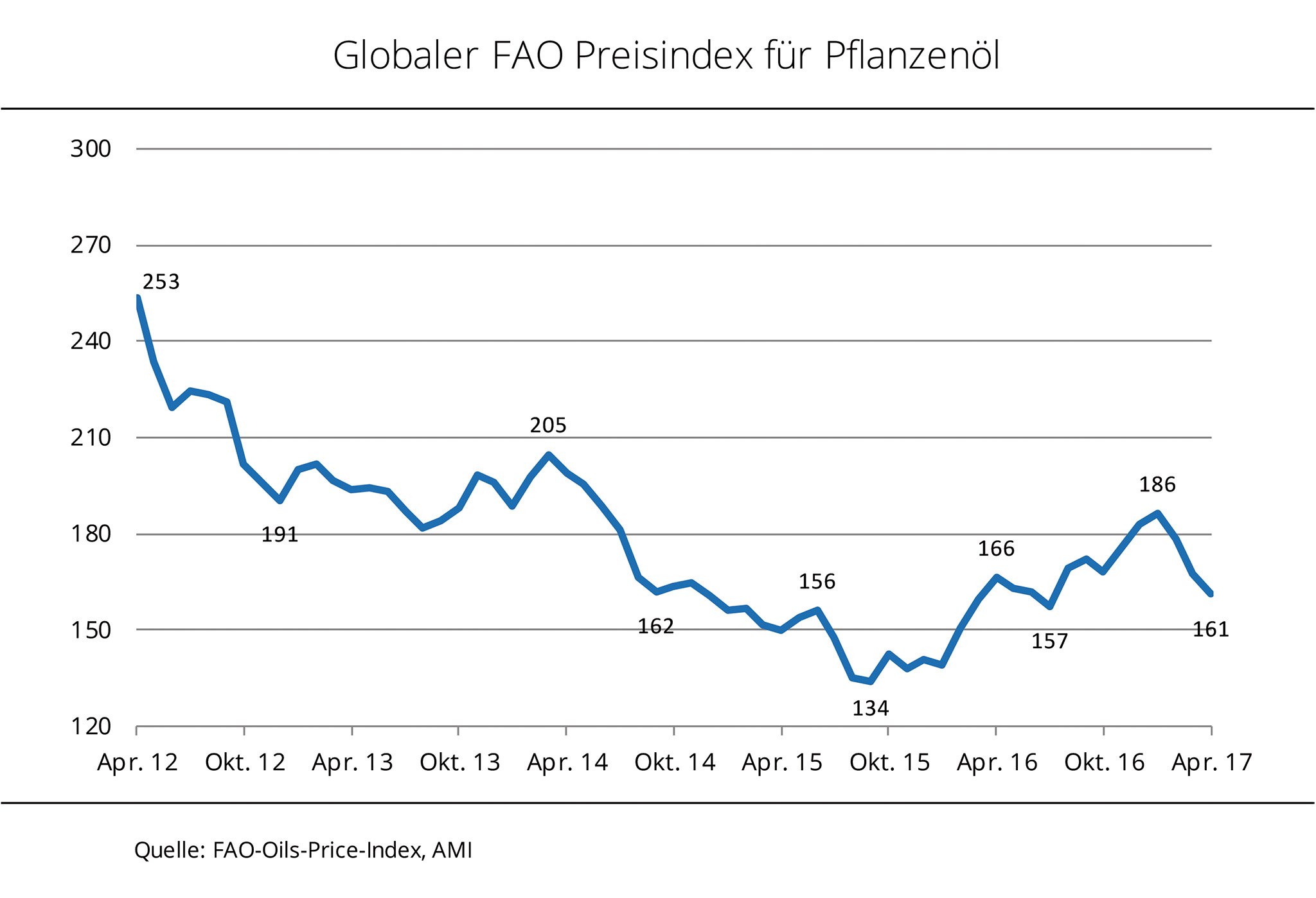 Der Pflanzenölindex der Ernährungs- und Landwirtschaftsorganisation der Vereinten Nationen (FAO) ist im April 2017 um rund 4 % auf ein 9-Monatstief gefallen. Die Preise für Palm- und Sojaöl sind besonders stark zurückgegangen. Die Preise für Pflanzenöle haben sich im ersten Halbjahr 2017 deutlich schwächer entwickelt. Während der FAO Pflanzenölindex, der die Preisentwicklung der 10 für den Welthandel bedeutendsten Pflanzenöle abbildet, zu Jahresbeginn noch den höchsten Stand seit Juli 2014 erreichte, kam es in den folgenden Monaten zu einem deutlichen Einbruch. Für April 2017 weist der Pflanzenölindex einen Rückgang gegenüber dem Vormonat von knapp 4 % auf und fällt damit auf den tiefsten Stand seit neun Monaten. Nach Angaben der Agrarmarkt Informationsgesellschaft mbH (AMI) belasteten besonders die schwächeren Forderungen für Palm- und Sojaöl den Sektor. Produktionssteigerungen auf den Ölpalmenplantagen in Südost-Asien trafen auf eine rückläufige Nachfrage und setzten die Preise unter Druck. Die Forderungen für Sojaöl litten ebenfalls unter der globalen Überversorgung. Rekordsojaernten in Südamerika und die absehbare Rekordanbaufläche in den USA deckeln die Preisentwicklung nach oben.
