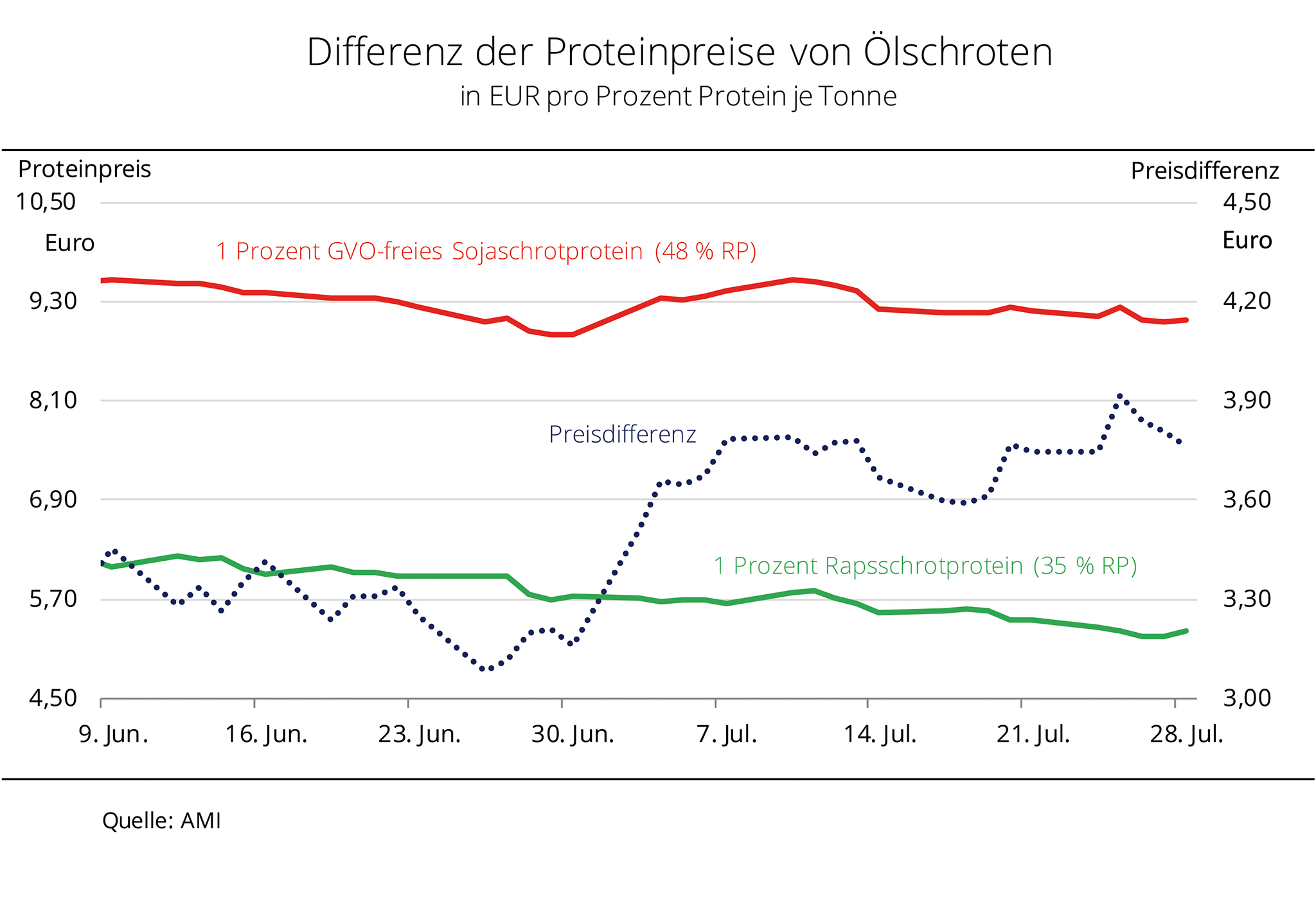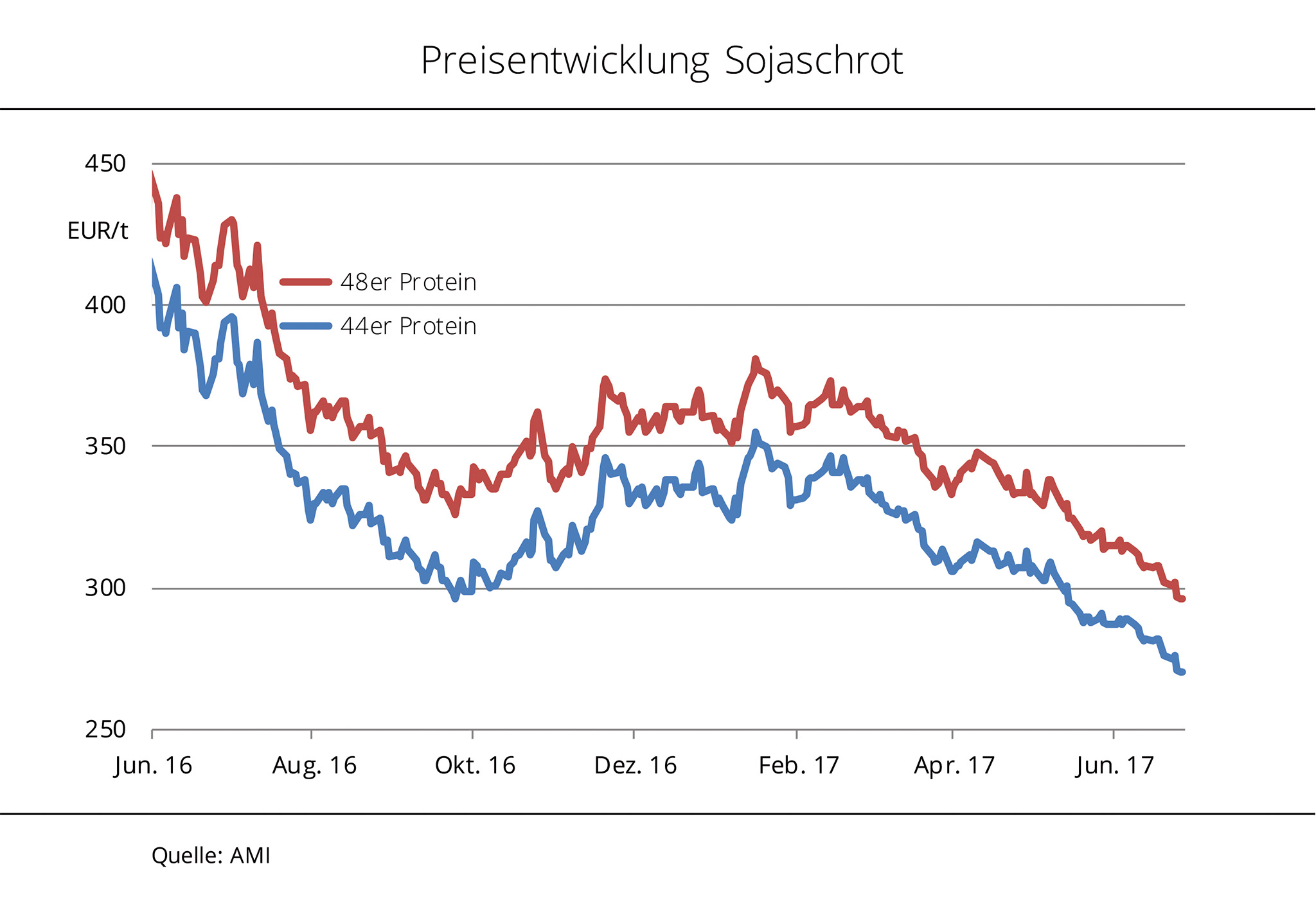 Mit den schwächeren Preisen für Rapsschrot hat sich der Preisvorteil gegenüber GVO-freiem Sojaschrot im Mischfutter deutlich erhöht. Die Großhandelspreise für Rapsschrot sind in den vergangenen Wochen kräftig gesunken. Um fast 13 % haben die Forderungen nachgegeben und bewegten sich zuletzt auf dem Niveau von 186 EUR/t ab Werk. Gründe für den Preisrückgang sind nach Angaben der Agrarmarkt Informations-Gesellschaft mbH (AMI) das steigende Angebot aus der neuen Ernte sowie die nachlassenden Rohstoffkurse. Gleichzeitig haben sich die Forderungen für GVO-freies brasilianisches Sojaschrot mit 48 % Rohprotein im Vergleichszeitraum besser behauptet. Zwar haben die Preise ebenfalls nachgegeben, mit 442 EUR/t fot (Free on Truck) Brake mussten Käufer allerdings nur 3,5 % weniger bezahlen als Anfang Juni 2017. Damit ist Rapsschrot deutlich konkurrenzfähiger. Der Preisabstand von 1 % Rohprotein im Rapsschrot zu 1 % Rohprotein in GVO-freiem Sojaschrot hat jüngst sogar die Linie von 3,90 EUR/t erreicht, das war zuletzt Mitte Mai 2017 der Fall.