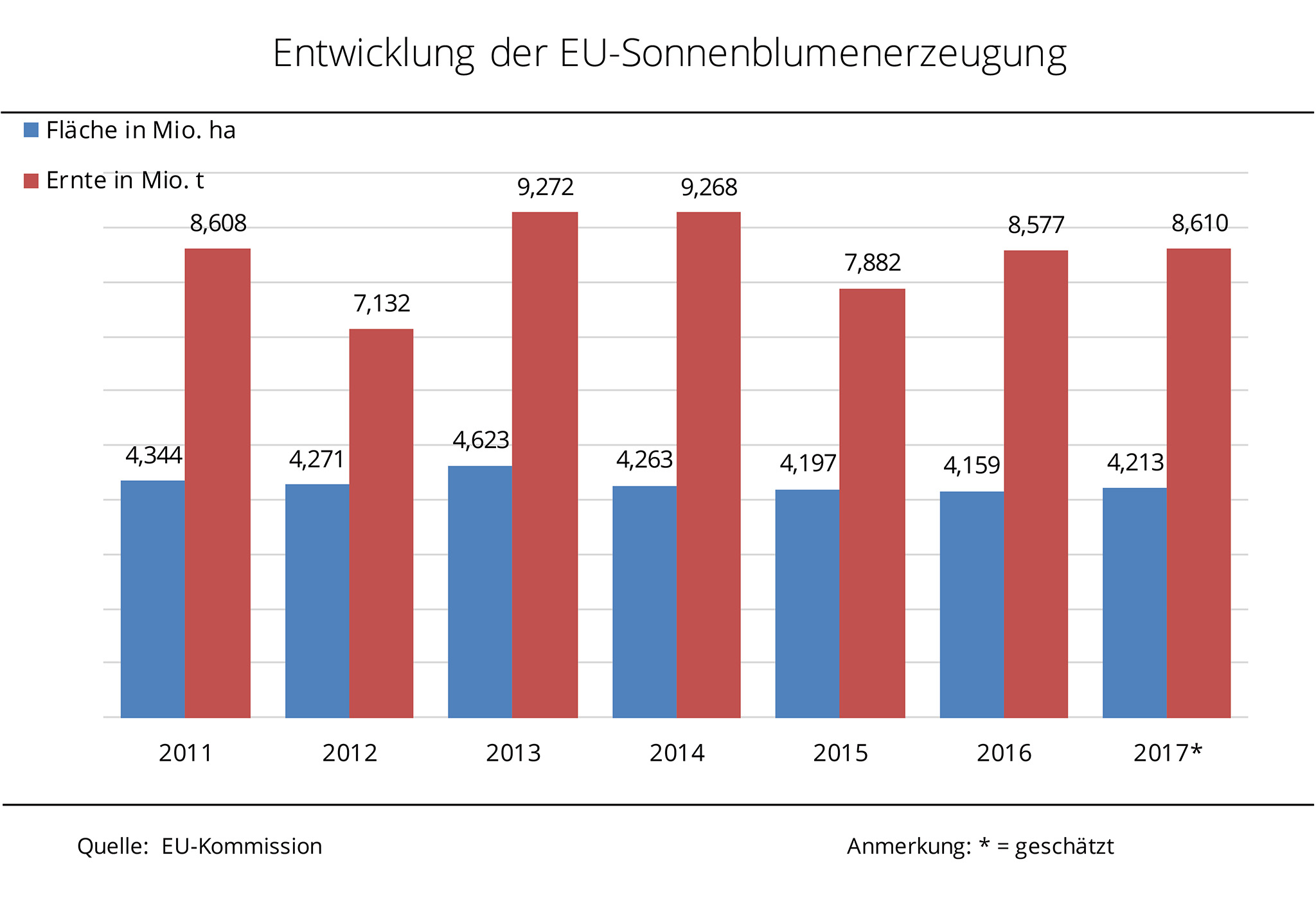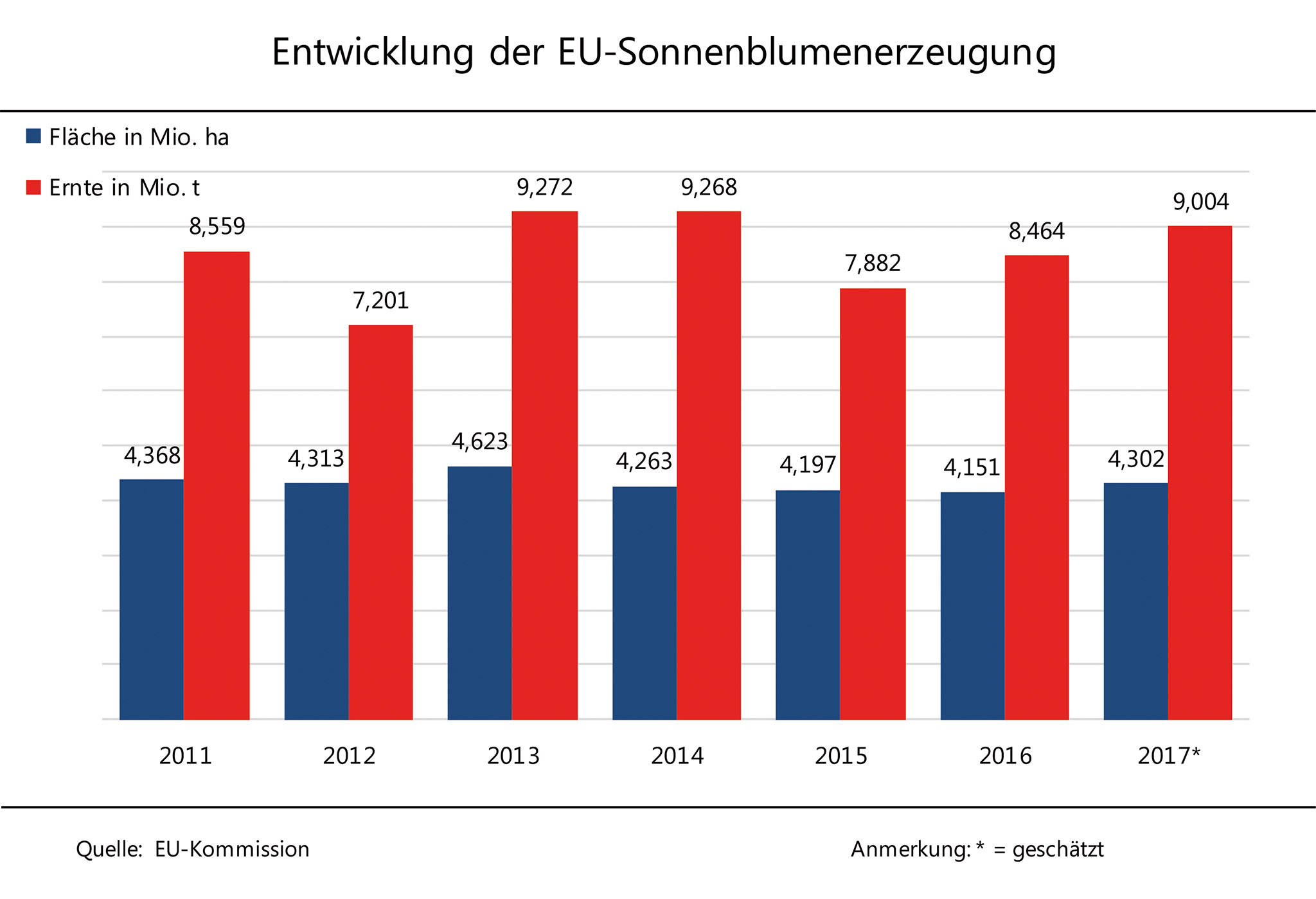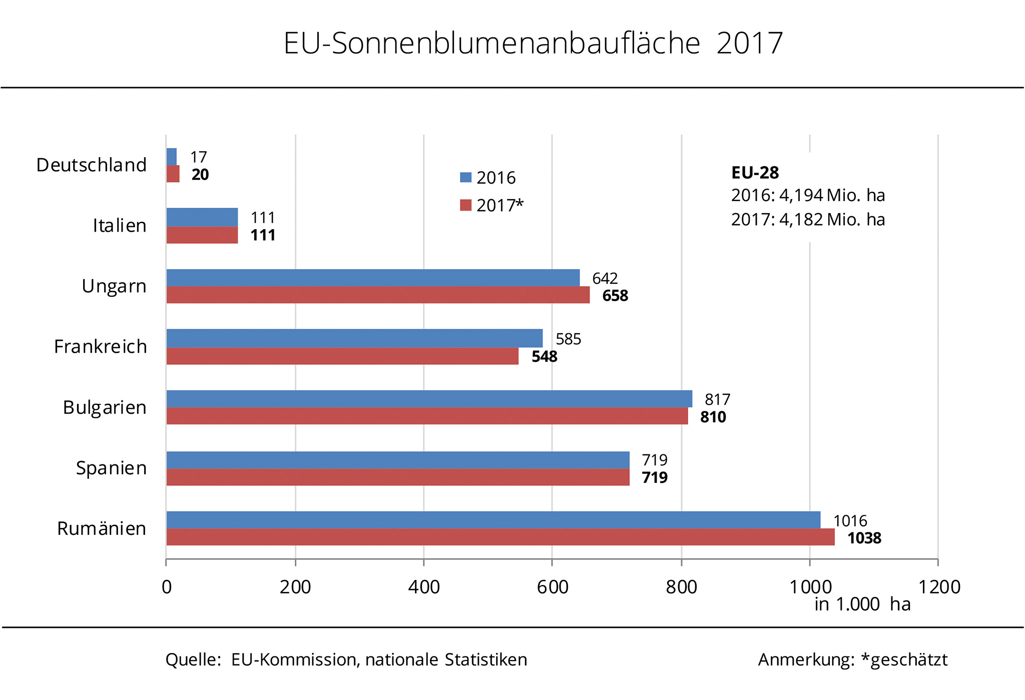 Trotz leicht rückläufiger Anbaufläche rechnet die EU-Kommission mit einem Anstieg der Erzeugung von Sonnenblumenkernen. Besonders in Rumänien und Bulgarien werden höhere Erträge erwartet. Nach aktuellen Zahlen der EU-Kommission ist die Anbaufläche von Sonnenblumen 2017 in der EU-28 auf 4,2 Mio. ha gesunken und liegt damit leicht unter dem Vorjahresniveau. Während Rumänien und Ungarn ihre Aussaatfläche um jeweils rund 2 % ausgedehnt haben, wurden in Bulgarien und in Frankreich weniger angebaut. Dennoch erwartet die EU-Kommission einen Anstieg der Sonnenblumenernte. Mit 9 Mio. t sind es zwar 1 % weniger als noch im Mai prognostiziert wurde, aber immer noch 5 % mehr als 2016. Nach Angaben der Agrarmarkt Informations-Gesellschaft mbH (AMI) sind es vor allem die höheren Ertragserwartungen, aus denen das avisierte Ernteplus resultiert. Für Rumänien und Bulgarien wird mit einem Zuwachs gegenüber Vorjahr von mehr als 15 % gerechnet, die spanische Ernte dürfte rund 11 % zulegen.