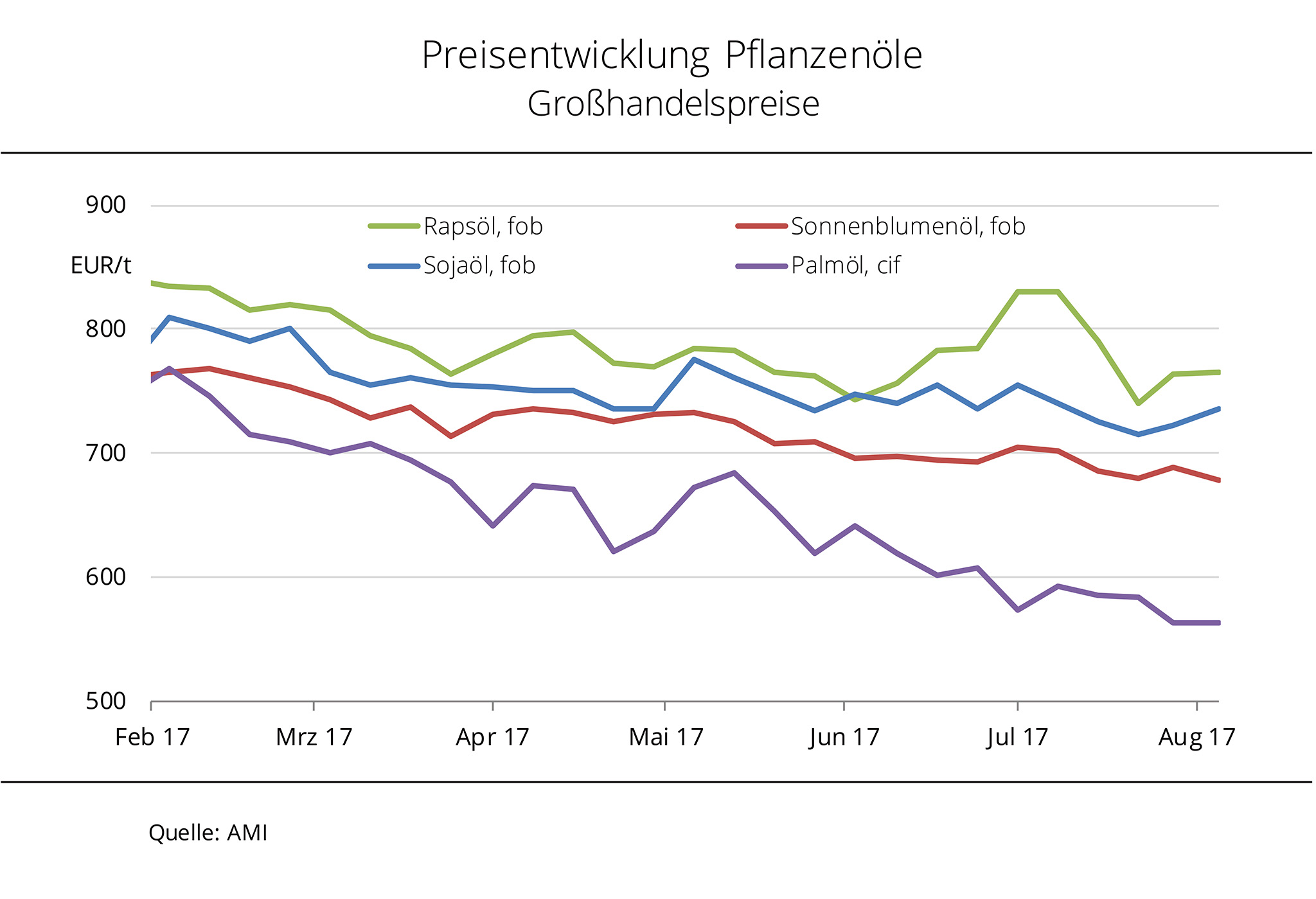 Die Pflanzenölpreise am europäischen Kassamarkt entwickeln sich auseinander. Während Rapsöl fester tendiert, hat Plamöl kräftig nachgegeben. Die Tendenzen für die kommenden Wochen sind uneinheitlich. Die Preise für Raps-, Soja- und Sonnenblumenöl haben sich weiter auseinander bewegt. Während Palmöl aufgrund des reichlichen Rohstoffangebotes anhaltend schwach tendiert, zeigt die Preiskurve für Rapsöl zuletzt wieder nach oben. Nach Angaben der Agrarmarkt Informations-Gesellschaft mbH (AMI) gestaltet sich die Preisfindung bei Rapsöl allerdings schwierig. Heterogene Ertrags- und Qualitätsergebnisse erschweren den Rapseinkauf der Ölmühlen in der noch laufenden Ernte 2017. Zudem halten sich Käufer auf dem aktuellen Preisniveau zurück und fragen kaum Rapsöl nach. In den kommenden Monaten könnte die Versorgung aufgrund der kleiner als erwartenden EU-Rapserzeugung zunehmend teurer werden und den tendenziellen Anstieg der Rapsölpreise verstetigen. Der Sojaölpreis dürfte auch im August durch den Wettermarkt in den USA volatil bleiben. Sonnenblumenöl gibt hingegen unter dem beginnenden Erntedruck leicht nach.