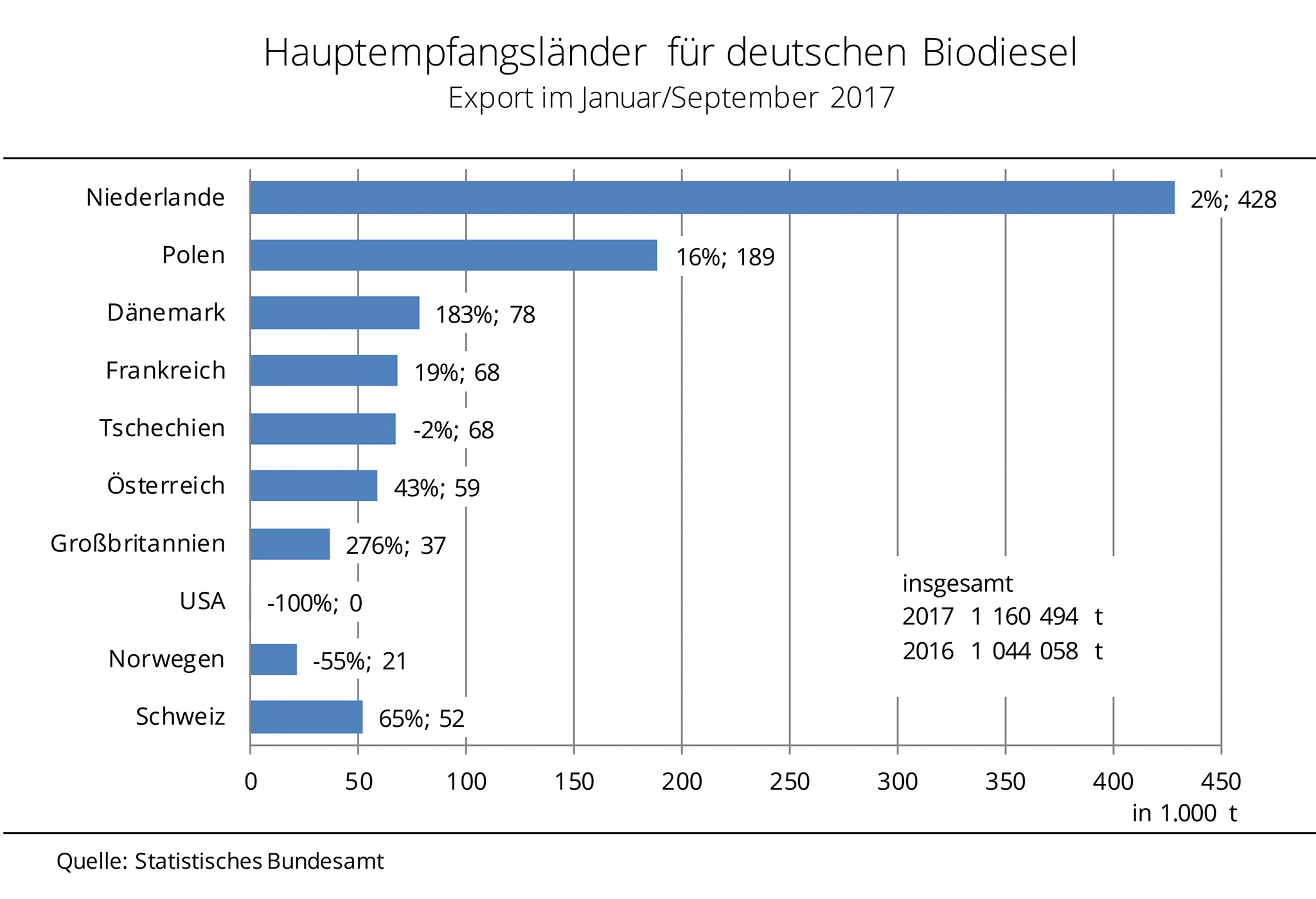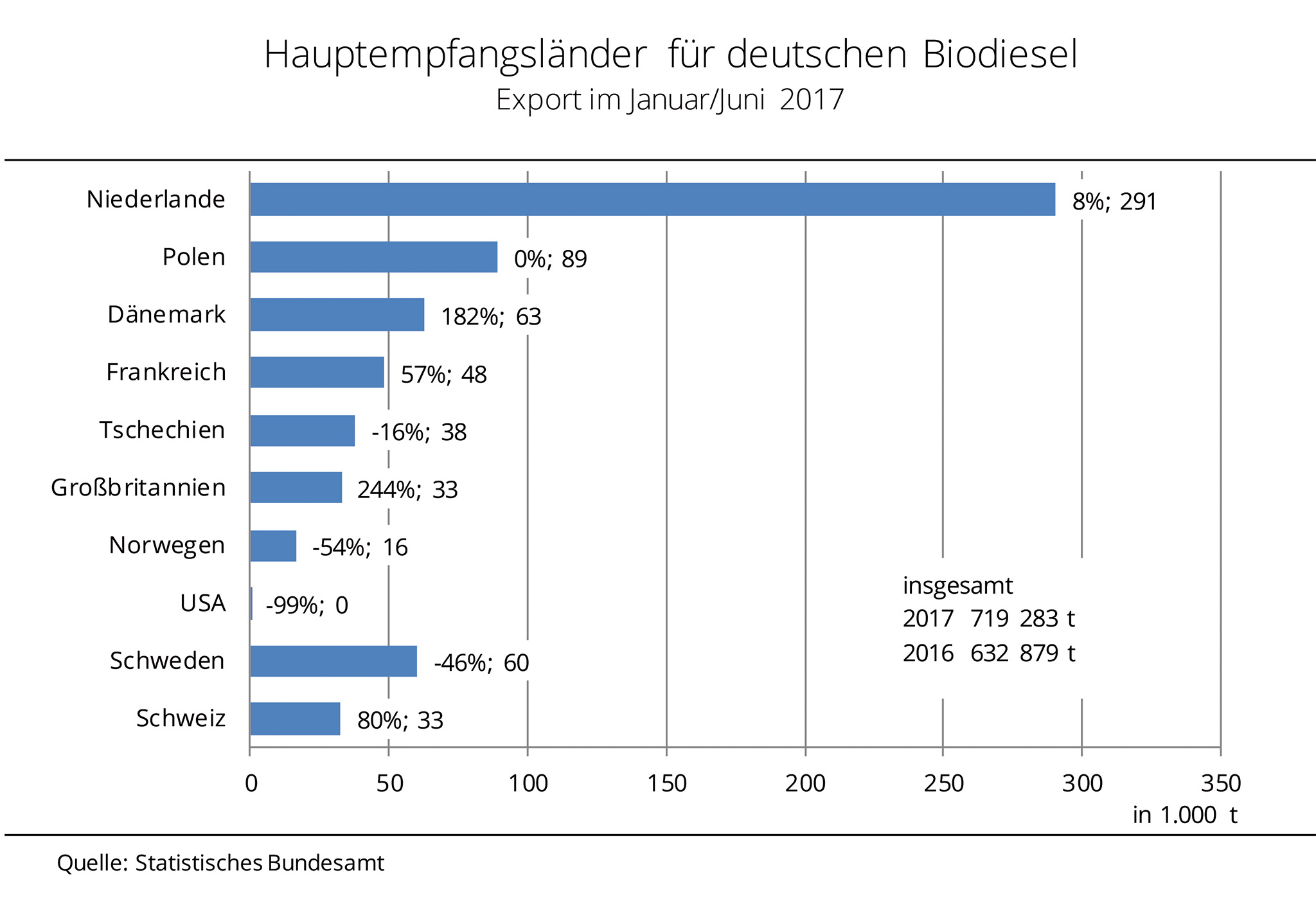Im ersten Halbjahr 2017 stiegen die Biodieselausfuhren gegenüber dem Vergleichszeitraum 2016 um 13,7 % auf 720.000 t. Dabei gingen über 93 % der Ausfuhren in die Länder der EU-28. Wichtigster Abnehmer für deutschen Biodiesel bleiben die Niederlande mit einem Zuwachs von 8 % auf 291.000 t. Polen ist mit einer konstanten Menge von 89.000 t weiterhin zweitgrößter Nachfrager. Nach Angaben der Agrarmarkt Informations-Gesellschaft (mbH) steigerten hingegen viele andere Länder der EU-28 den Import aus Deutschland. Mit 244 % stiegen die Ausfuhren nach Großbritannien am deutlichsten, aber auch Dänemark, die Schweiz und Frankreich importierten deutlich mehr. Mit einem Rückgang auf 61 t kamen die Exporte von deutschem Biodiesel in die USA fast zum Erliegen. Gründe sind eine ausreichende US-Marktversorgung mit Soja und der feste Euro, der Ware aus der EU-28 im Ausland deutlich verteuert. Auch Schweden und Norwegen orderten im Schnitt 50 % weniger.