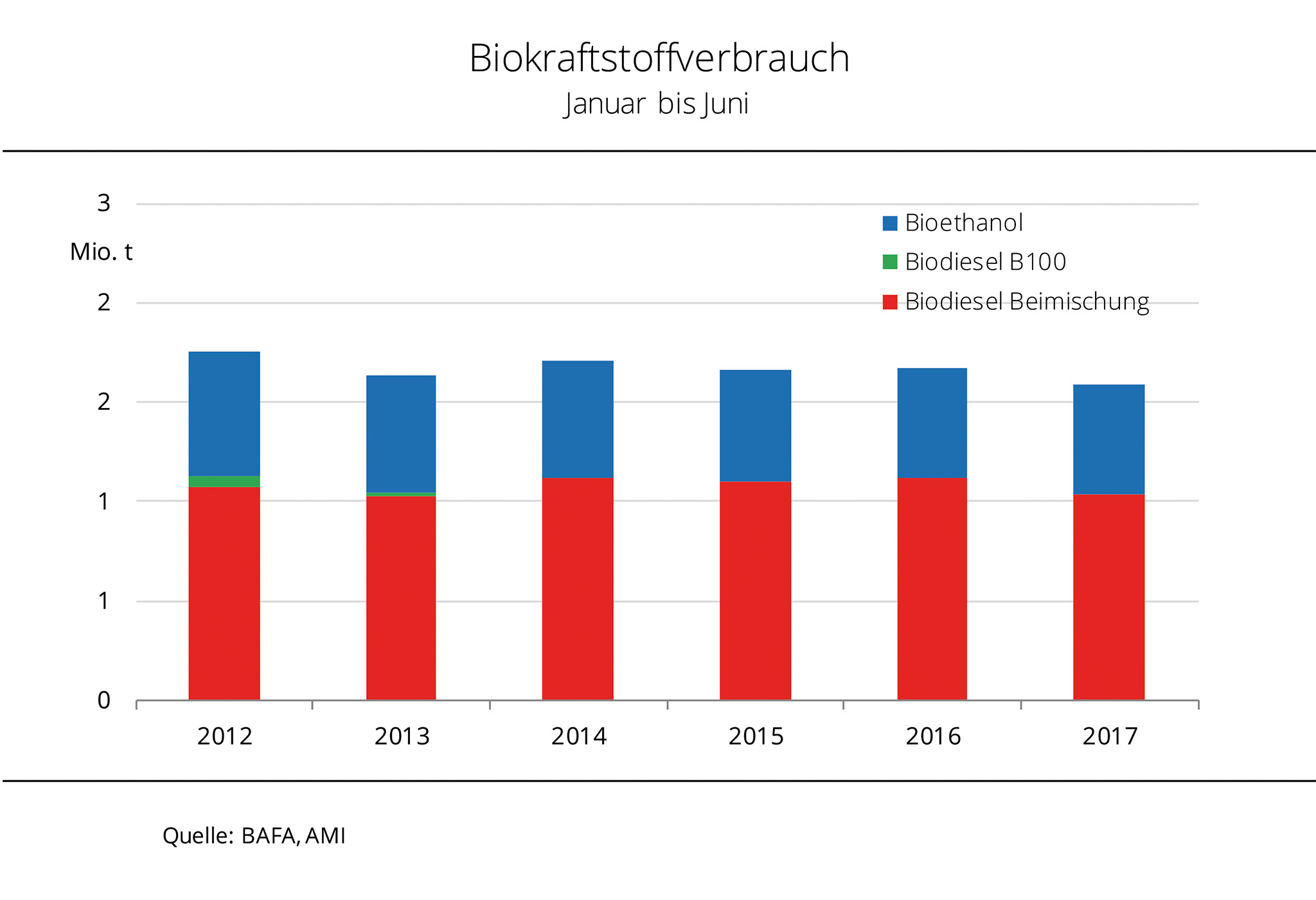 Im Straßenverkehr wurden im ersten Halbjahr 2017 mehr Diesel und Ottokraftstoff verbraucht als im Vergleichszeitraum 2016. Gleichzeitig ging der Einsatz von Biodiesel zurück, trotz der seit Januar 2017 geltenden höheren THG-Quote. Bioethanol konnte das Vorjahresniveau knapp behaupten.Mit über 206.000 t wurde im März 2017 die stärkste Nachfrage nach Biodiesel der vergangenen 6 Monaten registriert, immerhin die größte Menge seit Juli 2014. Allerdings war der Verbrauch in den Monaten zuvor besonders niedrig gewesen. Daher sank der Inlandsverbrauch an Biodiesel von Januar bis Juni 2017 auf 1,4 Mio. t. Das waren 7 % weniger als im Vorjahreszeitraum. Da der Dieselverbrauch gleichzeitig um 5,3 % auf 18,06 Mio. t zugenommen hat, verringerte sich der Beimischungsanteil deutlich. Waren es 2016 rund 6,1 %, errechnete die Agrarmarkt Informations-Gesellschaft mbh (AMI) für 2017 noch 5,4 %. Auch Bioethanol verzeichnet nach Daten der BAFA einen schwindenden Beimischungsanteil, der im ersten Halbjahr 2017 rund 6 % erreichte und damit die 6,3 % des Vorjahreszeitraumes verfehlte. Und dies, obwohl die von der Mineralölwirtschaft zu erfüllende Treibhausgas-Minderungspflicht im Januar 2017 von 3,5 auf 4 Prozent angehoben wurde. Ursache für den Rückgang bei Bioethanol und Biodiesel ist die mit durchschnittlich 71,5 Prozent deutlich verbesserte Treibhausgasbilanz der verwendeten Biokraftstoffe. Dies ist das Ergebnis der Auswertung der Nachhaltigkeitsnachweise durch die Bundesanstalt für Landwirtschaft und Ernährung (BLE).