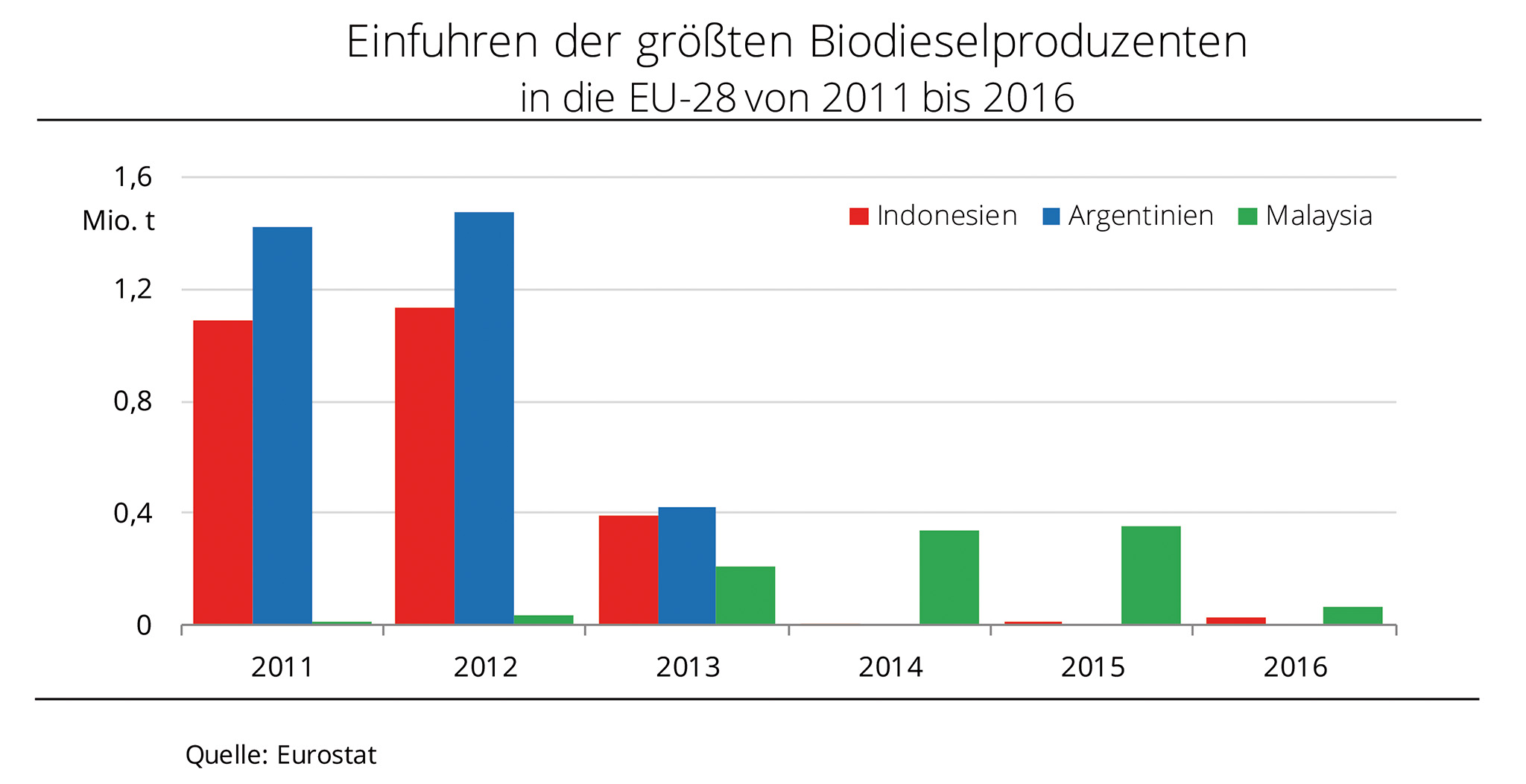 Nach der beschlossenen Absenkung der Importzölle auf argentinischen Biodiesel dürften die Einfuhren in die EU-28 kräftig zunehmen und für erhebliche Marktverschiebungen sorgen. Die Einfuhren der drei größten Biodieselexporteure Argentinien, Indonesien und Malaysia in die EU-28 haben sich seit 2013 deutlich rückläufig entwickelt. Während Argentinien 2012 noch 1,48 Mio. t Biodiesel aus Sojaöl und Indonesien 1,09 Mio. t aus Palmöl in die EU-28 exportierten, schrumpften die Lieferungen im Folgejahr um jeweils rund 70 %. Grund für den Einbruch war die Festsetzung von Importzöllen. Beide Länder haben nach Ansicht des europäischen Rates ihre Ware durch künstlich niedrig gehaltene Rohstoffpreise unter dem EU-Marktwert angeboten. Daher wurde auf argentinischen Biodiesel ein Zollsatz von 24,6 % und auf indonesische Ware von 18,9 % verhängt, was die Biodiesellieferungen beider Länder fast vollständig einbrechen ließ. Nach Angaben der Agrarmarkt Informations-Gesellschaft mbH (AMI) dürfte die von der EU-Kommission jüngst erlassene Absenkung der Importzölle auf argentinischen Biodiesel (von 22 bis 25,7 % auf 4,5 bis 8,1 %) zu einem kräftigen Wiederanstieg der argentinischen Lieferungen führen. Sollten die Zollsätze auf indonesischen Biodiesel infolge der noch ausstehenden Entscheidung ebenfalls gesenkt werden, dürften zum Frühjahr 2018 erhebliche Mengen auf den Markt der EU-28 strömen und die Preise sowie die Konkurrenzfähigkeit von europäischem Biodiesel aus Rapsöl unter Druck setzen.