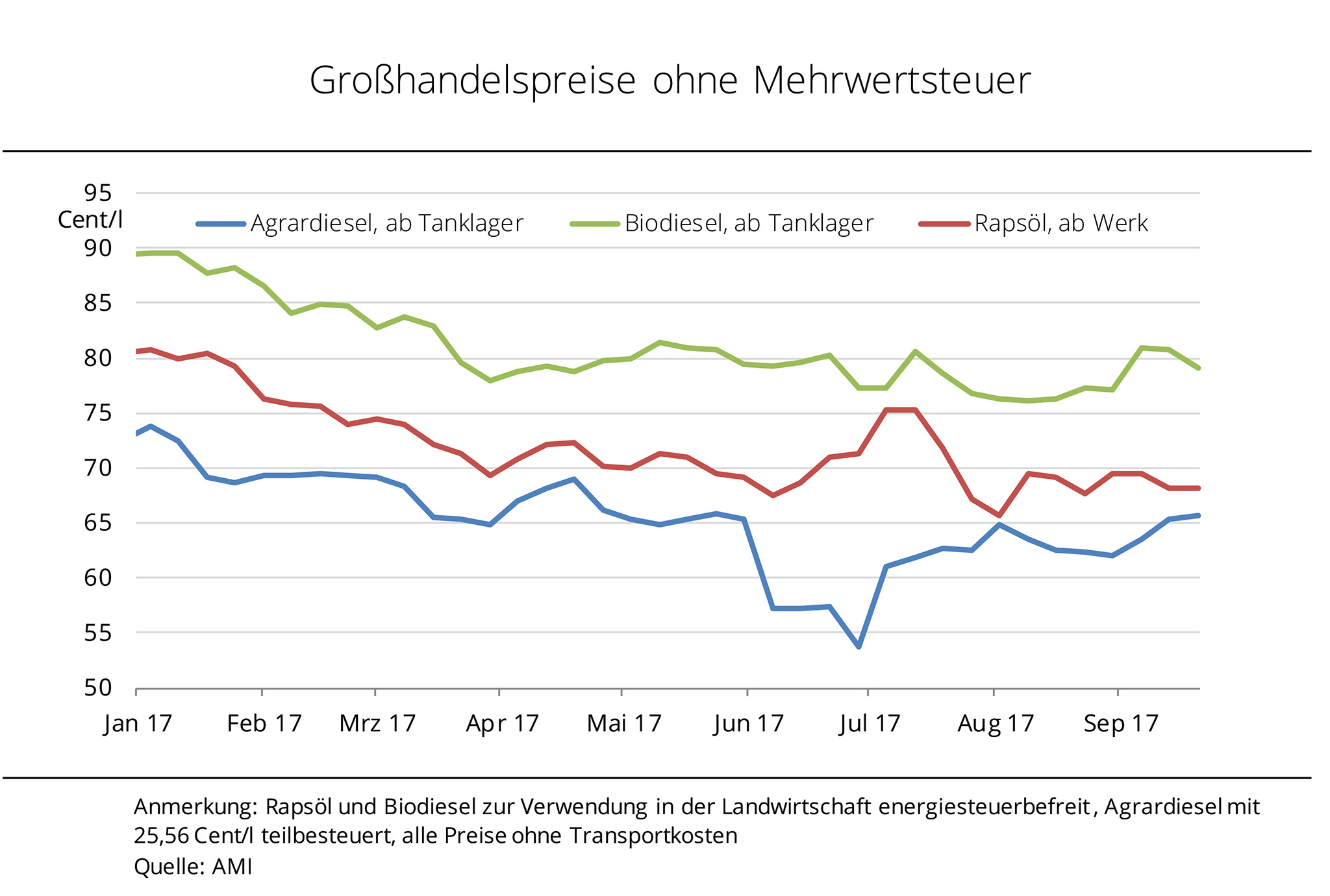 Die Großhandelspreise für Agrardiesel und Biodiesel sind seit August deutlich gestiegen; Rapsöl tendiert hingegen schwächer. Der Agrardiesel bleibt, trotz Preisanstieg, weiterhin die preisgünstigste Alternative. Seit Anfang des Jahres haben sich die Großhandelspreise für Agrar-, Biodiesel und Rapsöl deutlich schwächer entwickelt. Agrardiesel wurde zur Jahresmitte rund ein Drittel unter dem Niveau von Januar 2017 gehandelt. Mit den steigenden Rohstoffkosten der Hersteller, haben sich die Forderungen für Agrar- und Biodiesel wieder befestigt, denn die WTI-Rohölnotierungen legten seit Ende Juni um rund 19 % zu. Der Preis für Standardware Biodiesel, mit einem Treibhausgas-Einsparpotenzial gegenüber fossilem Kraftstoff von rund 60 %, lag zuletzt bei 79 Cent/l. Das entspricht nach Angaben der Agrarmarkt Informations-Gesellschaft mbH (AMI) einem Plus gegenüber dem Vorjahreszeitpunkt von fast 3 %. Der Preisabstand gegenüber Agrardiesel vergrößert sich damit auf mehr als 13 Cent/l. Demgegenüber sank der Rapsölpreis im August auf ein Jahrestief. Mit der im Herbst angezogenen Nachfrage der Biodieselindustrie haben sich die Forderungen aber wieder leicht erholt. Rapsöl zur vorderen Lieferung kostete zuletzt rund 68 Ct/l und damit knapp 4 % mehr als zum Jahrestiefpunkt.