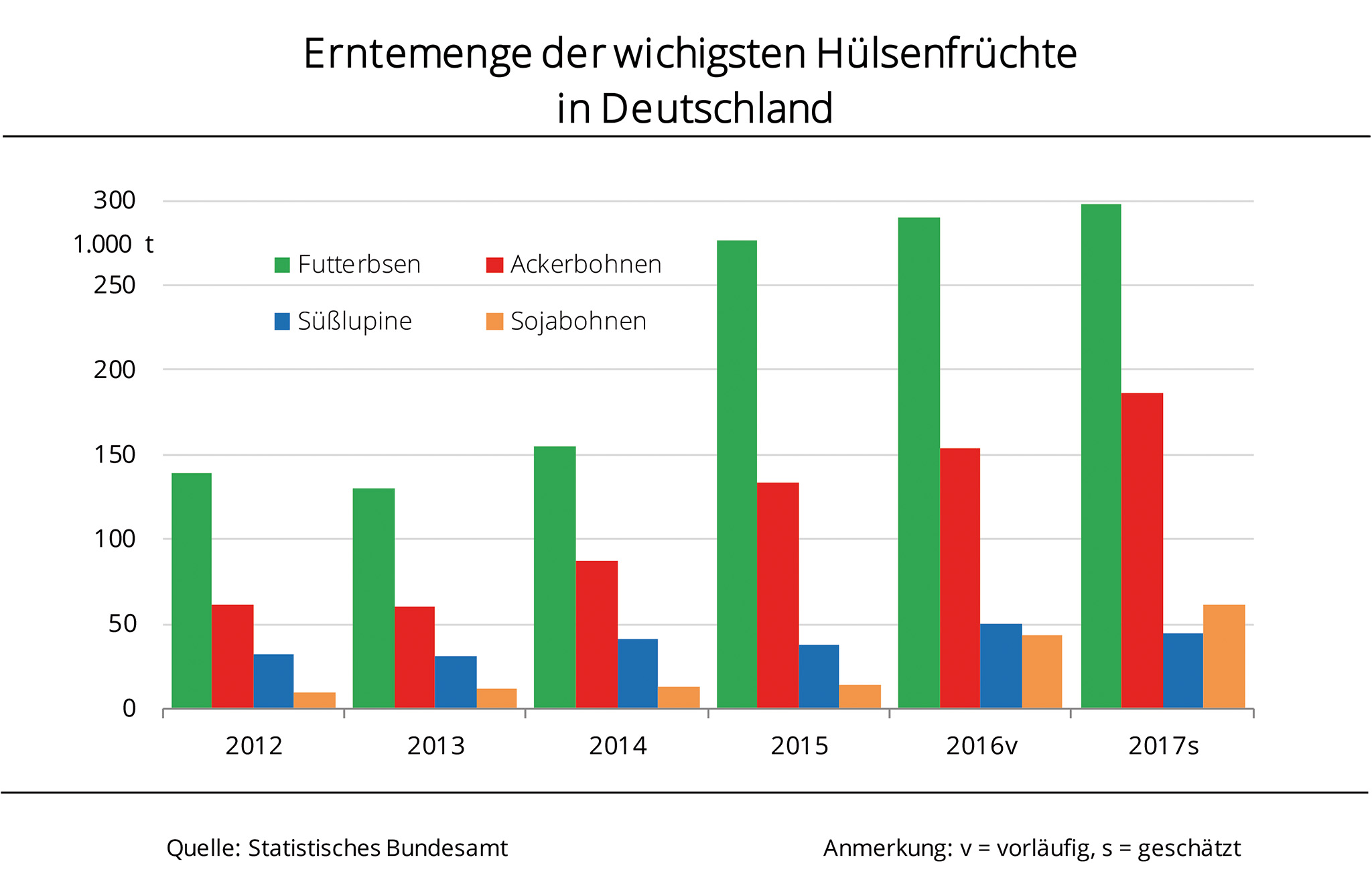 Mit einer Ausweitung der Anbaufläche wurden bereits im Frühjahr die Weichen für eine größere Hülsenfruchternte in Deutschland gestellt. Aber auch die Erträge fielen durchweg höher aus als 2016. Bundesweit wurden die Durchschnittserträge bei Futtererbsen- und Ackerbohnen in der Ernte 2017 deutlich überschritten. Bei den Süßlupinen lagen die Erträge jedoch darunter. Mit 43.600 t wurden 13 % weniger gedroschen als 2016, denn die Hektarerträge schrumpften um 14 %. Demgegenüber verzeichnete die Sojabohnenernte ein Plus von 41 % zum Vorjahr, auch wenn die Menge mit 61.000 t vergleichsweise gering bleibt. Neben der 21 % größeren Erntefläche kommen hier die 16 % höheren Erträge zum Tragen. Futtererbsen wurden nach Schätzung des Statistischen Bundesamtes im Umfang von 298.400 t gedroschen und damit 3 % mehr als 2016. Die 5 % höheren Flächenerträge haben das Anbauminus von 2 % mehr als kompensiert. Die Ackerbohnenernte wird in diesem Jahr ein Erfolg auf ganzer Linie. Nach Angaben der Agrarmarkt Informations-Gesellschaft mbH (AMI) trägt alleine die Anbauflächenentwicklung gegenüber 2016 ein Plus von 20 %. Die Ertragsschätzung liegt bei 40,1 dt/ha und damit nicht nur 1 % über dem Vorjahresergebnis, sondern sogar 5,5 %über dem langjährigen Mittel. Damit würde eine Ernte von 186.100 t eingebracht, 32.400 t mehr als 2016