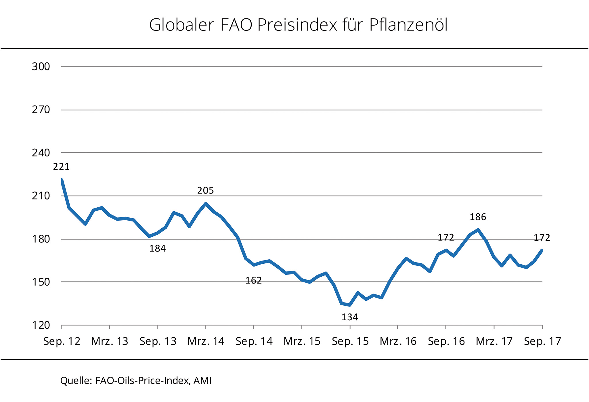 Der Pflanzenölindex der Ernährungs- und Landwirtschaftsorganisation der Vereinten Nationen (FAO) ist im September 2017 auf ein 7-Monatshoch gestiegen. Besonders die festeren Preise für Palm- und Sojaöl haben zu dem Anstieg beigetragen. Die Forderungen für Pflanzenöle haben sich im dritten Quartal 2017 deutlich fester entwickelt. Nachdem der FAO Pflanzenölindex, der die Preisentwicklung der 10 für den Welthandel bedeutendsten Pflanzenöle abbildet, im Juli 2017 auf Jahrestiefstand gefallen war, erholten sich die Preise in den folgenden Monaten. Für September 2017 weist der Pflanzenölindex einen Anstieg gegenüber dem Vormonat von rund 4,5 % auf und erreichte damit ein 7-Monatshoch. Nach Angaben der Agrarmarkt Informationsgesellschaft mbH (AMI) gaben besonders die festeren Forderungen für Palm- und Sojaöl dem Sektor Auftrieb. Die Produktionssteigerungen auf den Ölpalmenplantagen in Südostasien blieben hinter den Erwartungen zurück. Dies sorgte gemeinsam mit einer regen Nachfrage infolge niedriger Lagerbestände in den wichtigsten Importländern für anziehende Palmölpreise. Sojaöl profitierte von der witterungsbedingt verzögerten Sojabohnenaussaat in Südamerika, auch wenn der Preisauftrieb durch die höher als erwartet ausfallende US-Sojaernte 2017 nach oben gedeckelt wurde. Auch die leicht festeren Forderungen für Raps- und Sonnenblumenöl trugen zum Anstieg des Pflanzenölindexes bei.