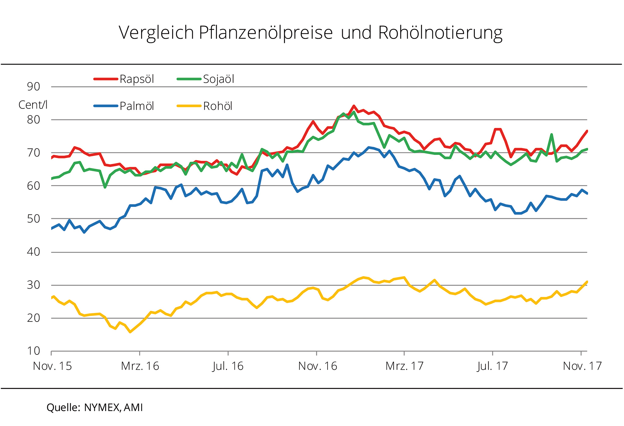 Die Preise für Pflanzenöl haben sich jüngst fester entwickelt. Steigende Nachfrage und schwächerer Eurokurs sorgen für anziehende Forderungen. Nach dem schwächeren Verlauf der Rohölnotierungen im ersten Halbjahr 2017 zeigten die Förderkürzungen der OPEC und politische Krisen im Nahen Osten Wirkung und sorgten für einen Kursanstieg vom Jahrestiefpunkt im Juni 2017 bis dato von 30 %. Die Pflanzölpreise haben diese Entwicklung nur teilweise nachvollzogen. Während Rapsöl sich parallel um 15 % verteuerte, stiegen die Palmölpreise um 14 % und Sojaöl um 6 %. Palmöl profitierte von Produktionssteigerungen, die geringer ausfielen als erwartet wurde. Demgegenüber dämpften nach Angaben der Agrarmarkt Informationsgesellschaft mbH (AMI) die umfangreichen Vorräte für Soja- und Rapsöl in der EU-28 die Preisbefestigung. Die EU-Entscheidung zu Zollsatzsenkungen auf argentinischen Biodiesel hat die Nachfrage zwischenzeitlich gebremst. Zuletzt zeigte die deutsche Biodieselindustrie allerdings vermehrt Interesse, das besonders bei Rapsöl für deutliche Aufgelder sorgt.