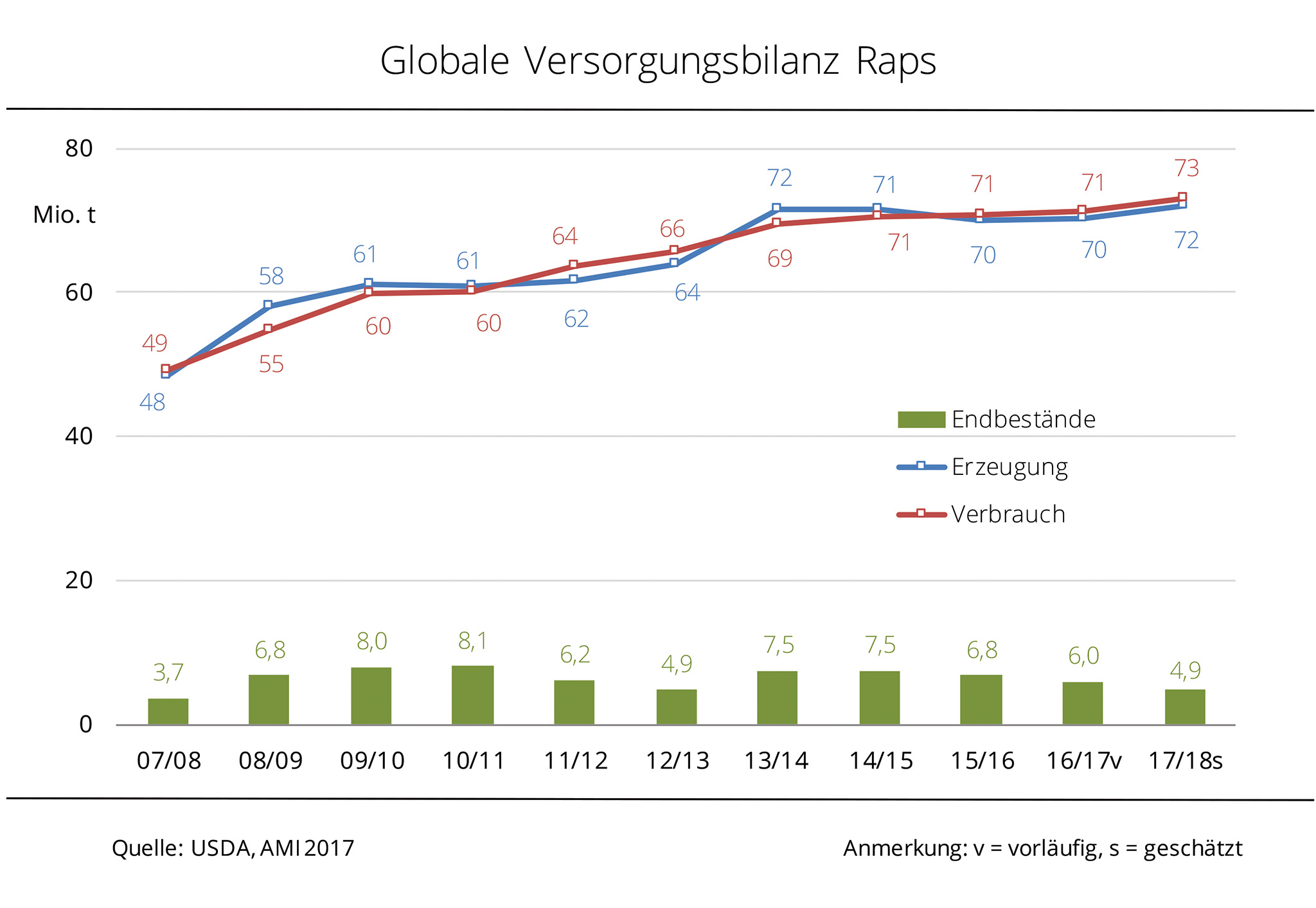 Der weltweite Rapsverbrauch dürfte im Wirtschaftsjahr 2017/18 auf 73,07 Mio. t steigen. Damit wurde die Prognose gegenüber dem Vormonat um 1 % angehoben und liegt somit 2,3 % über Vorjahresniveau. Grund ist nach Angaben der Agrarmarkt Informations-Gesellschaft mbH (AMI) der stetig wachsende Bedarf Chinas, der 2017/18 mit 18,1 Mio. t die Vorjahresmenge um rund 5 % überschreiten dürfte. Die globalen Rapsendbestände fallen so auf 4,9 Mio. t. Das wäre der niedrigste Wert seit fünf Jahren und läge rund 18 % unter Vorjahreslinie.