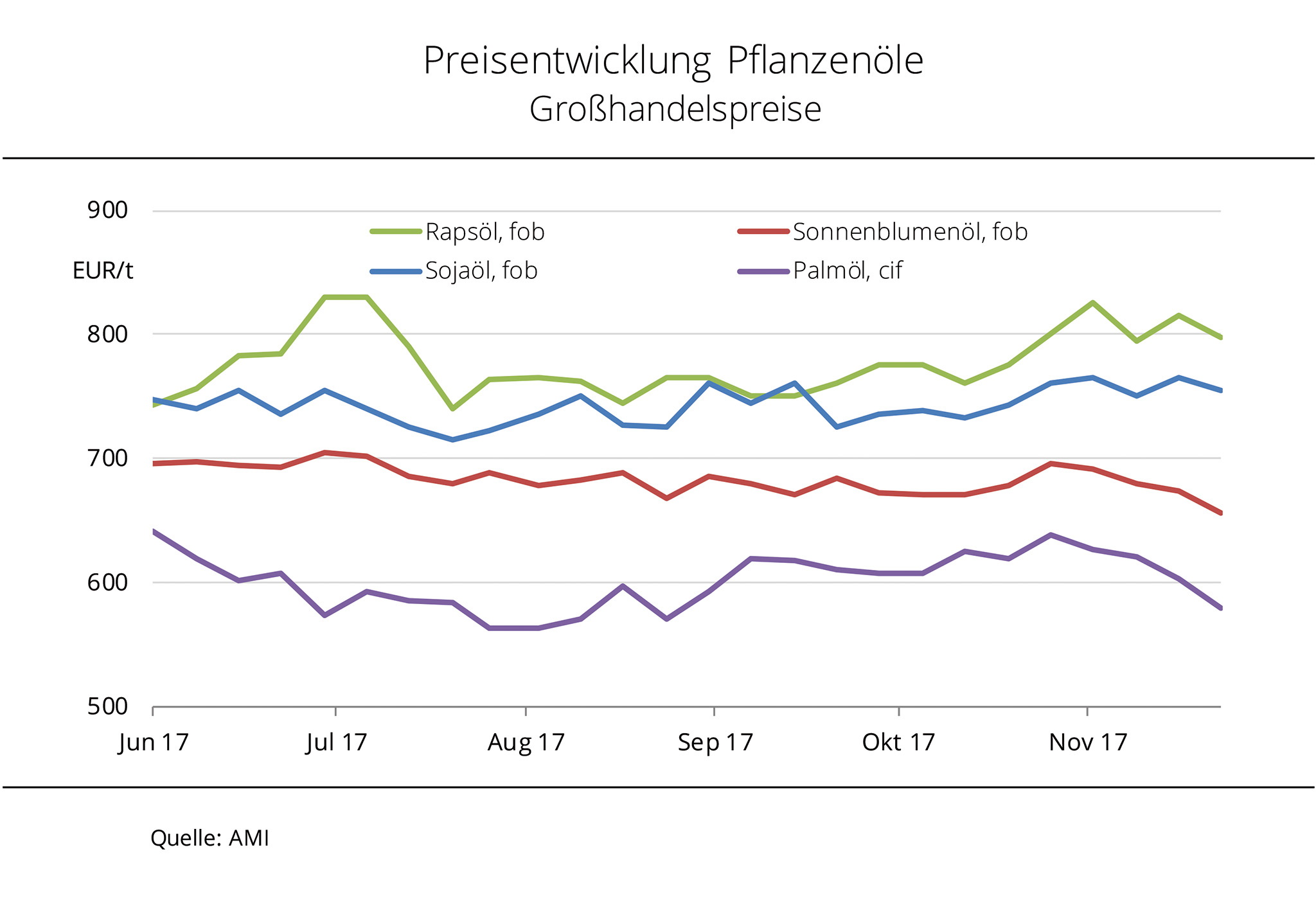 Die Pflanzenölpreise tendieren schwächer, besonders Palmöl verliert kräftig und zieht den Sektor mit nach unten. Die Palmölpreise haben sich in den vergangenen Wochen deutlich schwächer entwickelt. Druck kam vor allem von den Kursen in Kuala Lumpur, die zuletzt auf dem tiefsten Stand seit August 2016 gehandelt wurden. Rückläufige Exporte, verhaltene Nachfrage, steigende Produktions- und Lagermengen sowie jüngst eingeführte indische Importzölle haben die Kurse einbrechen lassen und belasten alle Pflanzenölpreise. Bei Sonnenblumenöl übt die üppige Ernte auf der Nordhalbkugel zusätzlichen Druck aus. Darüber hinaus sorgt der festere Euro für eine währungsbedingte Vergünstigung von Importware. Rapsöl konnte Anfang November von der verspäteten, aber saisontypischen Herbstnachfrage der Biodieselindustrie profitieren, geriet aber auch in den Abwärtssog der Palmölpreise. Gleiches gilt für Sojaöl, das zwar Anfang Oktober 2017 aufgrund der deutlich anziehenden US-Inlandsnachfrage infolge der US-Importzölle auf Biodieselimporte aus Argentinien an Wert zulegen konnte. Dieser Effekt hat den Preis für Sojaöl nicht nachhaltig stabilisieren können, weil die amerikanische Umweltbehörde (EPA) die Biodieselbeimischung für 2018 kürzlich bei 2,1 Mrd. Gallonen (ca. 7 Mio. t) belassen hat. Die bisher in den USA abgesetzten Biodieselmengen aus Argentinien suchen jetzt einen neuen Markt, z.B. in der EU. Die EU-Kommission hatte die Antidumpingzölle im September reduziert und damit dieser Exportoption den Weg freigemacht.