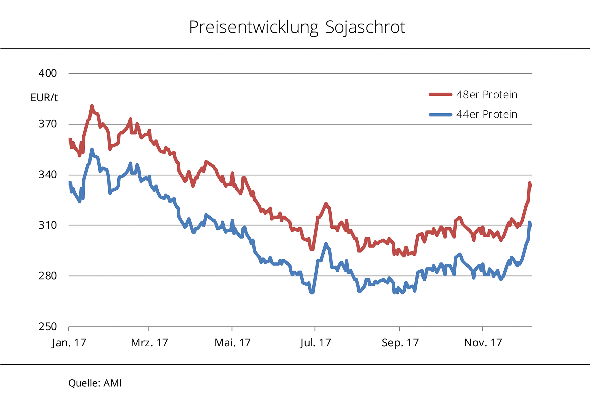 Die Preise für konventionelles Sojaschrot haben sich Ende November 2017 deutlich befestigt. Trockenheit in Argentinien schürt Sorgen vor Ertragseinbußen bei den Sojabohnen und infolgedessen rückläufiger Verarbeitung. Die Forderungen für Sojaschrot haben sich nach den kräftigen Rückgängen in den ersten drei Quartalen 2017 wieder deutlich befestigt. Seit den Jahrestiefstständen Anfang September 2017 hat 48er Sojaschrot rund 14 % auf 333 EUR/t und 44er Ware sogar um 15 % auf 310 EUR/t zugelegt. Damit liegen die Preise für beide Schrotqualitäten aber immer noch knapp 13 % unter den Jahreshöchstständen von Mitte Januar. Nach dem deutlichen Rückgang des Preisniveaus in den ersten acht Monaten 2017 hatte sich eine längere Phase der Konsolidierung angeschlossen, in der die üppige globale Versorgung die Preisentwicklung nach oben limitierte. Grund für den plötzlichen Anstieg in den vergangenen Wochen ist nach Angaben der Agrarmarkt Informationsgesellschaft mbH (AMI) die Trockenheit in Argentinien. Von dort wird weltweit das meiste Sojaschrot exportiert. Die derzeit fehlende Bodenfeuchte verzögert die Sojabohnenaussaat und bremst den Vegetationsverlauf. Ob der Preisanstieg nachhaltig ist, wird sich in den kommenden Wochen zeigen. Momentan sind erst 50 % der Anbaufläche bestellt.