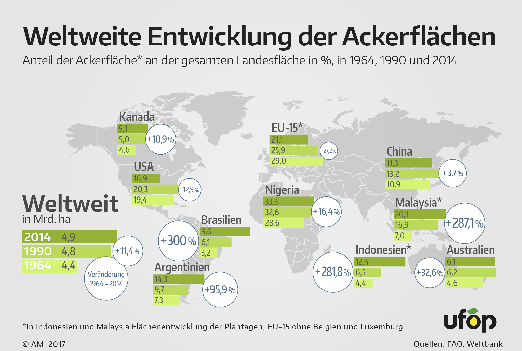 Die stetig wachsende Bevölkerung und wohlstandsbedingte Änderungen der Ernährungsgewohnheiten sind die Treiber für die Intensivierung und Steigerung der landwirtschaftlichen Erzeugung. Ein Großteil des Mengenzuwachses ist allerdings auf die Ausdehnung und damit auf direkte Landnutzungsänderungen, vor allem auf der Südhalbkugel, zurückzuführen, stellt die Union zur Förderung von Oel- und Proteinpflanzen (UFOP) unter Hinweis auf Angaben der Ernährungs- und Landwirtschaftsorganisation der Vereinen Nationen (FAO) fest. Die Sojaanbaufläche in Südamerika wird nach wie vor ebenso ausgedehnt wie die Palmölplantagen in Südostasien, insbesondere in Indonesien.