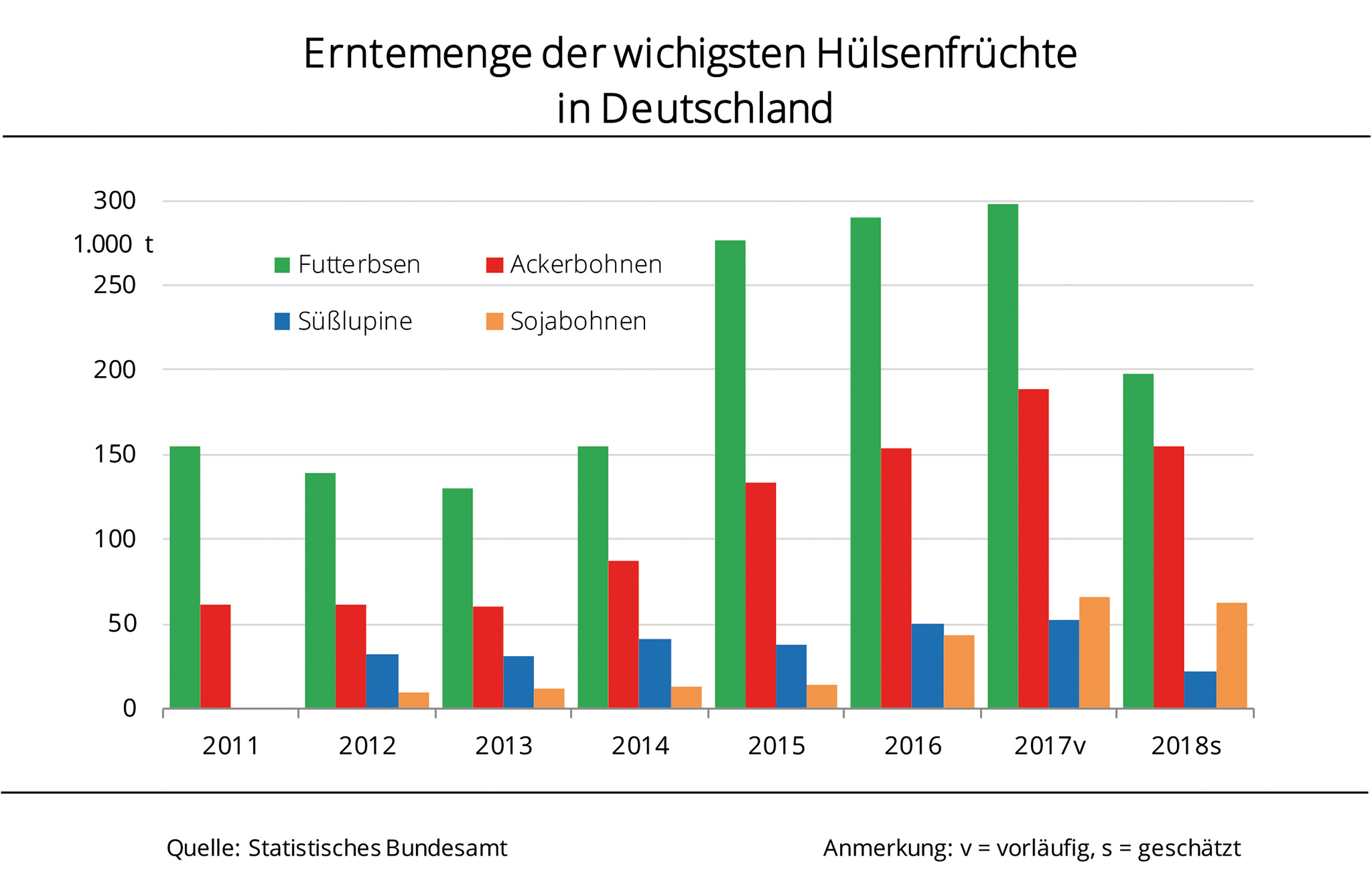 Schon mit der etwas geringeren Anbaufläche wurden bereits im Frühjahr die Weichen für eine kleinere Leguminosenernte 2018 in Deutschland gestellt. Hinzu kam noch ein massiver Einbruch der Erträge, wie bei anderen Fruchtarten bedingt durch die lang anhaltende Trockenheit.