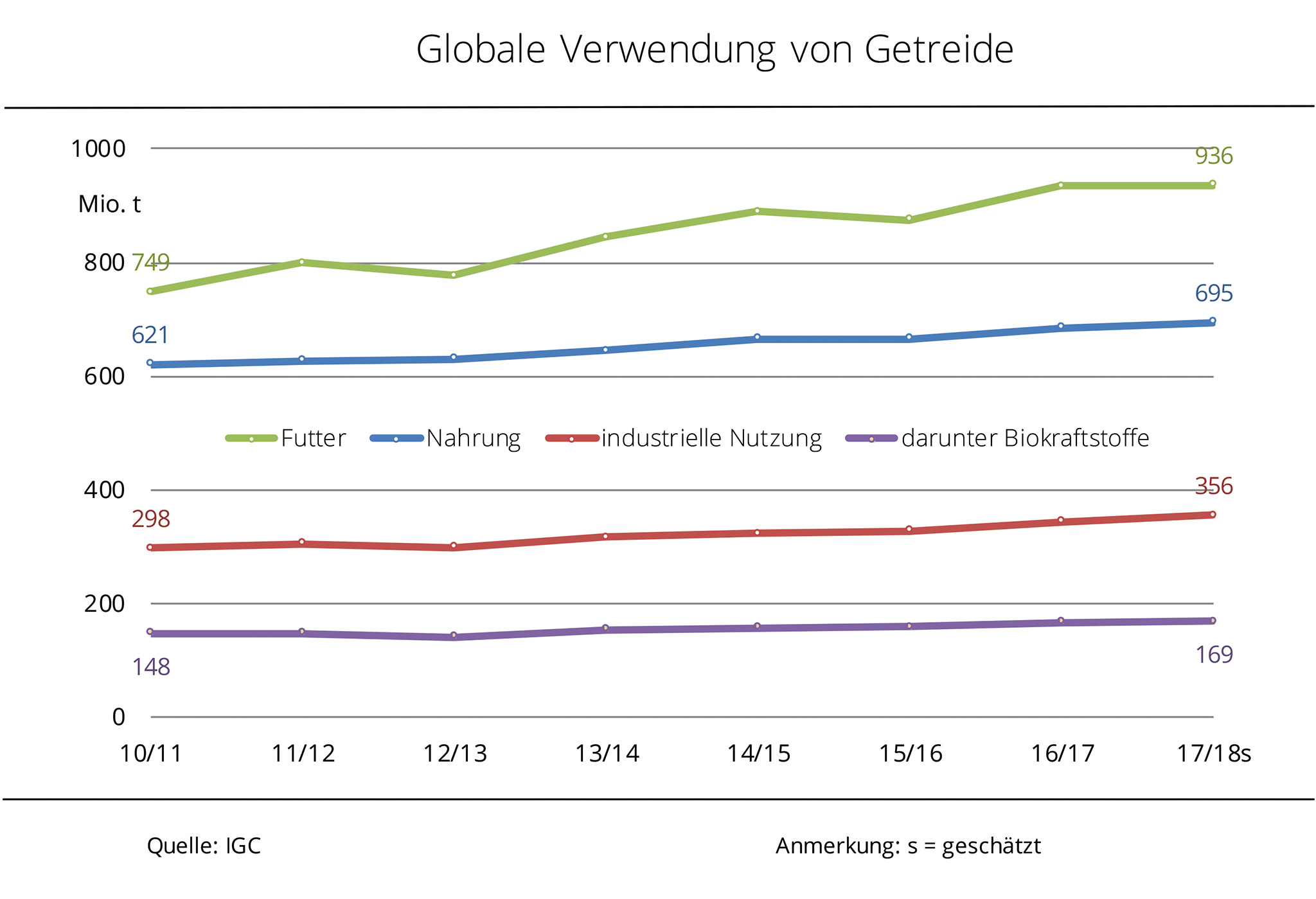 Weltweit wurden im Wirtschaftsjahr 2017/18 schätzungsweise 2,1 Mrd. t Getreide erzeugt. Es dient nicht nur zu Nahrungszwecken, sondern auch als Futtermittel oder als Rohstoff für die Erzeugung von Bioethanol. Mit einem Anteil von 44 % wandert der Großteil der Getreideernten in den Futtertrog und das mit steigender Tendenz. Dagegen nimmt die Nachfrage nach Getreide zur Kraftstoffherstellung nur in geringem Maße zu und hält sich nach Angaben des Internationalen Getreiderats (IGC) seit Jahren bei rund 8 %. Somit steht ausreichend Getreide für den wachsenden Bedarf an Nahrungs- und Futtermitteln und für die industrielle Nutzung zur Verfügung. In den USA wird vor allem Mais für die Herstellung von Bioethanol verwendet. Bei der Herstellung fällt Trockenschlempe (Dried Distillers Grains with Solubles, DDGS) an, das als Eiweißfuttermittel Verwendung findet. Aus einer Tonne Weizen, die zu Bioethanol verarbeitet wird, entstehen durchschnittlich 295 kg DDGS, aus einer Tonne Mais ergeben sich 309 kg DDGS. Nach Angaben der Agrarmarkt Informationsgesellschaft mbH (AMI) sinkt bei hohen Getreidepreisen zunächst die Verarbeitung zu Biokraftstoff, bevor auch am Einsatz im Futter gespart wird. Das hohe Wertschöpfungspotenzial auf den Lebensmittelmärkten stellt sicher, dass bei hohen Getreidepreisen dieses vorrangig in die Lebensmittelproduktion läuft. Die Union zur Förderung von Oel- und Proteinpflanzen (UFOP) stellt fest, der Biokraftstoffmarkt „puffert“ somit im Sinne der „Versorgungssicherheit“ die Getreideverfügbarkeit für Nahrungs- bzw. Futtermittelzwecke ab. Der Preis für Brotweizen habe sich seit etwa einem Jahr bei nur ca. 150 EURO je Tonne eingependelt. Eine nachhaltige Eigenkapitalbildung sei bei diesem Preisniveau nicht möglich, betont der Verband.