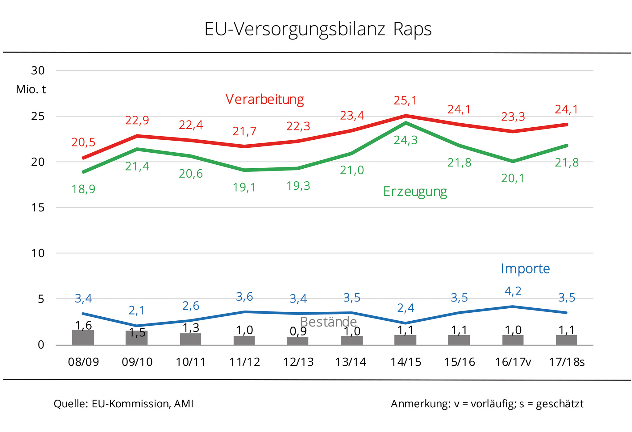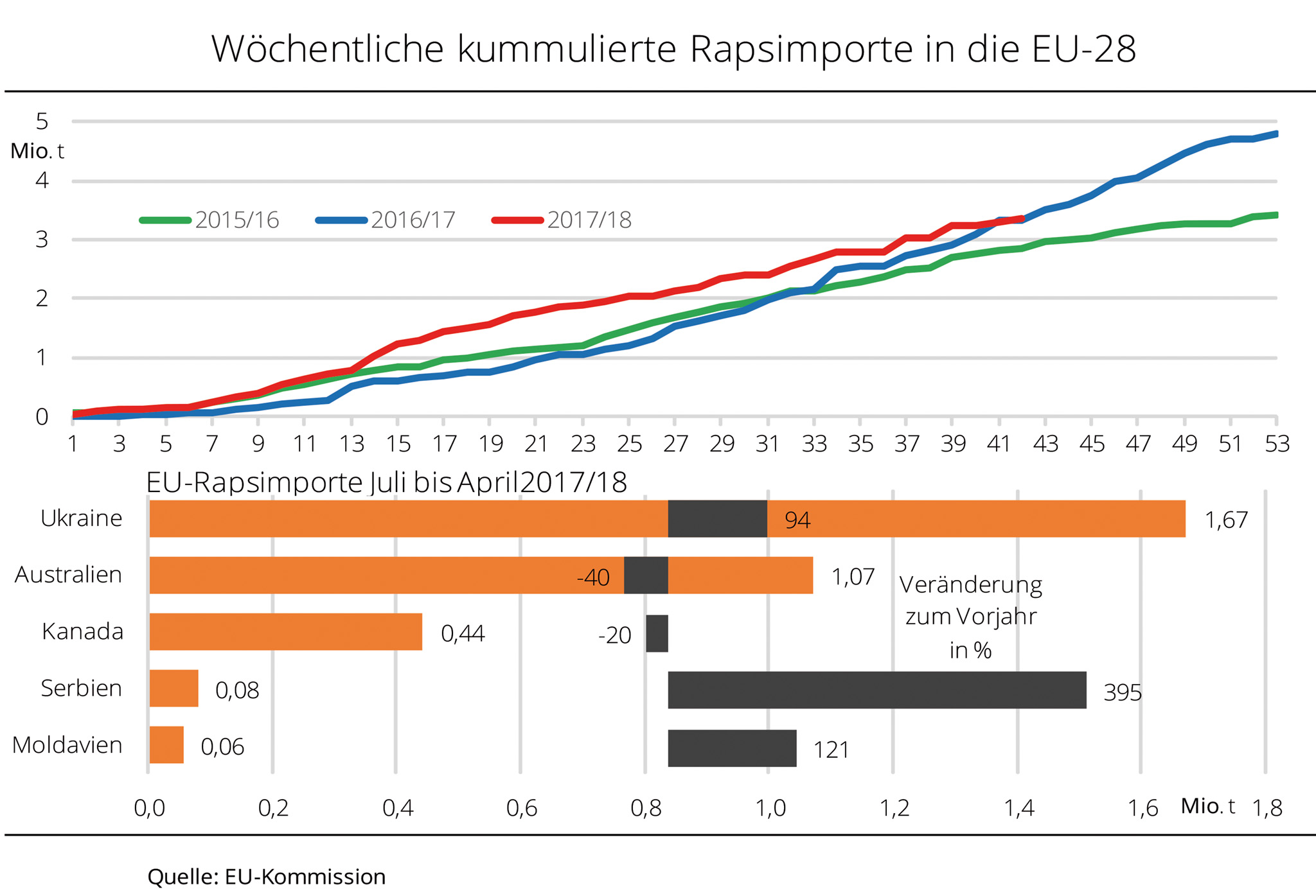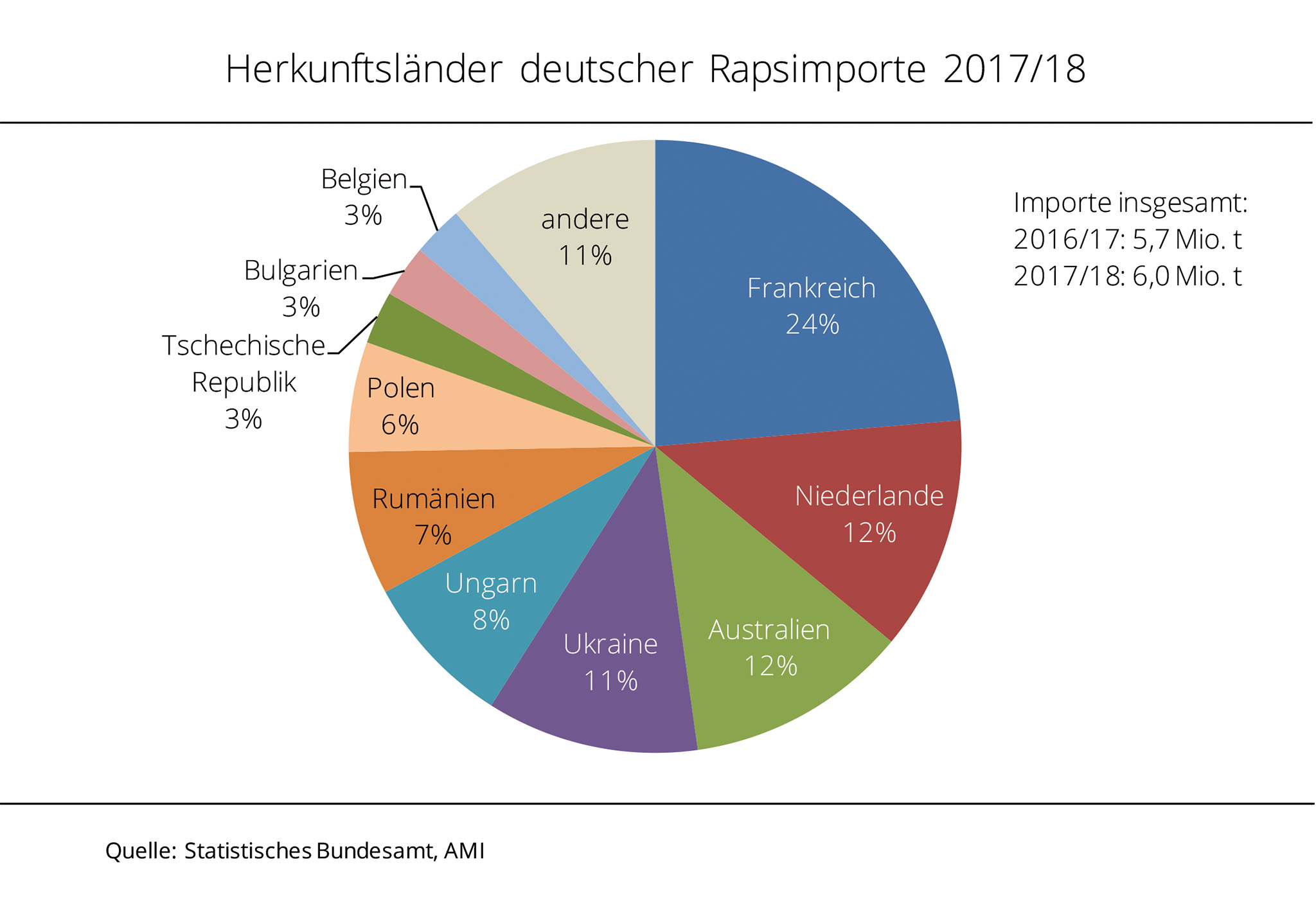Im Wirtschaftsjahr 2017/18 importierte die deutsche Ölmühlenwirtschaft rund 6 Mio. t Raps. Damit wurden fast 6 % mehr Raps eingeführt als im Vorjahr und somit so viel wie noch nie. Die größte Menge kam aus der EU-28, wobei der Anteil um rund 2 Prozentpunkte gegenüber dem Vorjahreszeitraum auf 75 % erneut schrumpfte. Wichtigstes Lieferland war Frankreich mit 1,4 Mio. t; dies waren allerdings 4 % weniger als 2016/17. Auf Platz zwei folgten mit großem Abstand die Niederlande, über die 0,74 Mio. t Drittlandraps eingeführt wurden. Der größte direkte Drittlandlieferant Australien exportierte rund 0,71 Mio. t Raps nach Deutschland und damit 27 % weniger als im Vorjahr. Den deutlichsten Zuwachs hatte allerdings die Ukraine zu verzeichnen. Nach Angaben der Agrarmarkt Informations-Gesellschaft mbH verdreifachte das Land seine Rapslieferungen nach Deutschland gegenüber dem Vorjahr auf 0,67 Mio. t und stellte als viertgrößtes Lieferland mehr als 11 % der Gesamteinfuhrmenge.