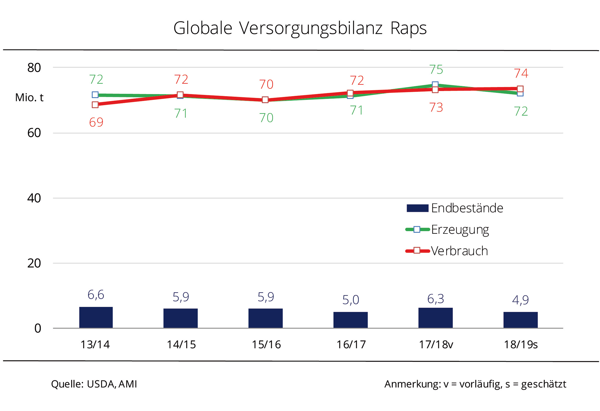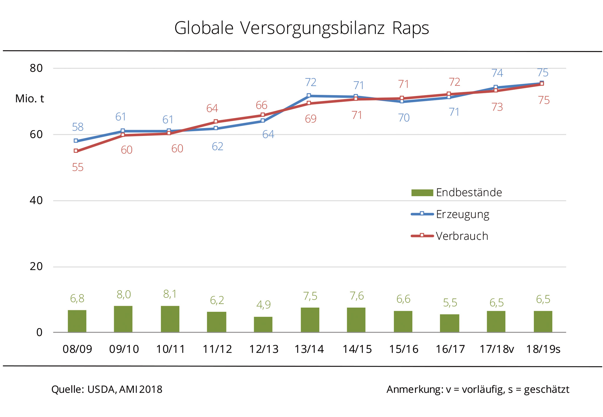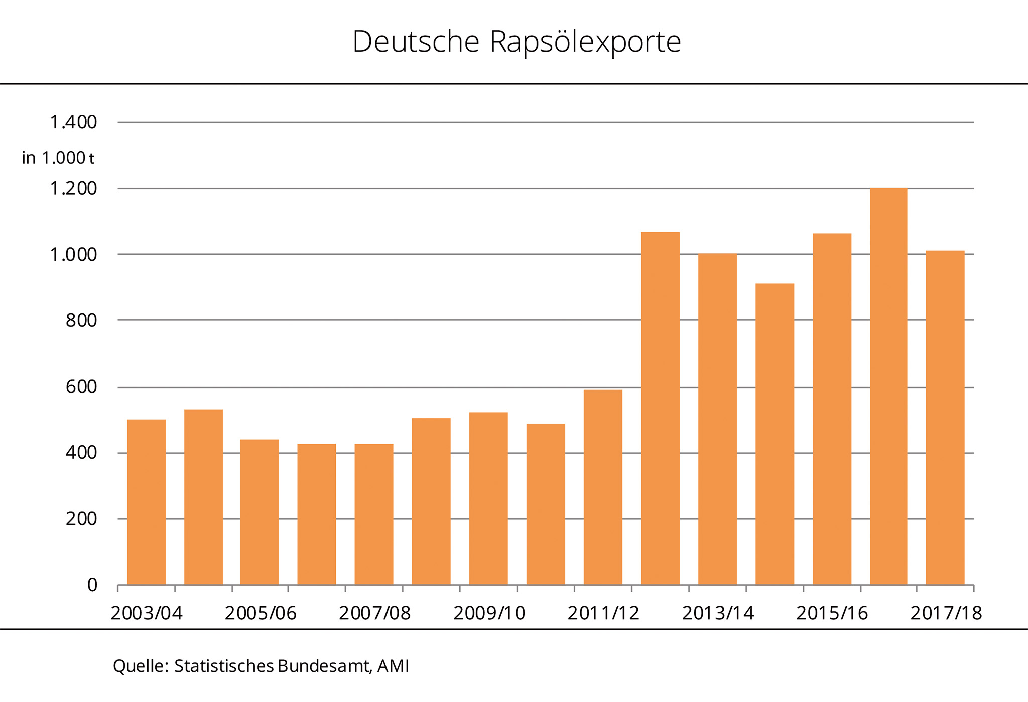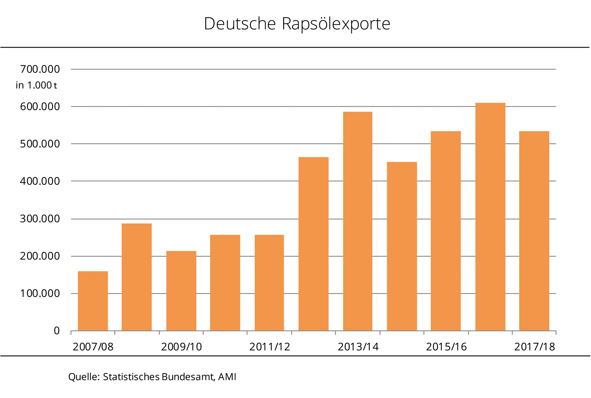 Im Wirtschaftsjahr 2017/18 importierte die deutsche Ölmühlenwirtschaft rund 6 Mio. t Raps. Damit wurden fast 6 % mehr Raps eingeführt als im Vorjahr und somit so viel wie noch nie. Die größte Menge kam aus der EU-28, wobei der Anteil um rund 2 Prozentpunkte gegenüber dem Vorjahreszeitraum auf 75 % erneut schrumpfte. Wichtigstes Lieferland war Frankreich mit 1,4 Mio. t; dies waren allerdings 4 % weniger als 2016/17. Auf Platz zwei folgten mit großem Abstand die Niederlande, über die 0,74 Mio. t Drittlandraps eingeführt wurden. Der größte direkte Drittlandlieferant Australien exportierte rund 0,71 Mio. t Raps nach Deutschland und damit 27 % weniger als im Vorjahr. Den deutlichsten Zuwachs hatte allerdings die Ukraine zu verzeichnen. Nach Angaben der Agrarmarkt Informations-Gesellschaft mbH verdreifachte das Land seine Rapslieferungen nach Deutschland gegenüber dem Vorjahr auf 0,67 Mio. t und stellte als viertgrößtes Lieferland mehr als 11 % der Gesamteinfuhrmenge.