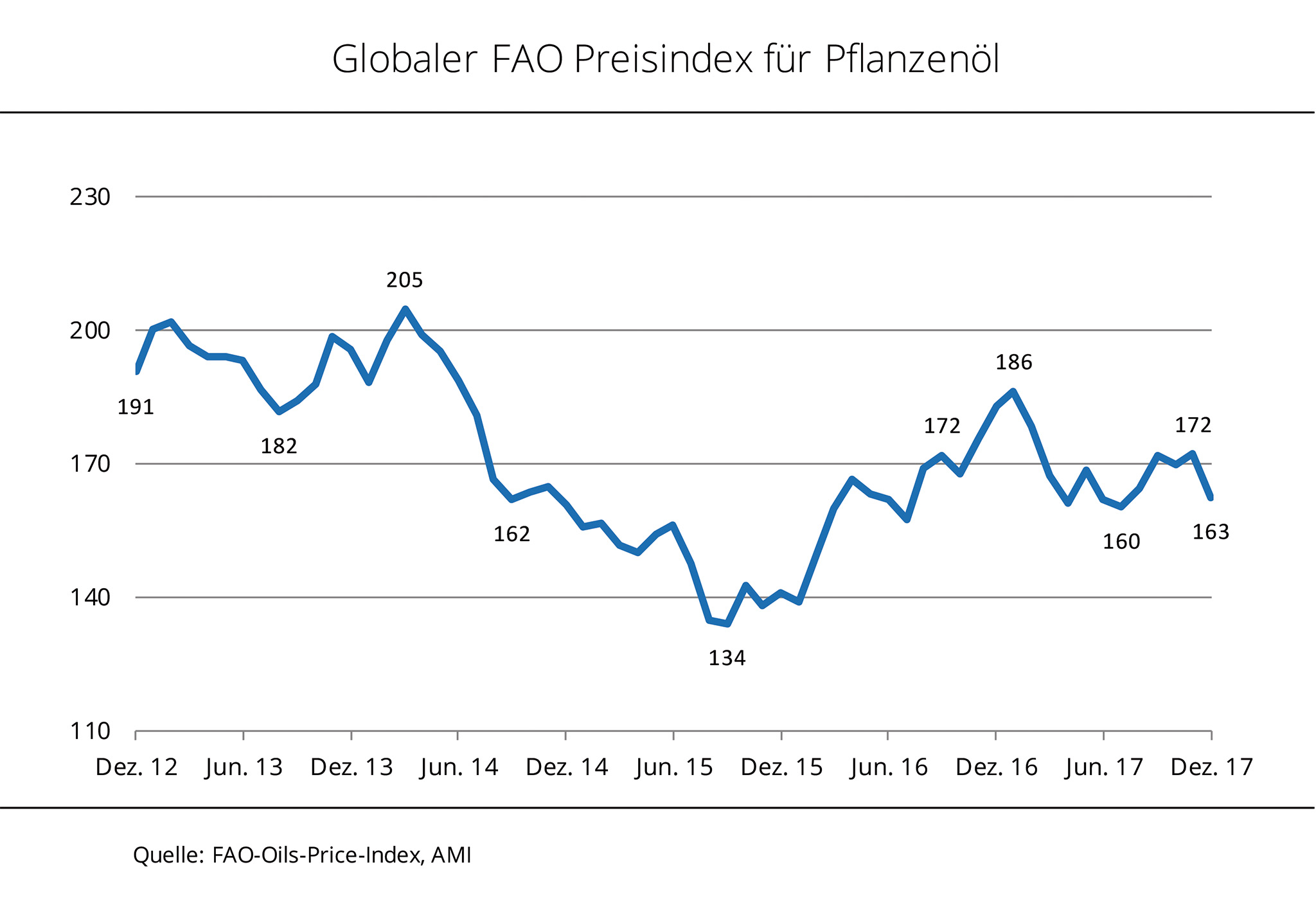 Der Pflanzenölindex der Ernährungs- und Landwirtschaftsorganisation der Vereinten Nationen (FAO) ist im Dezember 2017 auf ein 5-Monatstief gesunken. Besonders die schwächeren Preise für Palm-, Raps- und Sojaöl haben zu dem Rückgang beigetragen. Die Forderungen für Pflanzenöle haben sich im vierten Quartal 2017 anfänglich fester entwickelt, sind aber im Dezember wieder deutlich gefallen. Nachdem der FAO Pflanzenölindex, der die Preisentwicklung der 10 für den Welthandel bedeutendsten Pflanzenöle abbildet, im November 2017 noch auf den dritthöchsten Wert seit Jahresanfang gestiegen war, gaben die Preise im Dezember um 5,6 % gegenüber dem Vormonat nach und fielen auf den tiefsten Stand seit Juni 2017. Nach Angaben der Agrarmarkt Informationsgesellschaft mbH (AMI) belasteten besonders die schwächeren Forderungen für Palm- und Rapsöl den Sektor. Durch die Produktionssteigerungen auf den Ölpalmenplantagen in Südostasien und der gleichzeitig rückläufigen internationalen Nachfrage stiegen die Vorräte in Malaysia und Indonesien auf ein 2-Jahreshoch. Die kräftig gefallenen Palmölpreise zogen auch die Forderungen für Raps- und Sojaöl in Mitleidenschaft. Die unerwartet angehobene Prognose der australischen und kanadischen Rapserzeugung 2017/18 übte zusätzlichen Druck auf die Rapsölpreise aus. Die Union zur Förderung von Oel- und Proteinpflanzen befürchtet eine erhebliche Verschärfung dieser Preissituation, sollte die Verwendung von Biodiesel aus Rapsöl in der EU nicht mehr möglich sein. Am 17. Januar 2018 entscheidet das EU-Parlament in der Abstimmung zur EU-Biokraftstoffpolitik insbesondere über die mittelfristige Perspektive pflanzenölbasierter Biokraftstoffe und damit über einen wesentlichen Absatzweg von Pflanzenölen. Die angespannte Marktsituation in der EU sei im EU-Parlament bisher leider nicht thematisiert worden, kritisiert die UFOP.