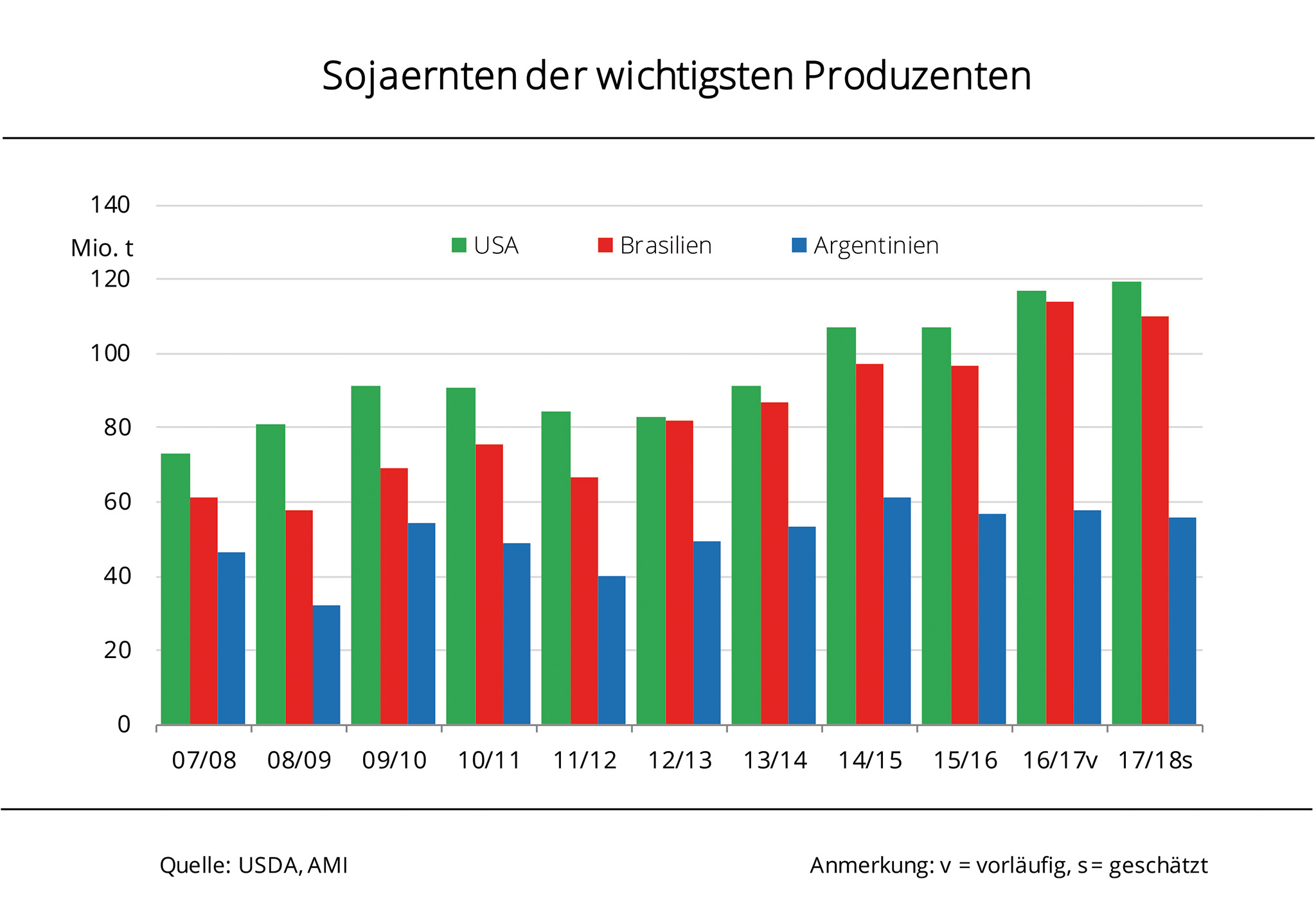 Im Wirtschaftsjahr 2017/18 dürfte die weltweite Sojaerzeugung geringer ausfallen als bislang erwartet. Durch die erneut angehobene Verbrauchsprognose könnten die globalen Endbestände sogar schrumpfen. Das US-Landwirtschaftsministerium hat in seiner März-Prognose die argentinische Sojaernte 2017/18 rund 13 % gegenüber dem Vormonat nach unten korrigiert und damit auf die anhaltende Trockenheit im Land reagiert. Demgegenüber wurde die Schätzung der brasilianischen Sojaerzeugung im Vormonatsvergleich leicht auf 113 Mio. t angehoben. Damit liegt die aktuelle Erwartung nur noch 1,1 Mio. t unter dem Rekordwert des Vorjahres. Mit der unveränderten Schätzung der US-Ernte avisieren die US-Agrarexperten eine globale Erzeugung 2017/18 von knapp 341 Mio. t. Der weltweite Verbrauch wird auf knapp 344 Mio. t geschätzt und dürfte das Vorjahresniveau um mehr als 4 % übersteigen. Grund für den Anstieg ist nach Einschätzung der Agrarmarkt Informationsgesellschaft mbH (AMI) die stetig zunehmende Nachfrage Chinas. Für 2017/18 rechnen Marktexperten mit einem Importbedarf von bis zu 100 Mio. t. Durch die angebotsübersteigende Nachfrage dürften die globalen Vorräte mit 94 Mio. t zwar kleiner ausfallen als bisher geschätzt, den Rekordwert 2016/17 aber nur um rund 3 % verfehlen.