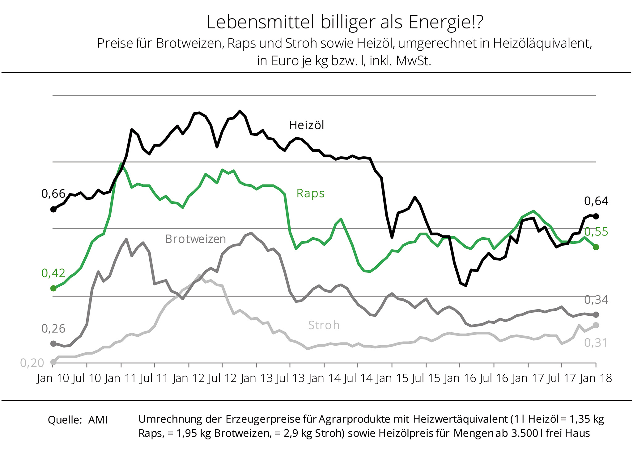 Die Rapspreise rutschen sogar regelrecht ab. War der Januar 2017 noch von lebhafter Nachfrage und vergleichsweise hohen Preisen geprägt, drückten ein geringes Kaufinteresse und die große Konkurrenz von Importraps die Erzeugerpreise 14 % unter Vorjahreslinie. Gänzlich entgegengesetzt entwickelten sich die Strohpreise in Deutschland. Die verregnete Ernte hatte Menge und Qualität gekostet. Das macht sich bei steigender Nachfrage über die Wintermonate zunehmend bemerkbar, so dass die Preise seit der Ernte stetig stiegen und aktuell 15 % über Vorjahr liegen. Dennoch sind Weizen & Co. weniger wert als Heizöl. Es würde sich für den Landwirt eher lohnen, seine Rohstoffe an Stelle von Heizöl zu verbrennen als zu verkaufen.