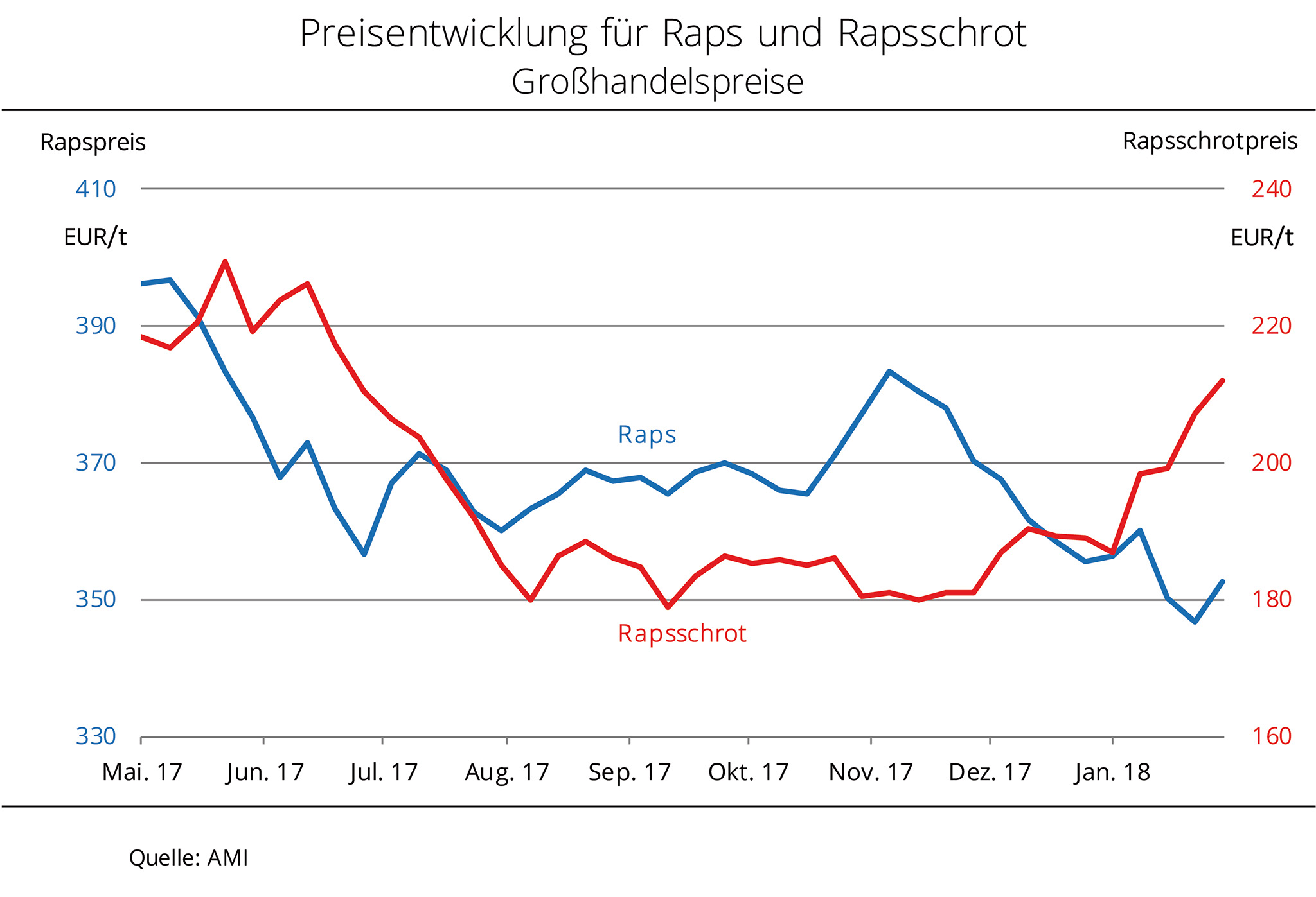 Die Forderungen für Raps und Rapsschrot haben sich in den vergangenen Wochen entgegengesetzt entwickelt. Fraglich ist, ob dieser Trend anhält. Die Großhandelspreise für Raps und Rapsschrot haben sich im zurückliegenden Jahr über weite Teile parallel entwickelt. Seit Januar 2018 hat sich jedoch eine ungewöhnliche Situation eingestellt. Während Raps anhaltend schwächer tendierte, befestigten sich die Rapsschrotpreise. In den ersten fünf Wochen 2018 sind die Großhandelspreise für Rapsschrot um rund 13 % auf jüngst 212 EUR/t gestiegen, während die Forderungen für Raps auf 347 EUR/t um 1 % nachgegeben haben. Grund für die entgegengesetzte Preisentwicklung war nach Angaben der Agrarmarkt Informationsgesellschaft mbH (AMI) eine etwas lebhaftere Nachfrage nach Rapsschrot bei gleichzeitig überschaubarem Angebot. Zudem stützten feste Sojaschrotpreise, getrieben von steigenden US-Sojakursen in Chicago, den Aufwärtstrend. Davon konnte Raps nicht profitierten. Allerdings endete der Aufwärtstrend der US-Sojakurse: Bei sich aktuell abschwächenden US-Notierungen dürften auch die Preise für Raps und dessen Nachprodukte neu kalkuliert werden.