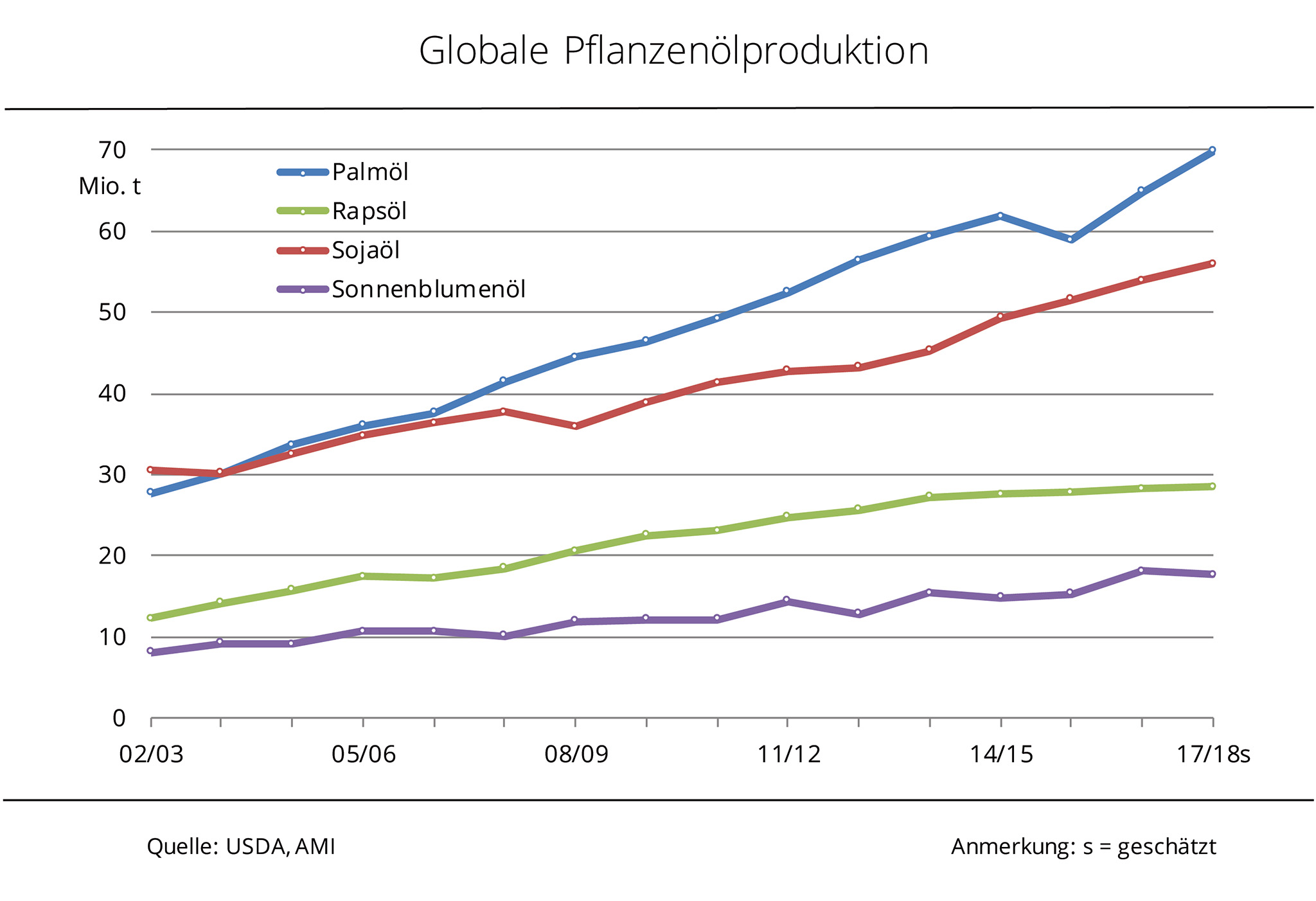 Das US-Landwirtschaftsministerium (USDA) prognostiziert für 2017/18 eine globale Rekordproduktion von 197 Mio. t Pflanzenöl. Besonders bei Palm-, aber auch bei Sojaöl steigen die Mengen. Die weltweite Pflanzenölproduktion 2017/18 dürfte nach Schätzung des USDA um mehr als 4 % gegenüber Vorjahr auf das Rekordniveau von 197 Mio. t zulegen. Auf Palm-, Soja-, Raps- und Sonnenblumenöl entfallen ca. 87%. Mit 7,6% erzielt Palmöl den größten Zuwachs. Günstige Vegetationsbedingungen in Südostasien und eine unerwartet rasche Erholung der Palmölplantagen nach dem zu trockenen Vorjahr trugen zu der Produktionssteigerung bei. Der Zuwachs bei Sojaöl wird indes auf 3,7 % geschätzt. Bei Soja begünstigten eine üppige Rohstoffverfügbarkeit aus der globalen Rekordsojaernte 2016/17 und die anhaltend rege internationale Nachfrage die Entwicklung. Nur ein leichter Anstieg von 0,5 % wird hingegen für die Rapsölproduktion erwartet. Grund dafür ist nach Angaben der Agrarmarkt Informations-Gesellschaft mbH (AMI) die Konkurrenz durch Palm- und Sojaöl und eine sich weniger dynamisch als 2016/17 entwickelnde Nachfrage. Die Produktion von Sonnenblumenöl dürfte sogar um 2,5 % zurückgehen, da die ukrainische Sonnenblumenerzeugung um 14 % gegenüber Vorjahr gesunken ist.