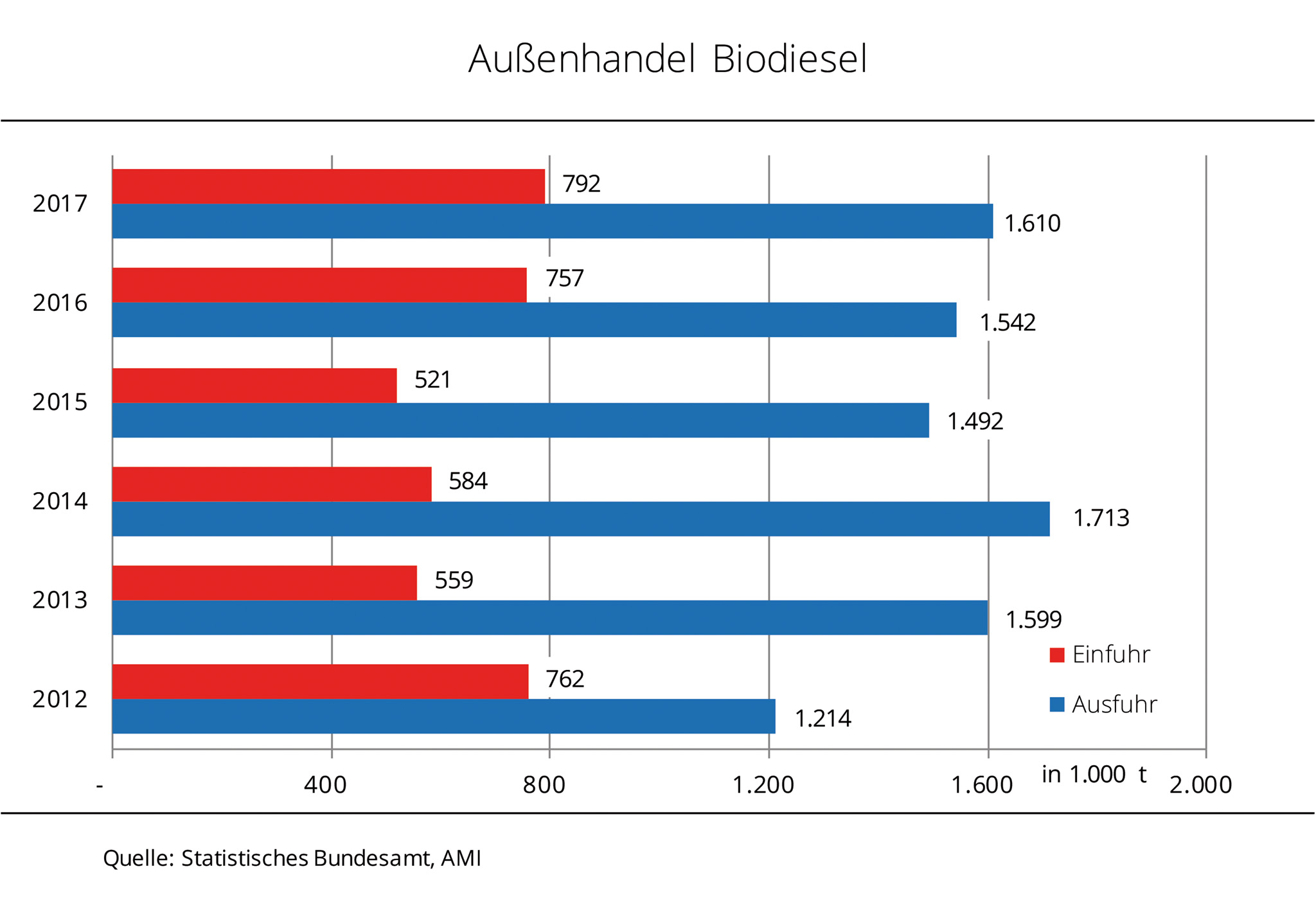 Nach den Exportzahlen des Statistischen Bundesamtes ist Biodiesel aus Deutschland weiterhin sehr gefragt. Besonders innerhalb der EU-28 wuchs die Nachfrage kräftig. Rund 1,61 Mio. t Biodiesel aus Deutschland wurden im Jahr 2017 exportiert. Damit übertrafen die Ausfuhren das Vorjahresniveau um 4,4 % und sind eine wichtige Stütze der Rapsölnachfrage in Deutschland. Wichtigste Abnehmer sind die EU-Mitgliedsländer mit einem Anteil von rund 89 %. Während die Niederlande, größter Abnehmer von deutschem Biodiesel, etwas weniger orderten als im Vorjahr, hat das zweitplatzierte Polen seine Biodieselkäufe um 2 % auf 234.000 t ausgeweitet. Ein kräftiges Absatzplus von knapp 35 % wurde in Österreich erzielt, das zum drittgrößten Abnehmer aufstieg. Die Nachfrage aus Dänemark ist mit einem Zuwachs von 104 % überraschend stark gestiegen. Bedeutendstes Drittland waren laut Statistischem Bundesamt die USA. Dorthin wurde mit 70.100 t allerdings 17,5 % weniger geliefert als 2016. Die Exporte waren erst im letzten Quartal 2017 wieder angezogen. Gleichzeitig fragte Deutschland mit 792.000 t etwa 4,6 % mehr Biodiesel aus dem Ausland nach. Das ist nach Angaben der Agrarmarkt Informations-Gesellschaft (mbH) die größte Menge seit 2012. Die Lieferungen aus den Niederlanden sind mit 305.000 t um 6,5 % gestiegen und das trotz eines Vorjahreszuwachses von 87 %. Belgien steigerte seine Ausfuhren nach Deutschland sogar um 35 % auf 136.000 t. Aus Malaysia wurden indes mit 124.000 t rund 3,5 % weniger importiert als 2016.