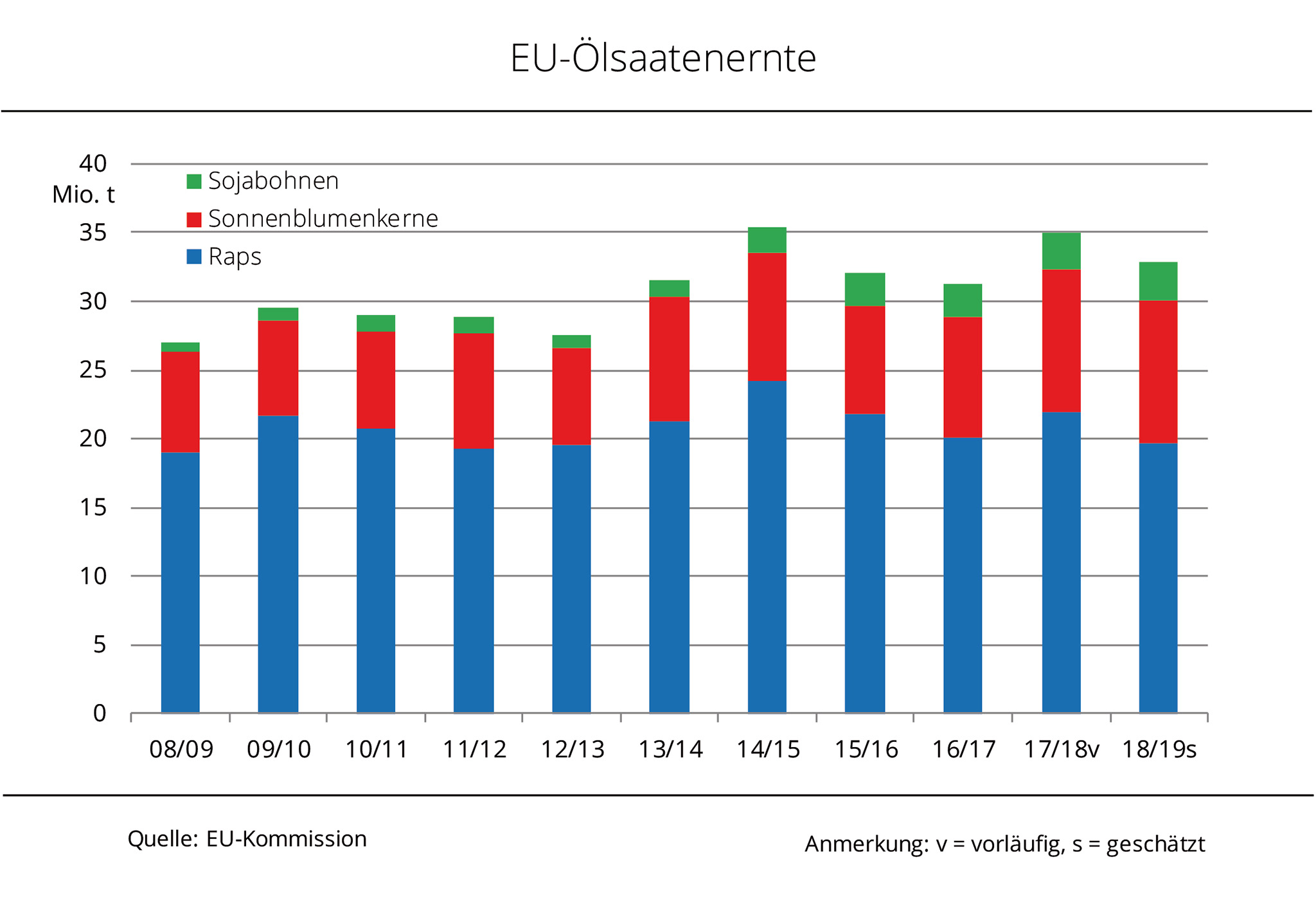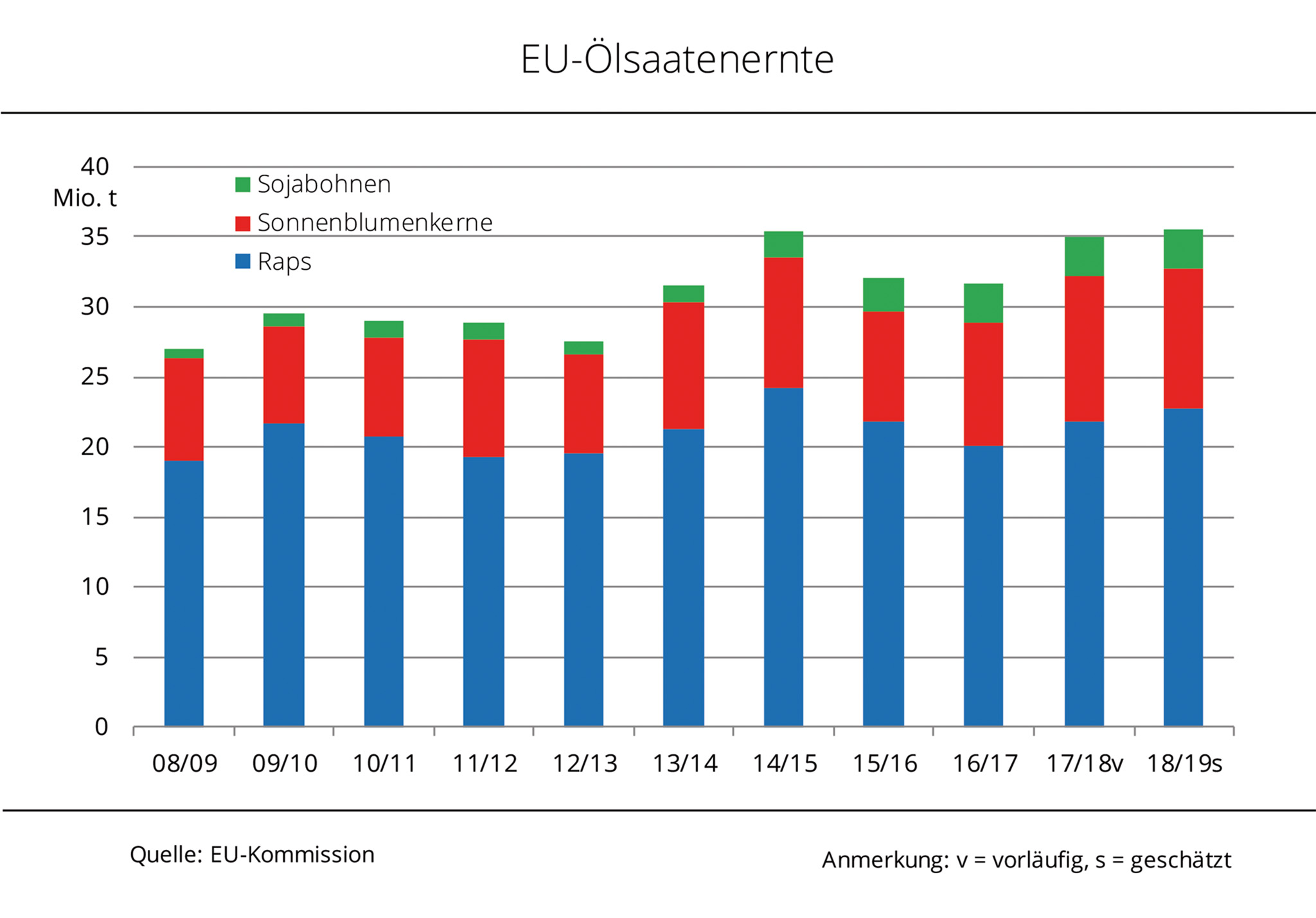 Die Ölsaatenerzeugung 2018/19 in der EU-28 könnte nach ersten Prognosen der EU-Kommission über dem Vorjahr liegen. Besonders die Rapsernte wird höher geschätzt. Die EU-Kommission prognostiziert in ihrem aktuellen Monatsbericht die Ölsaatenernte 2018 der EU-28 auf 35,5 Mio. t. Damit würde die Erzeugung von Rapssaat, Sonnenblumenkernen und Sojabohnen die Vorjahresmenge um 1,6 % bzw. 0,6 Mio. t übertreffen. Der Umfang der Rapserzeugung als bedeutendste Ölsaat in der EU-28 könnte der Ernteprognose zu Folge 2018 um 4,5 % auf rund 22,8 Mio. t zunehmen. Die Sojabohnenerzeugung wird mit 2,8 Mio. t knapp 0,4 % über Vorjahresniveau avisiert und das obwohl die Anbaufläche mit 0,9 Mio. ha fast 7 % kleiner ausfallen könnte als im Vorjahr. Für die Sonnenblumenerzeugung sieht die EU-Kommission auf einer um 3,4 % rückläufigen Anbaufläche hingegen einen Rückgang um 4,2 % auf 9,9 Mio. t. Nach Angaben der Agrarmarkt Informations-Gesellschaft (mbH) sind diese Schätzungen noch mit einem großen Unsicherheitsfaktor belegt. Es ist bisher nicht abzusehen, ob und in welchem Umfang die frostigen Temperaturen zu Auswinterungen und Ertragseinbußen in den Rapsbeständen geführt haben. Sollte die Prognose der EU-Kommission eintreten, würde die EU-Ölsaatenerzeugung das bisherige Rekordniveau der Ernte 2014 übertreffen