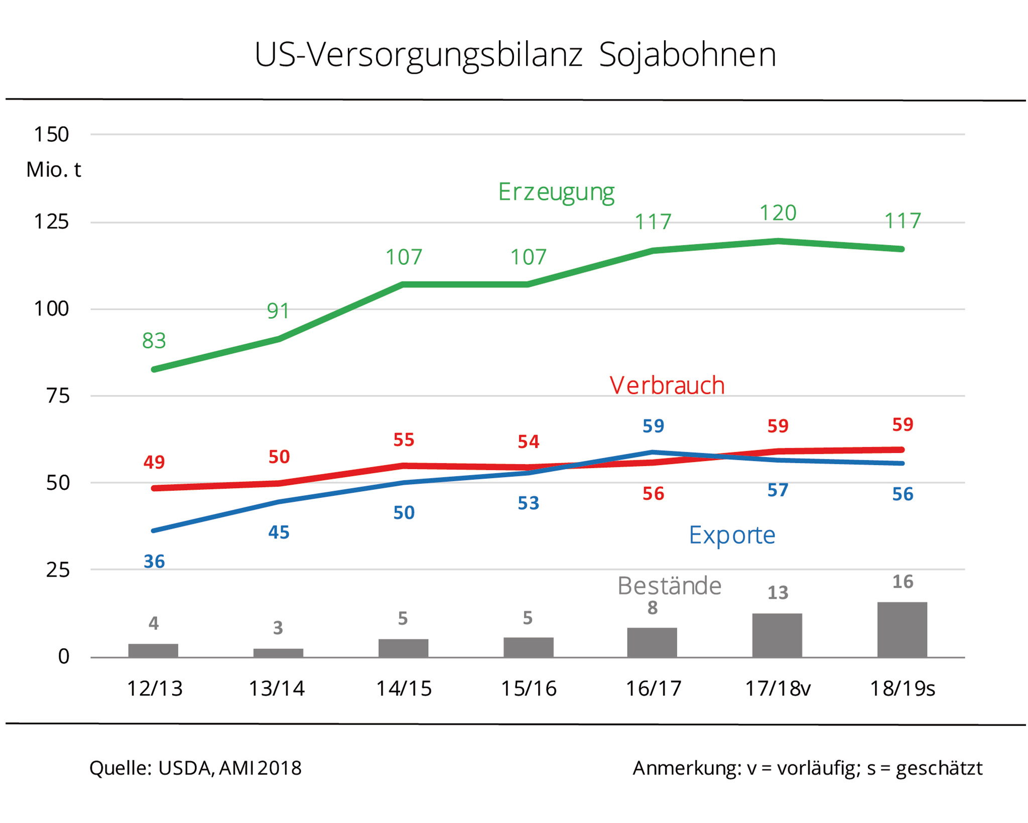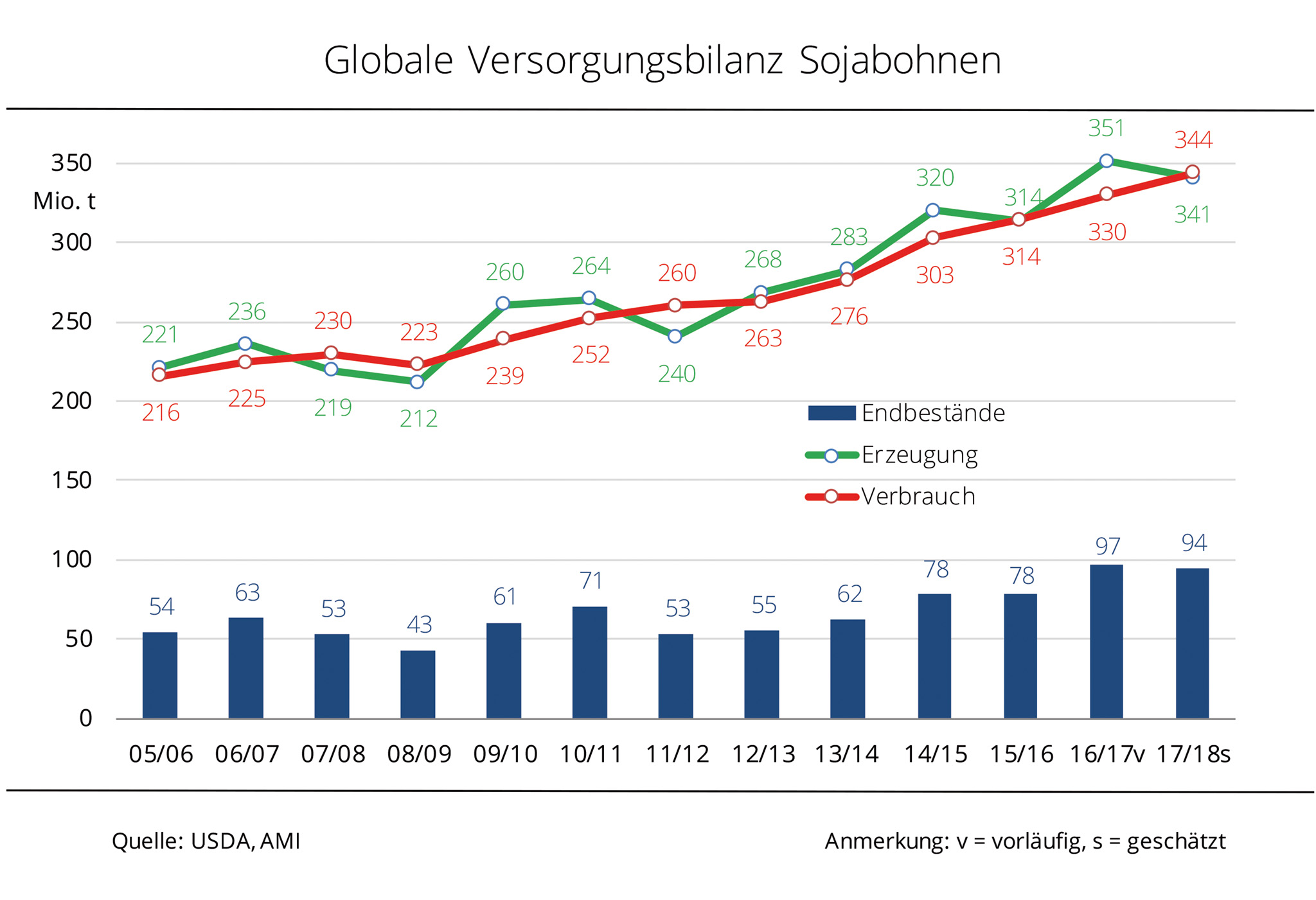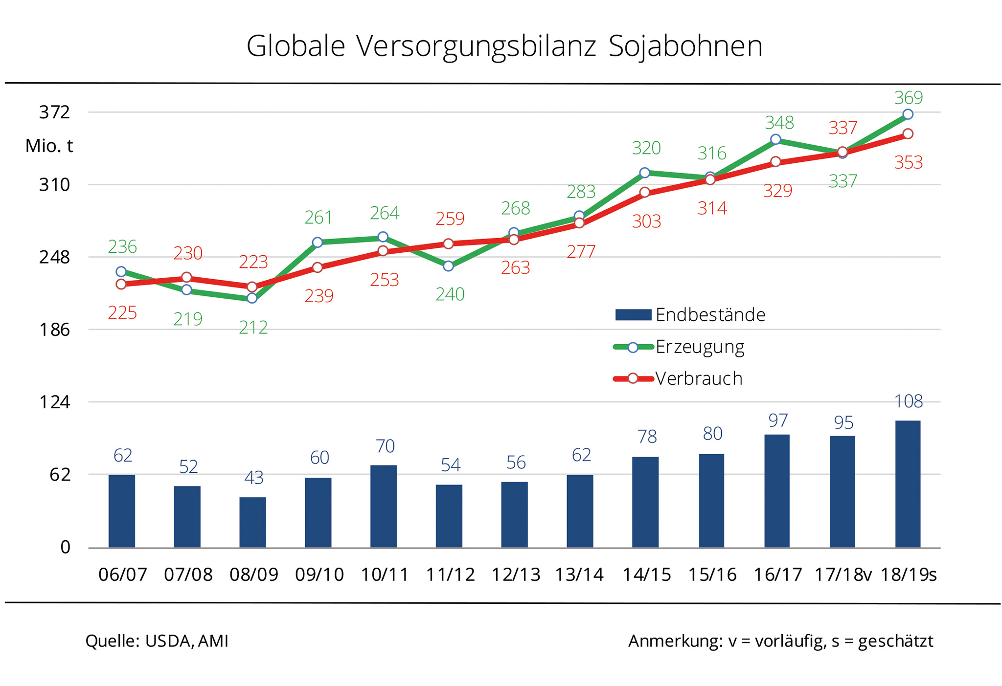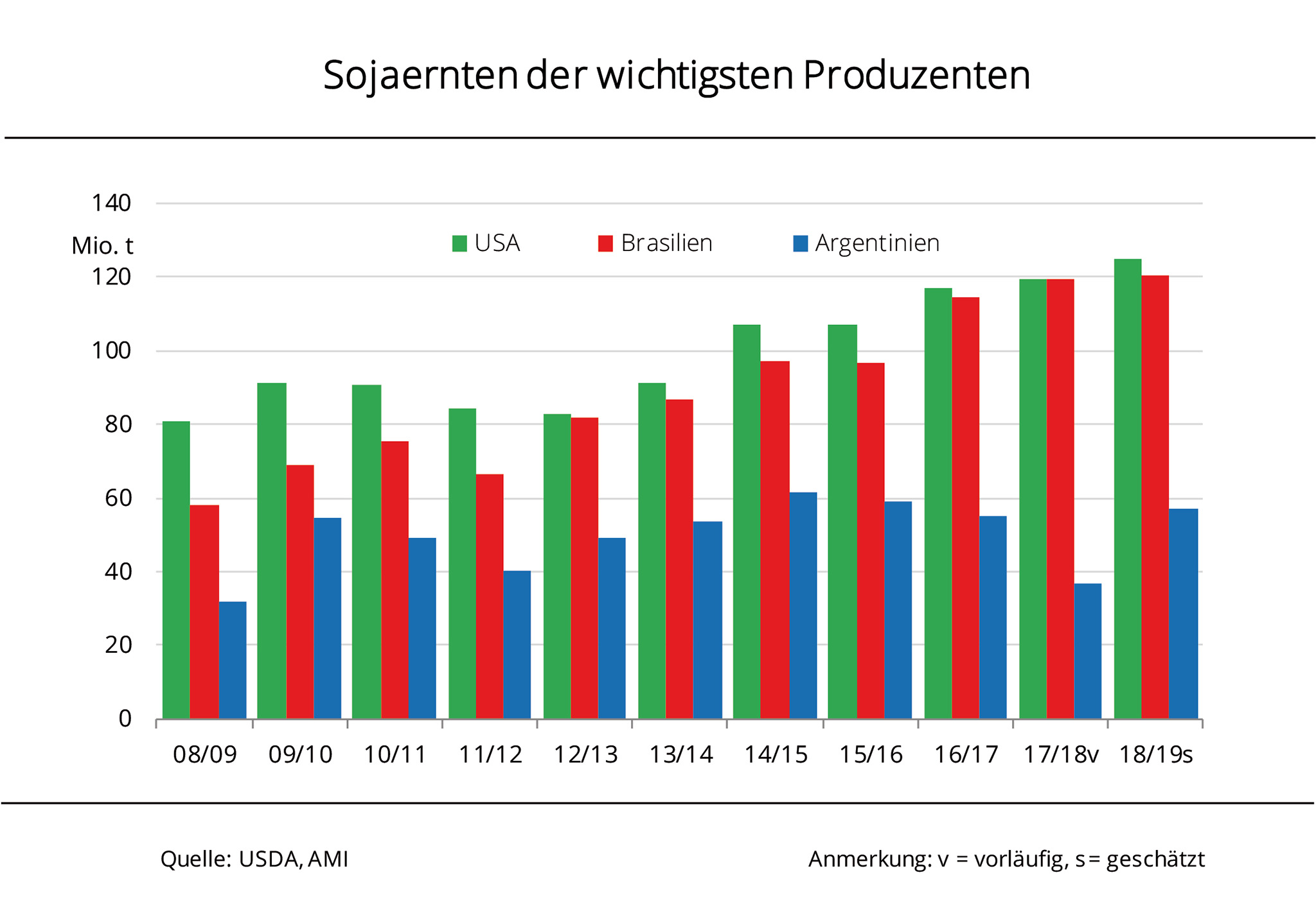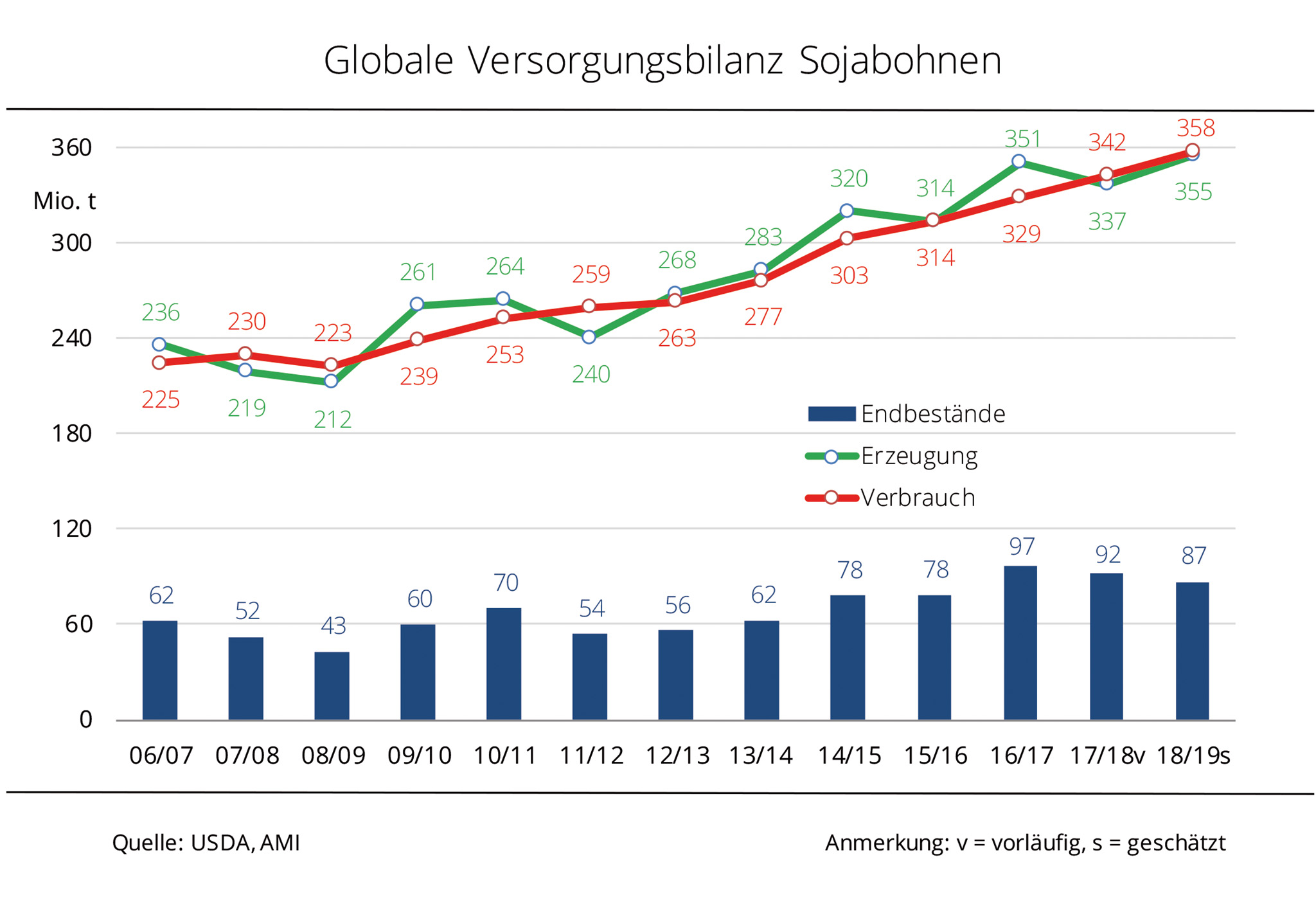Im Wirtschaftsjahr 2018/19 könnte die weltweite Sojaerzeugung wieder deutlich zunehmen. Das dürfte dennoch nicht ausreichen die Nachfrage zu bedienen, was erneut zu einem Vorratsabbau führen würde. Das US-Landwirtschaftsministerium hat in seinem Juni-Bericht die weltweite Sojabohnenerzeugung 2018/19 auf 355 Mio. t taxiert und damit 18,5 Mio. t höher als im bald endenden Wirtschaftsjahr. Größter Sojaerzeuger dürfte demnach Brasilien mit avisiert 118 Mio. t werden. Der USDA-Prognose zu Folge dürfte der globale Verbrauch 2018/19 um 16 Mio. t das Vorjahresniveau übersteigen. Mit 358 Mio. t würden rund 3 Mio. t mehr Sojabohnen verarbeitet als geerntet werden. Nach Einschätzung der Agrarmarkt Informationsgesellschaft mbH (AMI) könnten somit am Ende des Wirtschaftsjahres die globalen Vorräte zum zweiten Mal in Folge schrumpfen. Mit aktuell prognostizierten 87 Mio. t wären das rund 5 Mio. t weniger als im Vorjahr, aber immer noch die drittgrößten Vorratsbestände in der Geschichte. Weltweit bedeutendster Sojaimporteur wird auch 2018/19 China sein. Mit avisierten 103 Mio. t steigt der Bedarf um mehr als 6 Mio. t gegenüber dem Vorjahr auf einen neuen Höchststand. Damit würden knapp 64 % der weltweit gehandelten Sojabohnen nach China geliefert werden.
