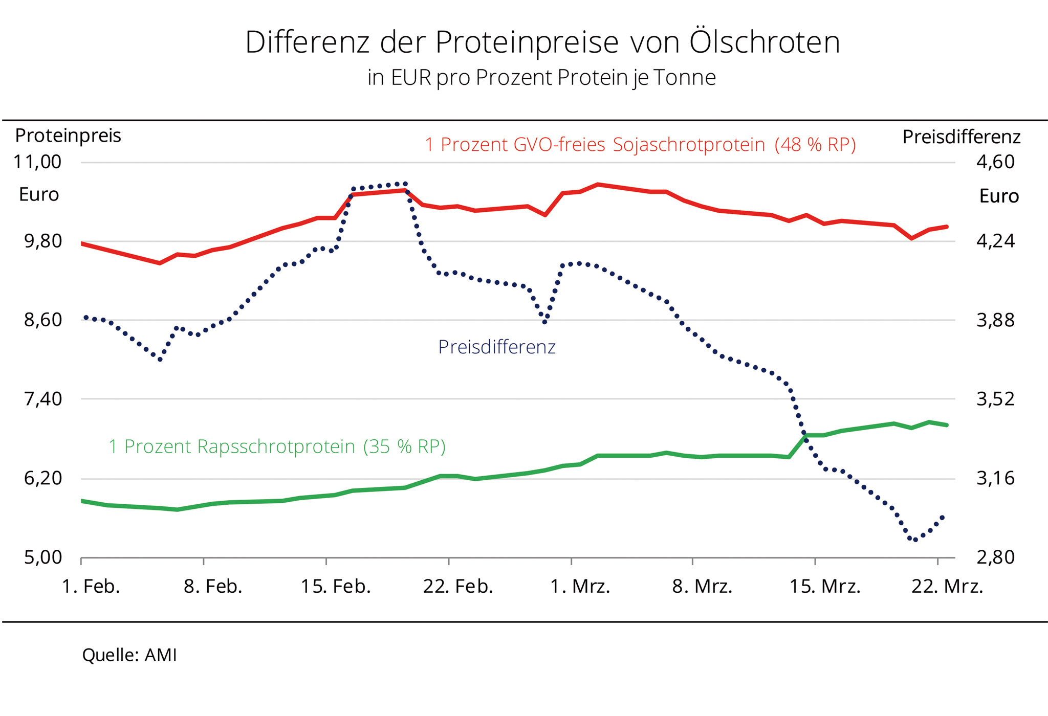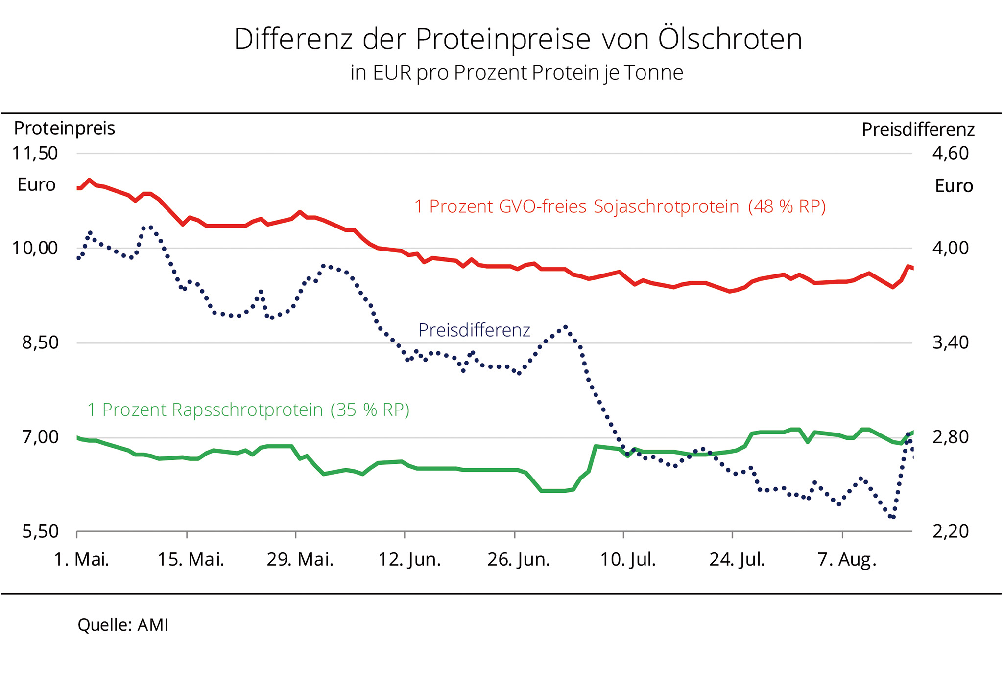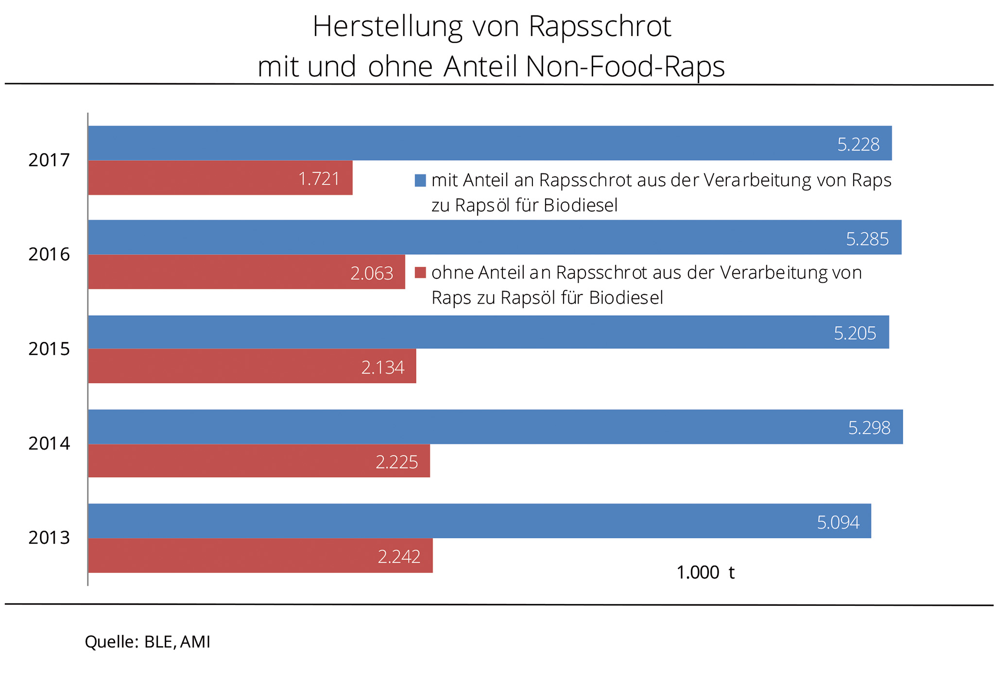 Der Futtermittelmarkt profitiert maßgeblich von der Biodieselherstellung, weil Rapsschrot als Koppelprodukt bei der Ölpressung anfällt. Rapsschrot ist europaweit die wichtigste heimische gentechnikfreie Eiweißquelle für die Nutztierfütterung, bilanziert die Union zur Förderung von Oel- und Proteinpflanzen (UFOP). 2017 wurden in Deutschland 9,2 Mio. t Raps verarbeitet. Daraus entstanden knapp 4 Mio. t Rapsöl und 5,2 Mio. t Rapsschrot. Da Raps in Europa und in vielen anderen Ländern der Welt ohne Einsatz von Gentechnik erzeugt wird, gilt auch das Nachprodukt Rapsschrot als „gentechnikfrei“ (GVO-frei). Das fördert den Einsatz vor allem in der Milchviehfütterung, denn hier kann es Sojaschrot vollständig ersetzen. Hintergrund ist die verstärkte Nachfrage nach Milchprodukten, die mit dem Prädikat „ohne Gentechnik“ ausgezeichnet sind.