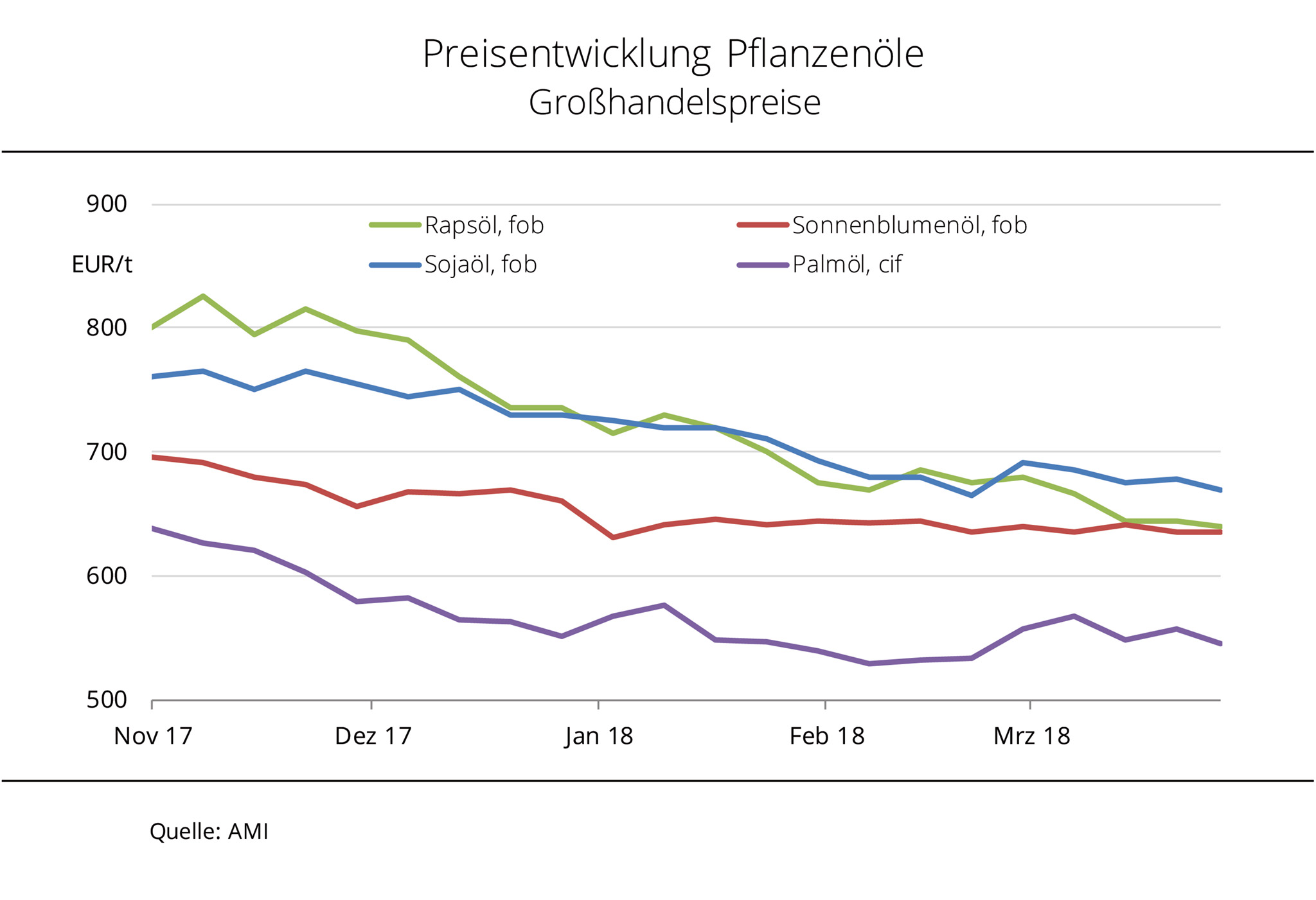 Die Pflanzenölpreise tendieren schwächer, besonders Rapsöl verliert kräftig, aber auch Sojaöl hat sich deutlich vergünstigt. Die von Indonesien erfolgreich bei der WTO durchgesetzten Zollsatzsenkungen auf Palmöl und die seit September reduzierten Zollsätze für Biodiesel aus Argentinien belasten zunehmend die Pflanzenölpreise in Deutschland. Rapsöl leidet als heimischer Rohstoff für Biodiesel besonders unter den Einfuhren. Die Konkurrenz am Markt ist nochmal deutlich gestiegen, bei stetig nachgebenden Forderungen. Nach Angaben der Agrarmarkt Informations-Gesellschaft mbH (AMI) wurden fob Hamburg für Rapsöl zuletzt 640 EUR/t genannt und damit der niedrigste Stand seit dreieinhalb Jahren. Auch die Forderungen für Sojaöl sind im ersten Quartal 2018 gefallen. Fob Hamburg wurden im Februar und März im Schnitt 678 EUR/t verlangt. Im Vorjahreszeitraum waren es noch durchschnittlich 778 EUR/t. Grund für den Preisrückgang waren vor allem die Vorgaben an den Terminmärkten für Sojaöl in Chicago. Palmöl hatte indes im Februar zu einer kleinen Erholungsrallye angesetzt, konnte aber das höhere Preisniveau nicht halten. Aktuelle Produktionsdaten aus Malaysia deuten auf einen deutlichen Anstieg in den ersten drei Märzwochen hin. Die Union zur Förderung von Oel- und Proteinpflanzen (UFOP) sieht einen Ausweg nur in deutlich zulegenden Rapsölexporten, denn der europäische Biokraftstoffmarkt setzt, bedingt durch wenig ambitionierte Vorgaben, keine mengen- und damit preiswirksame Nachfrageimpulse.