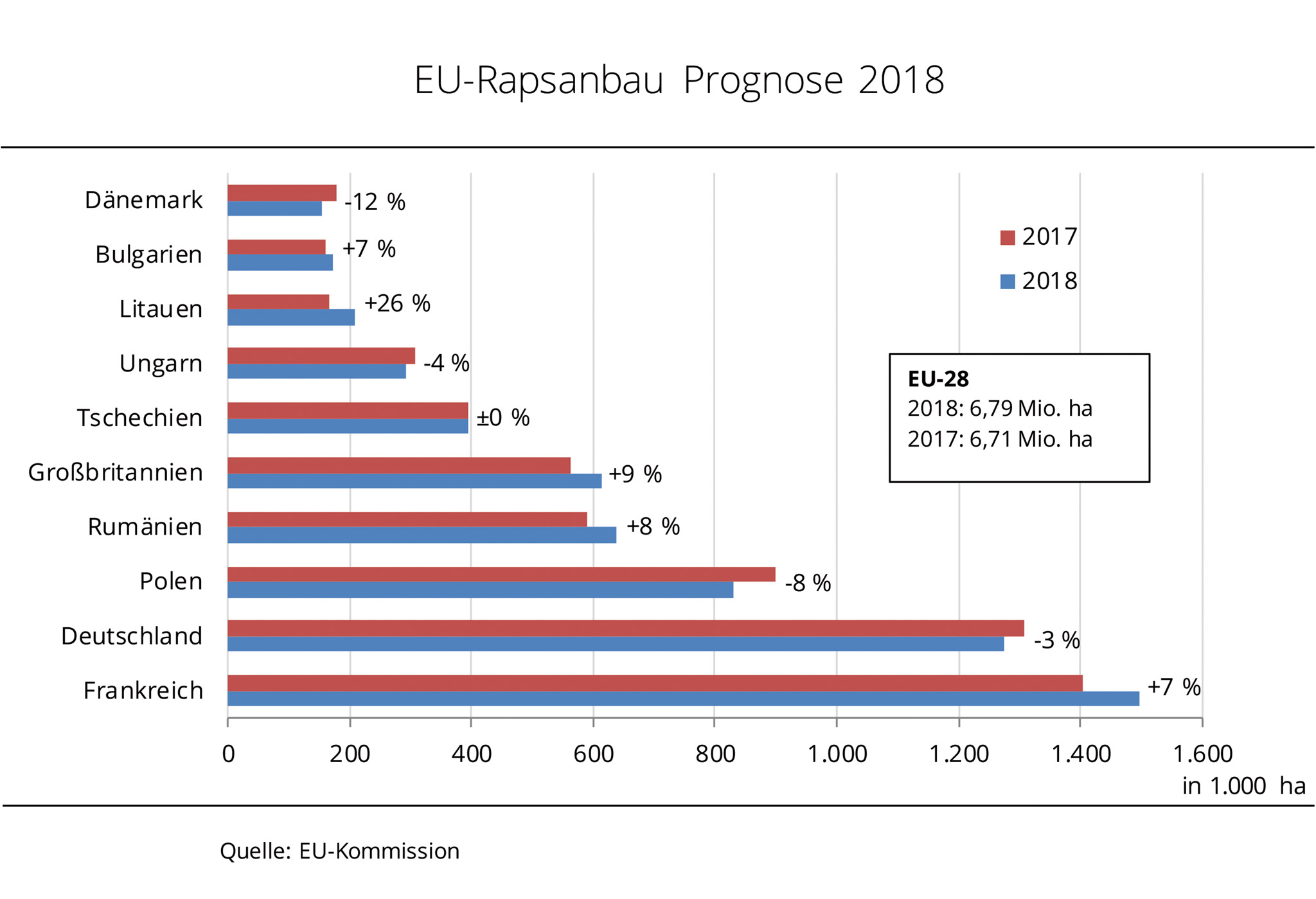In der EU-28 stehen zur Ernte 2018 auf schätzungsweise 6,8 Mio. ha Winterraps. Das sind gut 80.000 ha mehr als im Vorjahr. In den einzelnen EU-Mitgliedsstaaten entwickeln sich die Anbauflächen sehr unterschiedlich. Nach Angaben der Agrarmarkt Informations-Gesellschaft (mbH) könnte sich der Anbau in Deutschland und Polen aufgrund regionaler Auswinterungen in Ostdeutschland und Westpolen sowie schlechter Aussaatbedingungen in Norddeutschland gegenüber dem Vorjahr rückläufig entwickeln. Auch die Anbaufläche in Dänemark wird deutlich unter Vorjahreslinie gesehen. Demgegenüber haben die Erzeuger in Frankreich und Rumänien den Rapsanbau auf Grund der Flächenprofitabilität ausgeweitet. In Rumänien nimmt der Rapsanbau seit Jahren stetig zu. Das Fünfjahresmittel wird 2018 sogar um mehr als 50 % überschritten. Im größten Teil der EU-28 hat es aufgrund des überwiegend milden Winters kaum Schäden an den Kulturen gegeben.