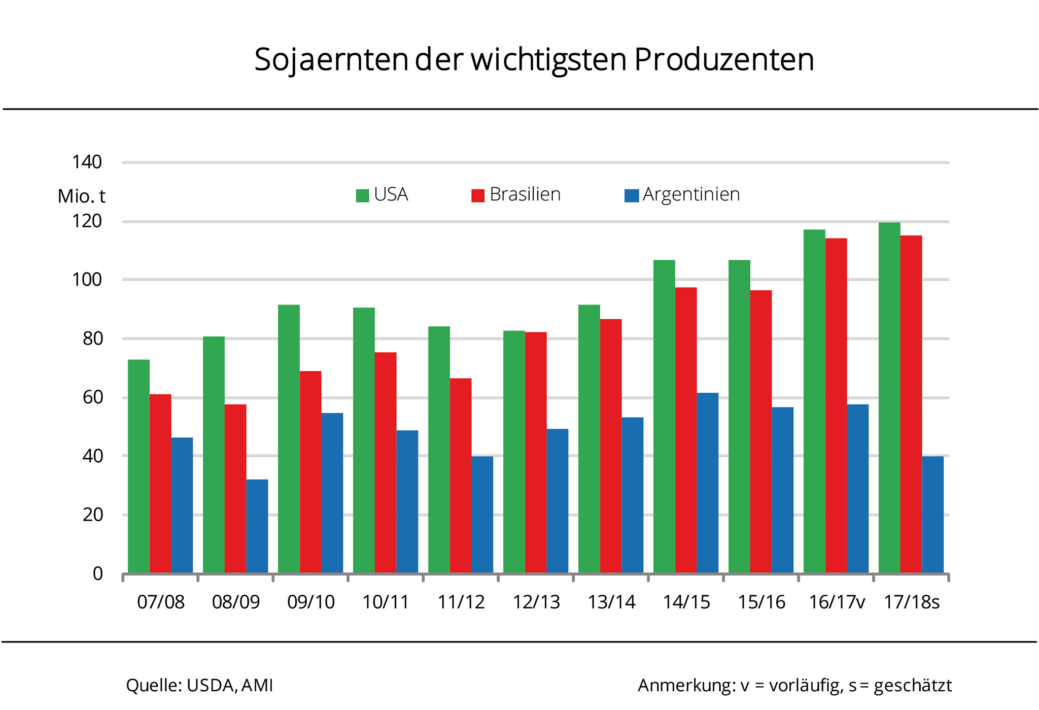Die weltweite Sojaerzeugung fällt 2017/18 deutlich geringer aus als bisher erwartet. Argentinien erntet ein Drittel weniger als anfänglich prognostiziert, höhere Ernten in Brasilien und den USA können das geringere Angebot nicht kompensieren. Für das Wirtschaftsjahr 2017/18 deutet sich global eine geringere Versorgung mit Sojabohnen an, als noch vor wenigen Wochen erwartet wurde. In vielen Landesteilen Argentiniens machten in den vergangenen Monaten ungewöhnlich hohe Temperaturen und fehlende Niederschläge den Feldbeständen zu schaffen. Nach Angaben der Agrarmarkt Informationsgesellschaft mbH (AMI) wurden die Ernteschätzungen im Verlauf der zurückliegenden Wochen stetig nach unten korrigiert. Die aktuelle Prognose des US-Landwirtschaftsministeriums avisiert die argentinische Sojabohnenernte 2017/18 auf nur noch 40 Mio. t. Das sind rund 7 Mio. t weniger als im Vormonat und fast ein Drittel weniger als zu Jahresbeginn erwartet wurde. Demgegenüber wurde für Brasilien, aufgrund nahezu optimaler Vegetationsbedingungen, die Ernteprognose um 2 Mio. t auf 115 Mio. t angehoben. Demnach könnte die weltweite Sojaerzeugung im laufenden Wirtschaftsjahr 335 Mio. t erreichen und läge somit knapp 5 % unter dem Vorjahr, wobei der Anteil Argentiniens um 4 Prozentpunkte auf unter 12 % sinken dürfte.