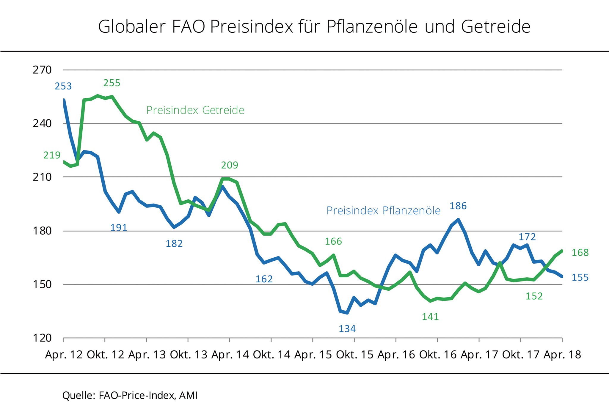 Die Preisindices für Pflanzenöle und Getreide der Ernährungs- und Landwirtschaftsorganisation der Vereinten Nationen (FAO) tendierten zuletzt uneinheitlich. Während die Pflanzenöle deutlich unter Druck geraten, legen die Getreidepreise seit Jahresbeginn zu. Die Forderungen für Pflanzenöle haben sich in den ersten vier Monaten 2018 deutlich schwächer entwickelt. Nachdem der FAO Pflanzenölindex, der die Preisentwicklung der 10 für den Welthandel bedeutendsten Pflanzenöle abbildet, im November 2017 noch auf den dritthöchsten Wert seit 16 Monaten gestiegen war, fielen die Preise bis dato um 10 % auf den tiefsten Stand seit mehr als zwei Jahren. Nach Angaben der Agrarmarkt Informationsgesellschaft mbH (AMI) belasteten insbesondere die schwächeren Forderungen für Palm- und Sojaöl den Index. Deutliche Produktionssteigerungen auf den Ölpalmenplantagen bei gleichzeitig rückläufiger internationale Nachfrage setzten die Palmölnotierungen unter Druck. Die Preise für Sojaöl wurden durch ein Überangebot am Weltmarkt belastet, da momentan mehr Sojaöl bei der Sojaschrotproduktion anfällt als aktuell verbraucht wird. Demgegenüber hat sich der FAO Getreidepreisindex nach einer langjährigen Schwächephase seit Jahresanfang um mehr als 10 % erhöht. Grund waren vor allem feste Weizenpreise, die durch die ungünstigen Vegetationsbedingungen in den USA kräftig zulegten. Auch die Forderungen für Mais haben sich befestigt. Sorgen vor trockenheitsbedingten Ertragsausfällen in Argentinien und zuletzt auch in Brasilien gaben Auftrieb.