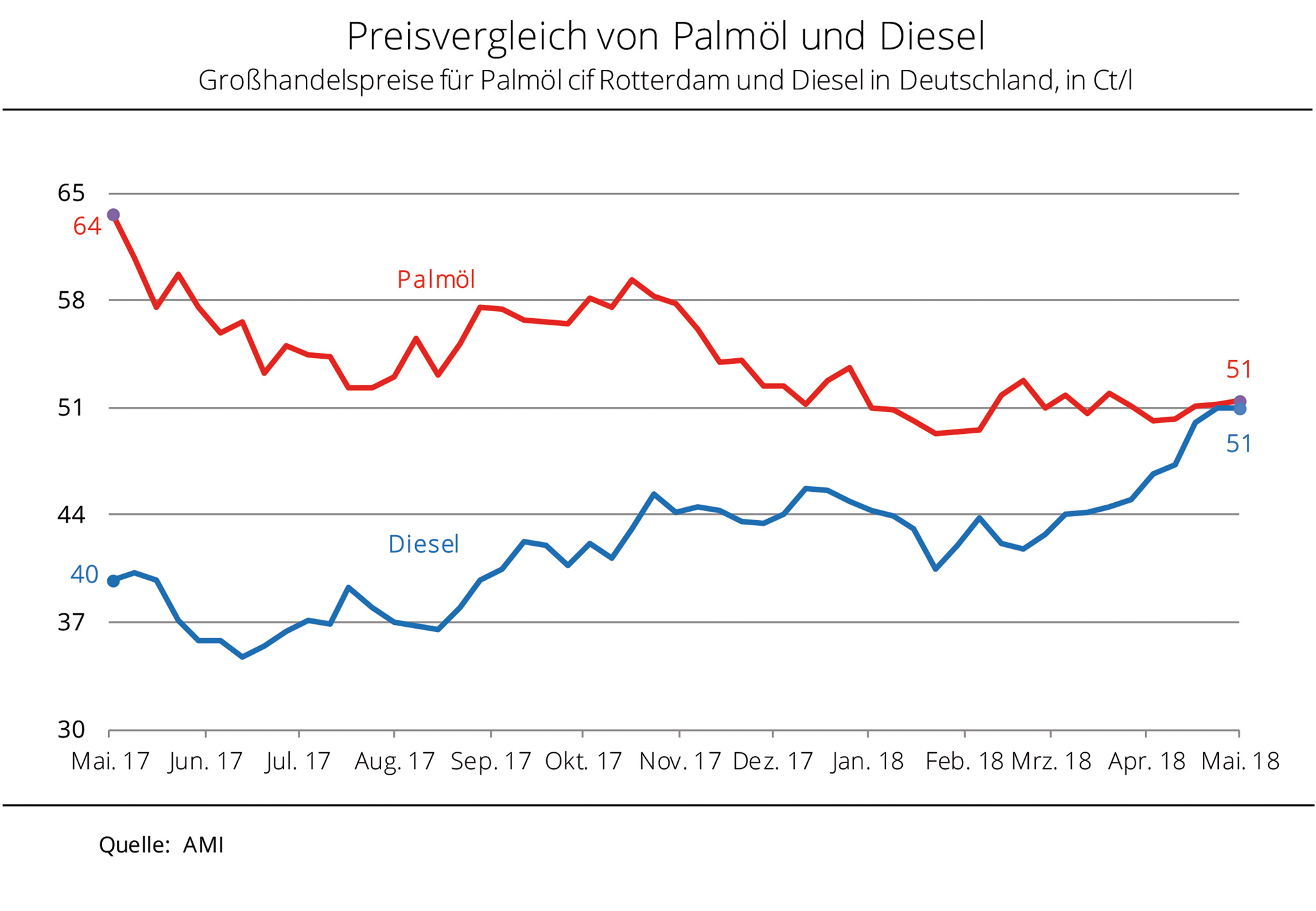 Die Großhandelspreise für Diesel in Deutschland haben sich seit ihrem letzten Tiefstand Ende Juni 2017 bis dato um fast 47 % auf rund 51 Ct/l verteuert. Grund sind die deutlich gestiegenen Rohölnotierungen, von denen die Preisbildung von Diesel bestimmt wird. Diese wurden durch die stetige Nachfrage einer florierenden Weltkonjunktur, die Förderkürzungen der OPEC-Staaten und Russlands sowie durch die angedrohten US-Sanktionen gegen die Ölindustrie des Irans angeschoben. Demgegenüber haben die Forderungen für Palmöl auf Jahressicht rund 19 % nachgegeben. Nach Angaben der Agrarmarkt Informations-Gesellschaft (mbH) übten eine rückläufige internationale Nachfrage, höhere indische Importzölle auf Palmöl und steigende Vorräte in Indonesien und Malaysia in den vergangenen Monaten Druck auf die Palmölpreise aus. Durch diese Konstellation haben sich die Großhandelspreise für Diesel und Palmöl sukzessive auf dem Niveau von rund 51 Ct/l angenähert. Palmöl ist ein bedeutender Rohstoff für die Herstellung von Biodiesel, Hydriertem Pflanzenöl (HVO) oder für die Mitverarbeitung in Erdölraffinerien. Letzteres sieht die 37. Bundes-Immissionsschutzverordnung vor, allerdings bisher beschränkt für den Zeitraum bis 2020.