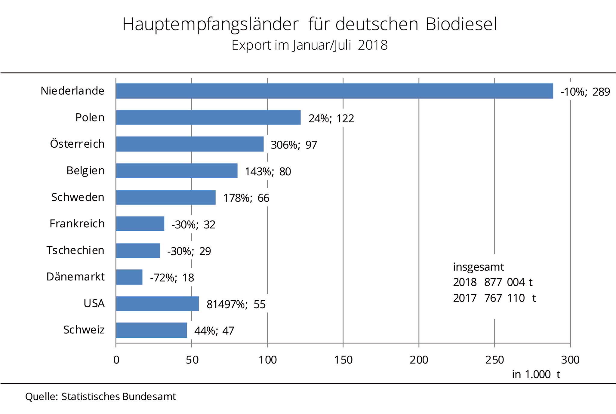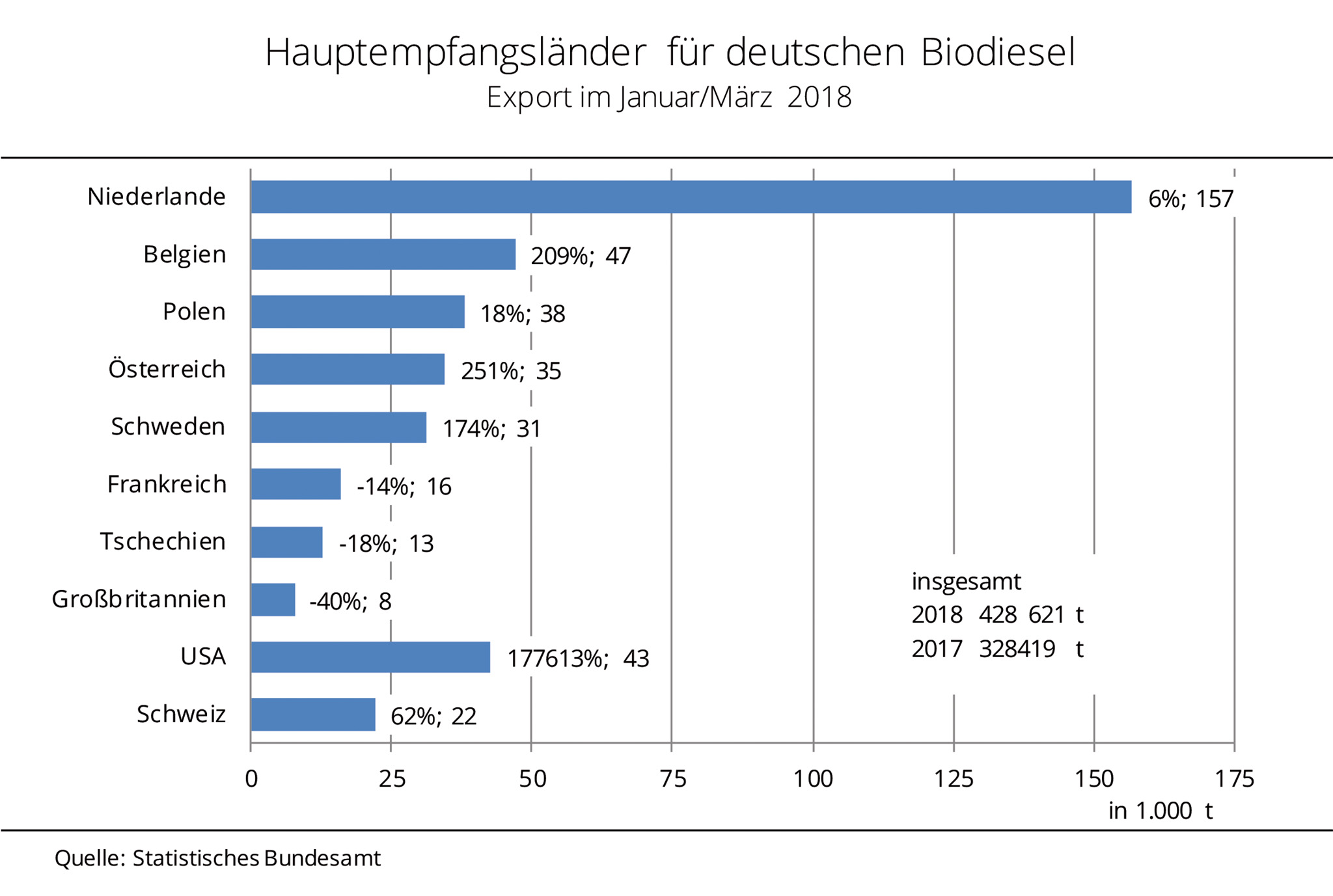 Im ersten Halbjahr 2018 sind die deutschen Biodieselausfuhren deutlich gestiegen. Besonders kräftig entwickelte sich die Nachfrage aus den USA, aber auch aus Schweden und Österreich. In den ersten sechs Monaten 2018 sind die Ausfuhren an Biodiesel gegenüber dem Vorjahreszeitraum um mehr als 14 % auf 877.000 t gestiegen. Davon wurden knapp 88 % innerhalb der EU-28 vermarktet und damit 7,5 % mehr als im Vorjahreszeitraum. Trotz eines Rückgangs von 10 % auf 288.800 t bleiben die Niederlande das wichtigste Abnehmerland für deutschen Biodiesel. Demgegenüber hat Polen mit 121.800 t rund ein Viertel mehr Biodiesel geordert als im ersten Halbjahr 2017. Österreich hat sich indes mit einer Vervierfachung an Belgien vorbei, auf Platz 3 geschoben, obwohl Belgien seine Biodieseleinfuhren mehr als verdoppelt hat. Den größten Importzuwachs verbuchten jedoch die USA mit 54.670 t. Im Vorjahreszeitraum wurde mit 67 t nur eine sehr geringe Menge aufgenommen. Nach Angaben der Agrarmarkt Informations-Gesellschaft (mbH) führten auch Schweden und die Schweiz deutlich mehr deutschen Biodiesel ein als im Vergleichszeitraum. Rückläufig haben sich hingegen die Biodiesellieferungen nach Frankreich, Tschechien und besonders Dänemark entwickelt. Die dänische Nachfrage brach um 72 % auf rund 17.600 t ein.