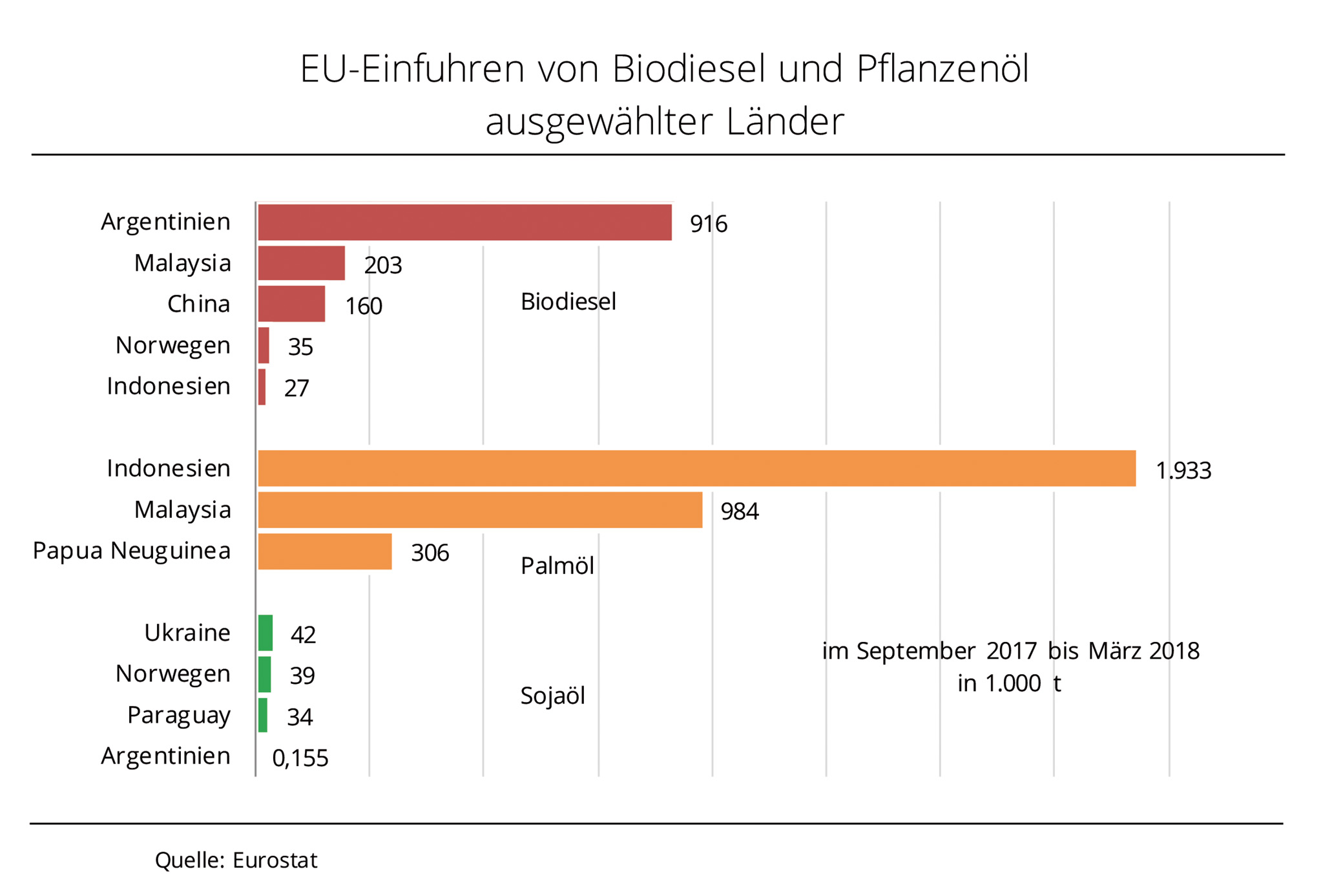 Ohnehin importierte die EU-28 mit 134.000 t nicht viel Sojaöl aus Drittländern, aber Palmöl: Im genannten Zeitraum waren es 2,8 Mio. t, hauptsächlich aus Indonesien (1,93 Mio. t) und Malaysia (0,9 Mio. t). Hauptempfangsländer waren die Niederlande, Spanien und Italien. Mit rund 67 % wurde der größte Teil der indonesischen Palmöleinfuhren für technische Zwecke und damit zur Kraftstoffnutzung eingesetzt. Die UFOP befürchtet, dass der Import analog zu 2012 – vor Inkrafttreten der Importzölle auf Biodiesel aus Argentinien und Indonesien – auf 3 bis 5 Mio. t anwachsen könnte. Deshalb müsse die EU-Kommission wie bei den argentinischen Biodieselimporten jetzt ebenso handeln und sich gegen einen weiteren Anstieg von Palmölimporten engagieren. Es sei geradezu paradox, dass die EU-Kommission im Rahmen der Neufassung der Erneuerbare Energien Richtlinie an der „iLUC-Politik“ festhalte und auch das in der EU produzierte Rapsöl ausschließen wolle, sich aber gleichzeitig dem vom Europäischen Parlament geforderten Palmölverbot verschließe.