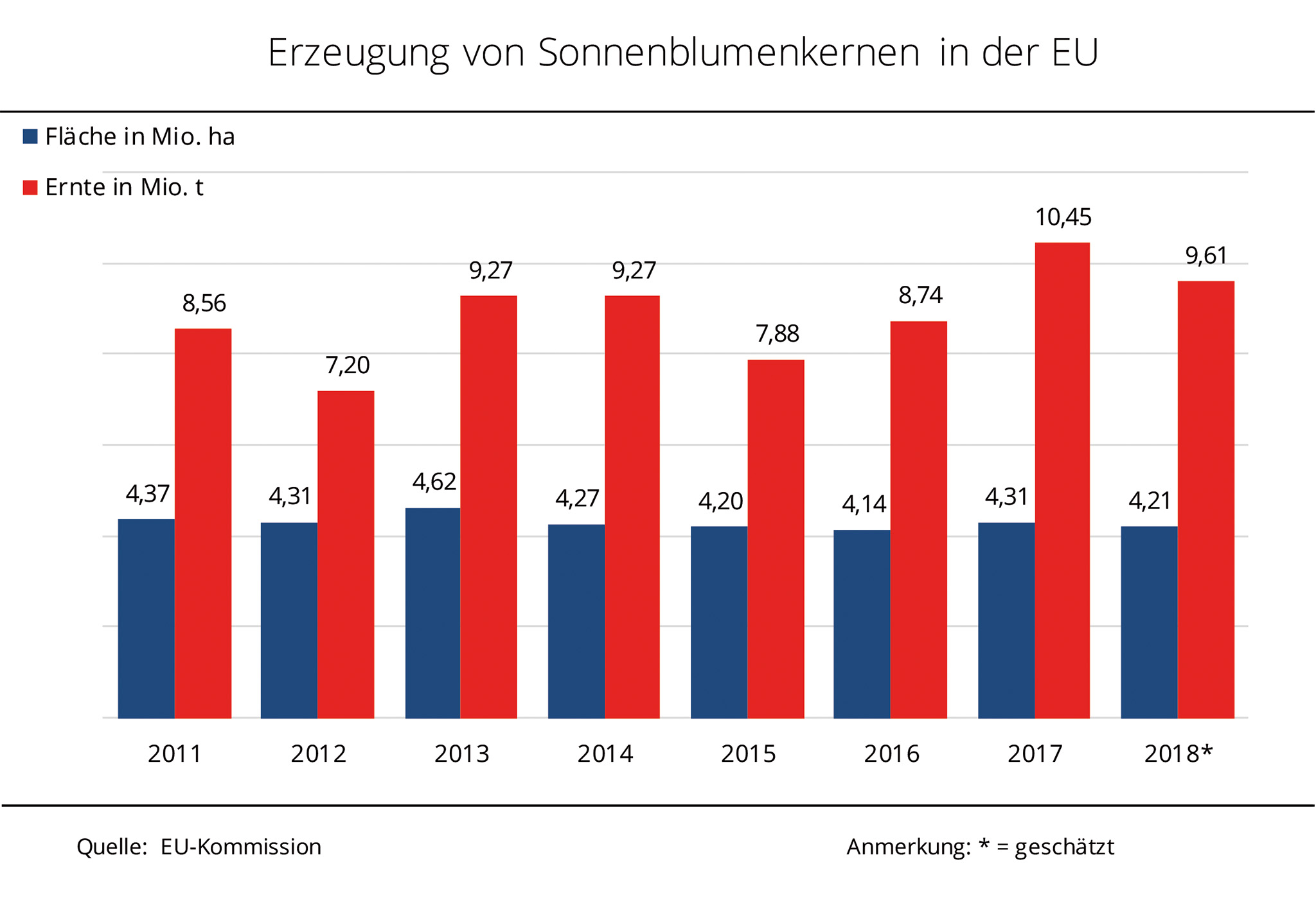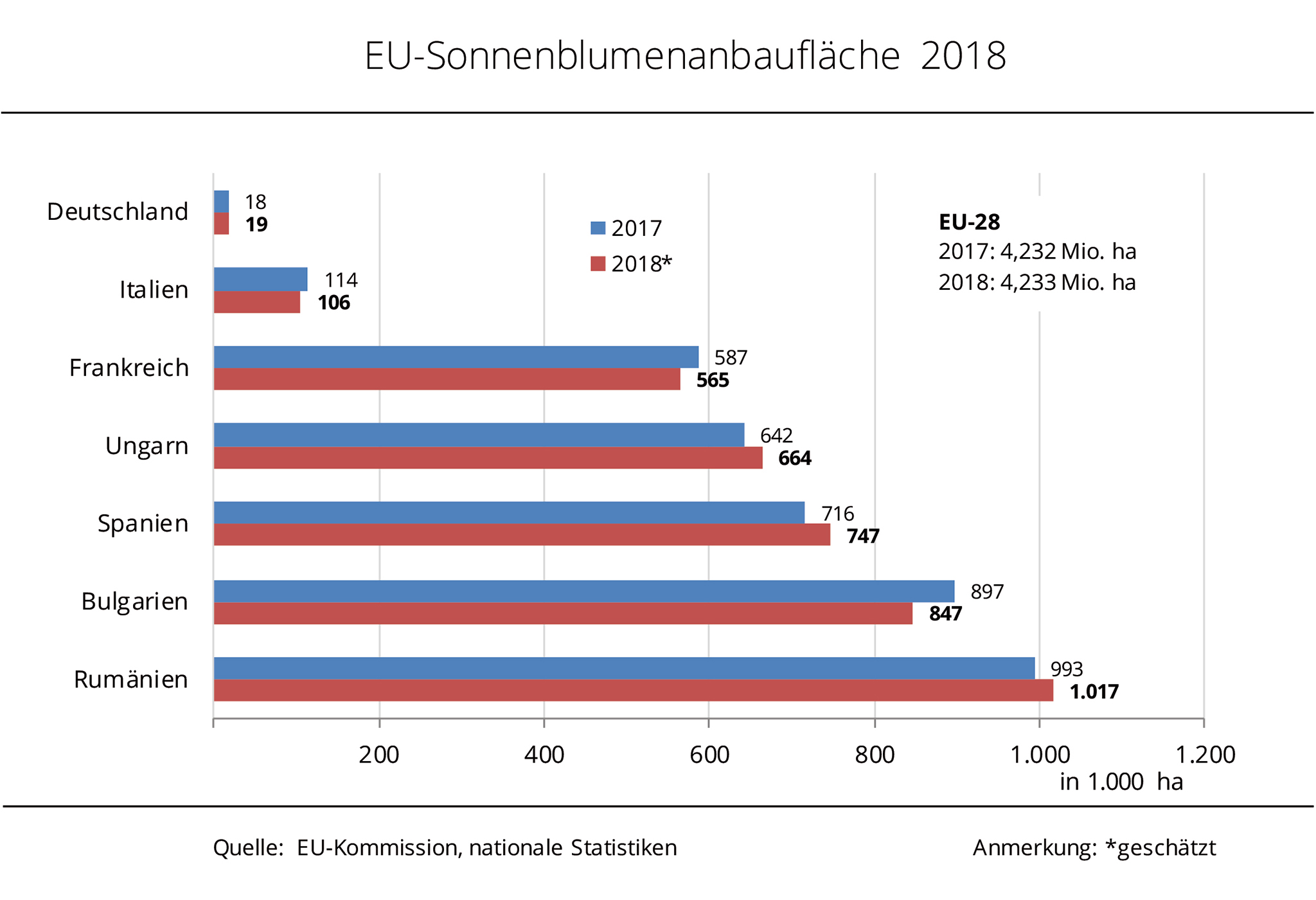 Trotz konstanter Anbaufläche in der EU-28 rechnet die EU-Kommission mit einem kräftigen Rückgang der Erzeugung von Sonnenblumenkernen. Besonders in Rumänien und Frankreich könnten die Erträge enttäuschen. Nach aktuellen Zahlen der EU-Kommission ist die Anbaufläche von Sonnenblumen 2018 in der EU-28 mit 4,2 Mio. ha nahezu unverändert zum Vorjahr geblieben. Während Spanien und Ungarn ihre Aussaatfläche um jeweils rund 4 % ausgedehnt haben, wurden in Italien, Bulgarien und in Frankreich weniger angebaut. Mit mehr als 1 Mio. ha ist Rumänien das bedeutendste Erzeugerland von Sonnenblumenkernen innerhalb der Europäischen Union und hat seine Anbaufläche erneut um 2 % erweitert. Die EU-Kommission erwartet dennoch einen Rückgang der Ernte. Mit geschätzt 9,7 Mio. t sind es knapp 2 % weniger als noch im April prognostiziert wurde und mehr als 6 % unter dem Niveau 2017. Nach Angaben der Agrarmarkt Informations-Gesellschaft mbH (AMI) sind es vor allem die geringeren Ertragserwartungen, die zu einer Reduzierung der Ernteprognose führen. Für Rumänien wird mit einem Rückgang gegenüber Vorjahr von fast 18 % gerechnet. Auch die Erträge in Spanien und Frankreich dürften mit minus 12 % bzw. 14 % deutlich kleiner ausfallen als in der vergangenen Saison. Grund für die rückläufigen Ertragserwartungen war die feuchte Witterung Anfang April 2018 in Südosteuropa und um das Mittelmeer, die zu erheblichen Verzögerungen bei der Aussaat führte.