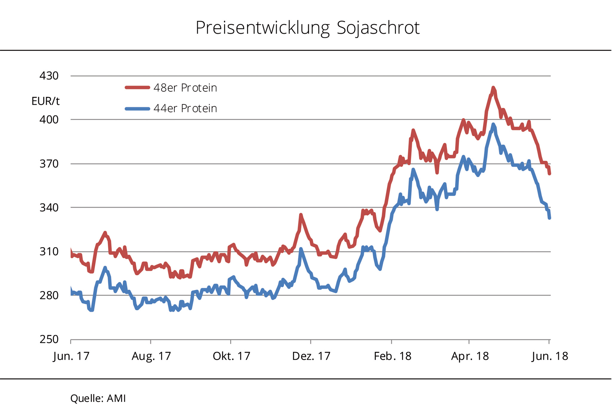 Die Preise für konventionelles Sojaschrot haben sich seit Anfang Mai 2018 deutlich vergünstigt. Ein üppiges Angebot aus Brasilien, günstige Vegetationsbedingungen in den USA und der eskalierende Handelsstreit zwischen China und den Vereinigten Staaten üben Druck aus. Die Forderungen für Sojaschrot haben sich nach dem kräftigen Anstieg im ersten Quartal 2018 wieder deutlich abgeschwächt. Seit den Jahreshöchstständen Anfang Mai ist 48er Sojaschrot um 14 % auf 363 EUR/t und 44er Ware sogar um 16 % auf 333 EUR/t gesunken. Damit liegen die Preise für beide Schrotqualitäten aber immer noch rund 18 % über dem Niveau des Vorjahresmonats. Grund für den deutlichen Rückgang der Forderungen in den vergangenen Wochen ist nach Angaben der Agrarmarkt Informationsgesellschaft mbH (AMI) der schwächer tendierende Terminmarkt. In Chicago sind die Sojaschrotkurse seit Anfang Mai 2018 kontinuierlich gefallen. Die Marktprognose ist weiterhin bärisch. In Brasilien dürfte die Sojaernte noch größer ausfallen als bisher erwartet und die US-Sojabestände entwickeln sich bei nahezu optimaler Witterung sehr gut, sodass auch hier eine Rekordernte zustande kommen könnte. Die Union zur Förderung von Oel- und Proteinpflanzen (UFOP) erwartet, dass die jüngste Eskalation des Handelsstreites zwischen den USA und China mit der Einführung von Zöllen auf US-Sojabohnen die Handelsströme kurzfristig und spürbar verschieben dürfte. Dies würde Druck auf die US-Sojanotierungen ausüben, denn US-amerikanischen Sojabohnen müssten sich neue Märkte suchen. Davon profitieren könnte die EU, zumal Ölmühlen bereitstehen, entsprechende Mengen zu verarbeiten. Die UFOP unterstreicht die global gute Versorgung bei Ölsaaten. Die Ernteausfälle in Argentinien sind im Markt nicht spürbar, betont die UFOP. Vielmehr bestimme der Handelskonflikt zusammen mit den guten Ernteerwartungen in den USA und Brasilien das Marktgeschehen. Das US-Landwirtschaftsministerium (USDA) schätzte kürzlich, dass die argentinische Bohnenernte 2017/2018 mit etwa 37 Mio. t um knapp 36 % geringer ausfällt.