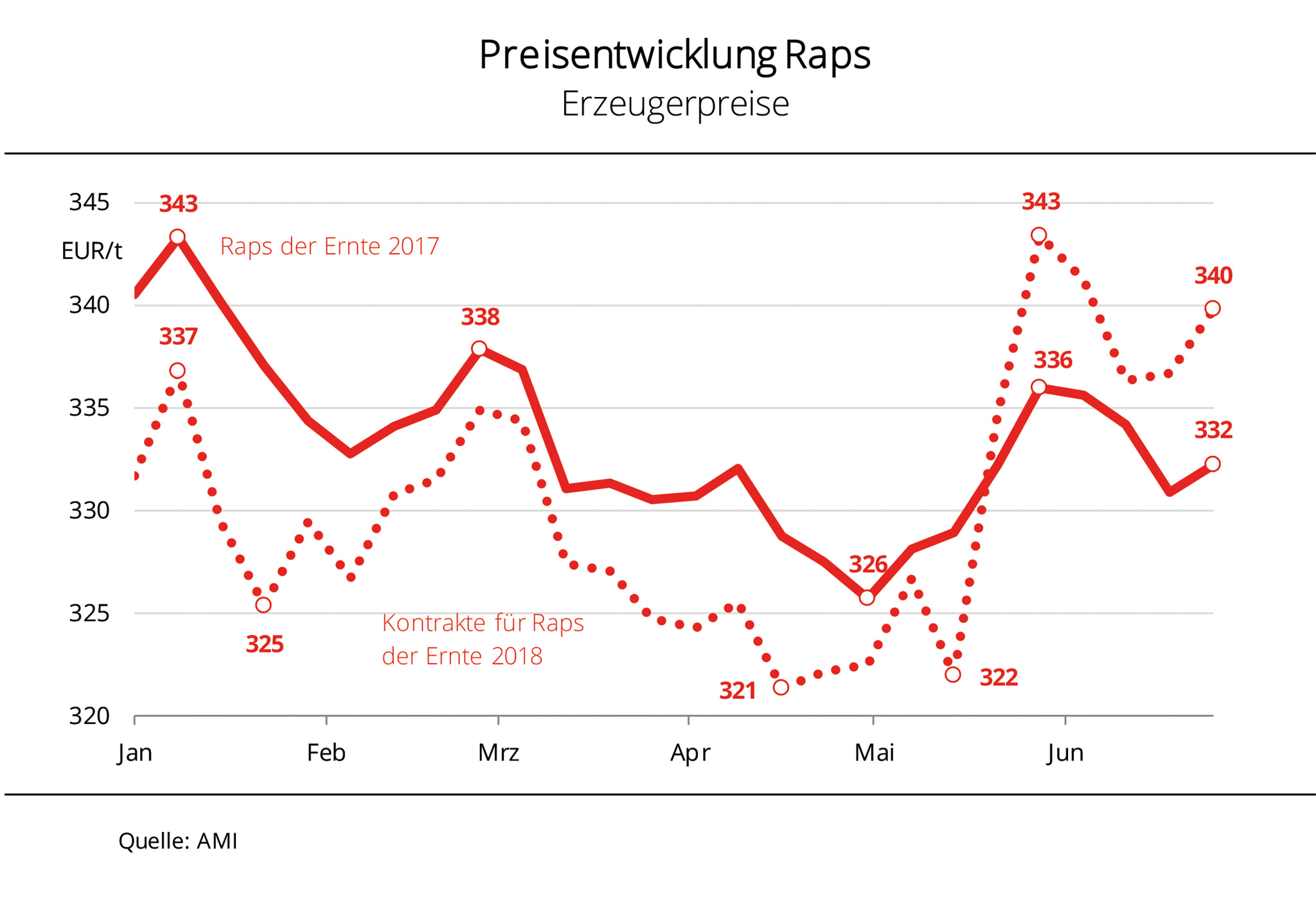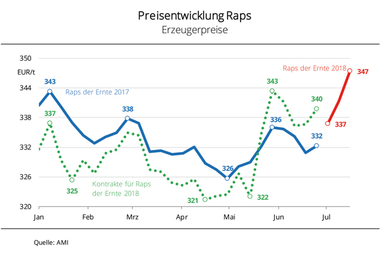 Die anhaltende Hitzewelle in der EU-28 dürfte zu einer deutlich kleineren Rapsernte führen als bisher erwartet. Die Preise sind bereits kräftig gestiegen und dürften weiter zulegen. Die Erzeugerpreise für Raps der Ernte 2018 in Deutschland sind in den vergangenen Wochen kräftig gestiegen. Seit Anfang Juli 2018 haben sich die Forderungen im Schnitt um rund 11 EUR/t auf 347 EUR/t befestigt. Damit haben sich die Rapspreise seit den Jahrestiefstständen Ende April um mehr als 6 % erhöht. Grund ist die absehbar enttäuschende Rapsernte in vielen Ländern der EU-28. Besonders in Deutschland und Frankreich, aber auch außerhalb der EU in der Ukraine wird von Mindererträgen und teilweise geringen Ölgehalten gesprochen. Die Ertragseinbußen belaufen sich nach Angaben der Agrarmarkt-Informationsgesellschaft (AMI) je nach Region auf 10 % bis 40 % gegenüber dem Vorjahr. Für Deutschland rechnen Marktbeobachter nach den ersten Druschergebnissen mit der kleinsten Rapsernte seit zehn Jahren. Noch ist es aber zu früh für belastbare Ergebnisse. Entsprechend zurückhaltend ist das Angebot der Erzeuger an neuerntigem Raps. Zum einen will niemand Gefahr laufen, eingegangene Kontrakte nicht erfüllen zu können. Zum anderen spekulieren Landwirte auf Grund der absehbar knappen Verfügbarkeit auf deutlich festere Preise. Die Union zur Förderung von Oel- und Proteinpflanzen (UFOP) hofft, dass durch die aktuelle Preisentwicklung der Raps auch für die anstehende Aussaat wieder interessanter wird. Als wichtigste Blattfrucht ist Raps auch aus Fruchtfolgegründen in den meisten Anbauregionen alternativlos.