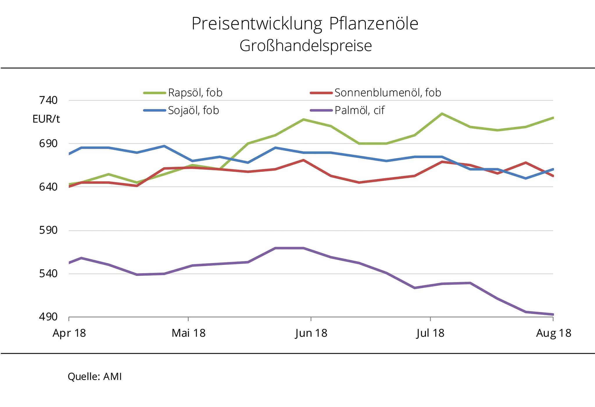 Die Forderungen für Rapsöl haben sich in den vergangenen Wochen kräftig erholt. Palmöl fällt indes auf ein Mehrjahrestief. Die Großhandelspreise für Pflanzenöle in Deutschland haben sich im zweiten Quartal 2018 sehr heterogen entwickelt. Nach Angaben der Agrarmarkt Informations-Gesellschaft mbH (AMI) wurden für Rapsöl zuletzt 720 EUR/t fob Hamburg verlangt. Das entspricht einem Zuwachs von fast 12 % gegenüber den Jahrestiefstständen von Mitte April. Grund ist die stabile Biodieselnachfrage in der EU-28. Vor dem Hintergrund der avisiert kleinen EU-Rapsernte 2018 sind die Produzenten bereit, deutliche Aufschläge für Rapsöl zu bezahlen, um an Ware zu gelangen. Demgegenüber haben sich die Forderungen für Palmöl sukzessive abgeschwächt und erreichten Anfang August mit 493 EUR/t cif Rotterdam ein 3-Jahrestief. Grund dafür sind die schwachen Palmölkurse in Kuala Lumpur, die auf Grund enttäuschender malaysischer Exportdaten zuletzt wieder deutlich fielen. Zudem herrscht Unsicherheit, wie groß der saisontypische Produktionszuwachs in der zweiten Jahreshälfte ausfallen und wann das Produktionsmaximum erreicht sein dürfte. Auch Sojaöl fiel Ende Juli mit 660 EUR/t fob Hamburg auf ein 2,5-Jahrestief. Die üppige globale Sojaversorgung und Sorgen vor einer Zuspitzung des Handelskonfliktes zwischen China und den USA belasten den Markt weiter. Die Union zur Förderung von Öl und Proteinpflanzen (UFOP) erwartet, dass die höheren Rapsölpreise auch zu höheren Erzeugerpreisen führen werden. Sie erinnert daran, dass mit der Aussaat im August und September auch die Grundlage für die Rapsversorgung im kommenden Wirtschaftsjahr gelegt wird. Die UFOP erwartet, dass die europäischen Kunden der Biodieselindustrie und die Biokraftstoffhersteller selbst das Verhandlungsergebnis zur Neufassung der Erneuerbare Energien-Richtlinie (RED II) und das klare politische Votum, insbesondere des EU-Parlamentes, im Blick behalten, den Einsatz palmölbasierter Biokraftstoffe bzw. von Palmöl als Rohstoff zu reduzieren. Die Diskussion um die Nachhaltigkeit von Palmöl geht völlig zu Unrecht zulasten der europäischen Rapserzeugung. Denn diese ist ein wichtiges Element einer europäischen Strategie für eine möglichst gentechnikfreie Proteinfuttermittelversorgung.