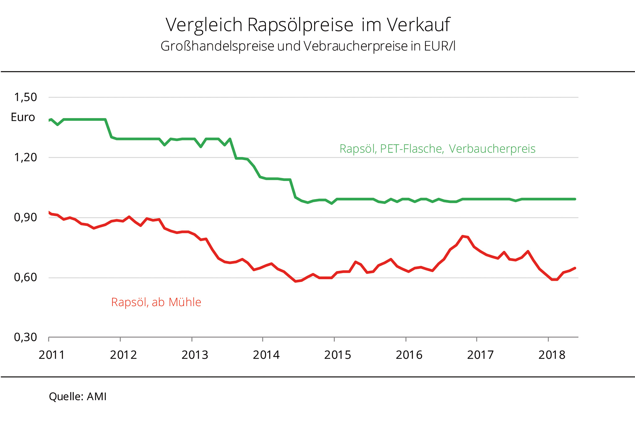 Das knappere Angebot an Agrarrohstoffen durch die dürrebedingten Ertragseinbußen wirkt sich nur unwesentlich auf die Verbraucherpreise aus. Preistreiber sind vorrangig Lohn- oder Energiekosten. Infolge der langanhaltenden Dürreperiode in weiten Teilen Deutschlands stellte Bundeslandwirtschaftsministerin Julia Klöckner im Erntebericht 2018 für Raps eine Erntemenge von 3,65 Mio. t. (Vj. 4,27 Mio. t) fest. Das ist die niedrigste Menge seit mehr als 18 Jahren. Unterdurchschnittliche Ernteergebnisse führen regelmäßig zur Frage, ob die Brötchenpreise steigen oder – wie bei Raps - ob Rapsspeiseöl oder Verarbeitungsprodukte wie z. B. Margarine jetzt teurer werden. Ein für die betroffenen Landwirte auch finanziell enttäuschendes Ernteergebnis lässt jedoch nur bedingt Rückschlüsse auf die Entwicklung der Produktpreise für die Konsumenten zu. So haben sich nach Angaben der Agrarmarkt Informations-Gesellschaft (AMI) die Verbraucherpreise für Rapsöl mit durchschnittlich 0,99 EUR/l in den vergangenen vier Jahren nahezu nicht verändert. Demgegenüber fielen die Schwankungen der Großhandelspreise für Rapsöl ab Ölmühle deutlich stärker aus, ohne jedoch eine Preiswirkung auf der Verbraucherstufe zu entfalten. Auch bei der Entwicklung der Erzeugerpreise für Raps und den Forderungen der Ölmühlen ist ein direkter Zusammenhang oft nicht gegeben. Während Raps seit November 2017 kaum günstiger wurde, tendierte Rapsöl deutlich schwächer. Druck kam vor allem von den gefallenen Palmölpreisen bei gleichzeitiger rückläufiger Nachfrage nach Rapsöl für die Biodieselproduktion. Ähnlich ist es auch bei dem Verhältnis von Weizenpreisen auf der Erzeugerstufe und den Brötchenpreisen für den Verbraucher. Grob geschätzt müsste sich der aktuelle Weizenpreis von etwa 19 EUR/dt auf 40 EUR/dt mehr als verdoppeln, um eine Preissteigerung von 1 Cent für ein Brötchen zu bewirken. Relevante Preistreiber sind demgegenüber vor allem die Lohn- oder Energiekosten.