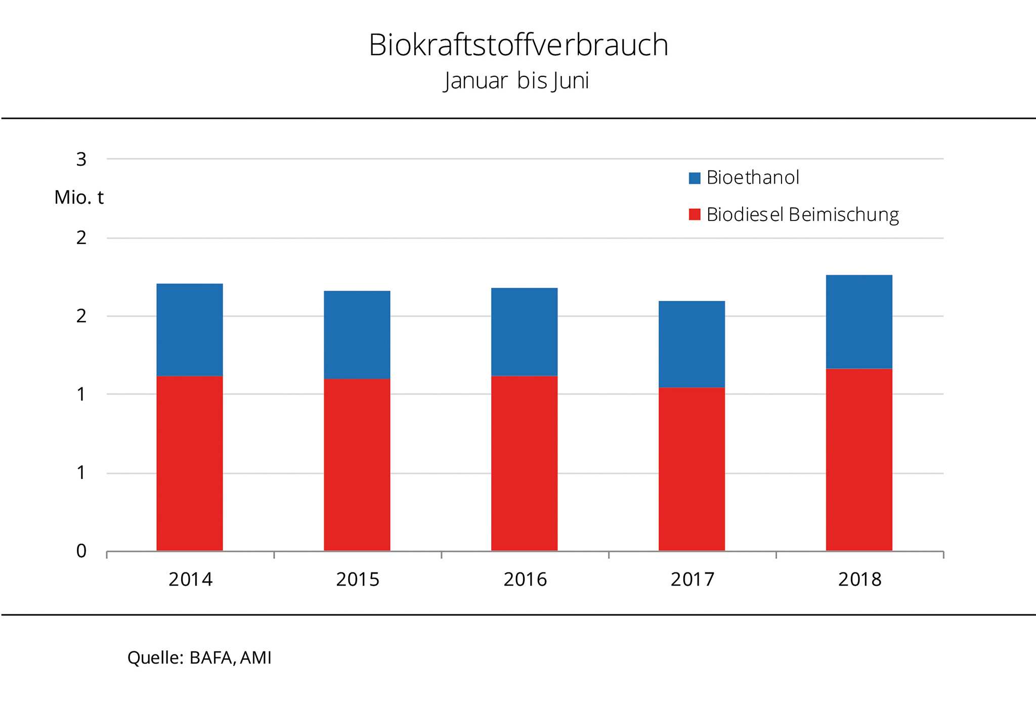 Im Straßenverkehr wurden im ersten Halbjahr 2018 weniger Diesel- und Ottokraftstoffe verbraucht als im Vergleichszeitraum 2017. Aber der Einsatz von Biodiesel und Bioethanol stieg deutlich. Mit fast 205.000 t wurde im Mai 2018 die stärkste Nachfrage nach Biodiesel in den vergangenen 6 Monaten registriert und die größte Menge seit August 2017. Dabei wurde in den Monaten zuvor bereits deutlich mehr verbraucht als im Vorjahreszeitraum. Der Inlandsverbrauch an Biodiesel stieg von Januar bis Juni 2018 auf knapp 1,2 Mio. t. Das waren 11 % mehr als im ersten Halbjahr 2017. Da der Dieselverbrauch gleichzeitig um 5,2 % gegenüber Vorjahr auf 17,05 Mio. t abgenommen hat, erhöhte sich der Beimischungsanteil deutlich. Während dieser 2017 rund 5,7 % betrug, errechnete die Agrarmarkt Informations-Gesellschaft mbh (AMI) für 2018 einen Anteil von bisher 6,4 %. Nach Daten des Bundesamtes für Wirtschaft und Ausfuhrkontrolle (BAFA) verzeichnete auch Bioethanol einen steigenden Beimischungsanteil, der im ersten Halbjahr 2018 rund 6,7 % erreichte und damit die 6,1 % des Vorjahreszeitraumes ebenfalls übertraf.