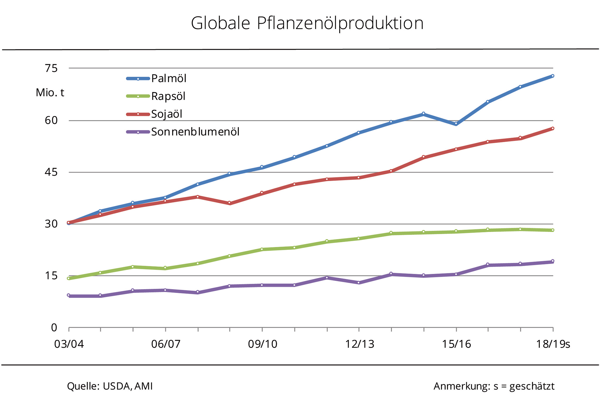 Das US-Landwirtschaftsministerium (USDA) prognostiziert für 2018/19 eine weltweite Rekord-Pflanzenölproduktion von 204 Mio. t. Besonders das Palm- und Sojaölangebot könnte zulegen. Die weltweite Pflanzenölproduktion 2018/19 dürfte nach Schätzung des USDA um mehr als 3 % gegenüber dem Vorjahr auf ein Rekordniveau von knapp 204 Mio. t steigen. Davon entfallen rund 87 % auf Palm-, Soja-, Raps- und Sonnenblumenöl. Mit einem Plus von 5 % dürfte Sojaöl den größten Zuwachs erzielen. Die üppige Rohstoffverfügbarkeit aus der Rekord-Sojaernte 2018 in Brasilien und den USA und die anhaltend rege internationale Nachfrage nach Verarbeitungsprodukten aus Soja begünstigten die Entwicklung. Günstige Vegetationsbedingungen in Südostasien und unerwartet hohe Erträge auf den Palmölplantagen führen bei Palmöl zu einer Produktionssteigerung gegenüber 2017/18 von 4,5 % auf 72,8 Mio. t. Die Produktion von Sonnenblumenöl dürfte um 4 % wachsen, da die ukrainische Sonnenblumenerzeugung rund 6 % größer ausfällt als im Vorjahr. Demgegenüber dürfte die Rapsölproduktion 2018/19 mit 28,1 Mio. t um rund 1 % kleiner ausfallen als im Wirtschaftsjahr 2017/18. Grund dafür ist nach Angaben der Agrarmarkt Informations-Gesellschaft mbH (AMI) die trockenheitsbedingt enttäuschende Rapsernte 2018 in der EU-28 und Australien.