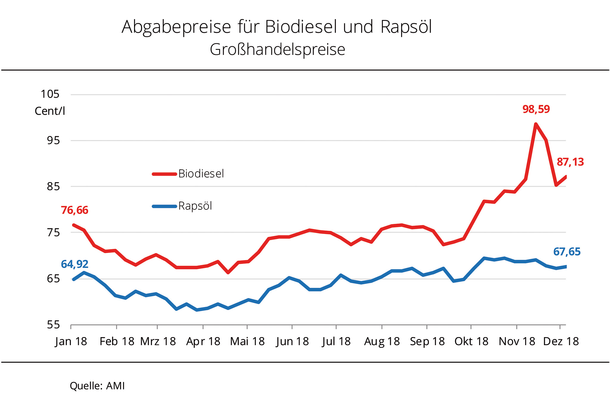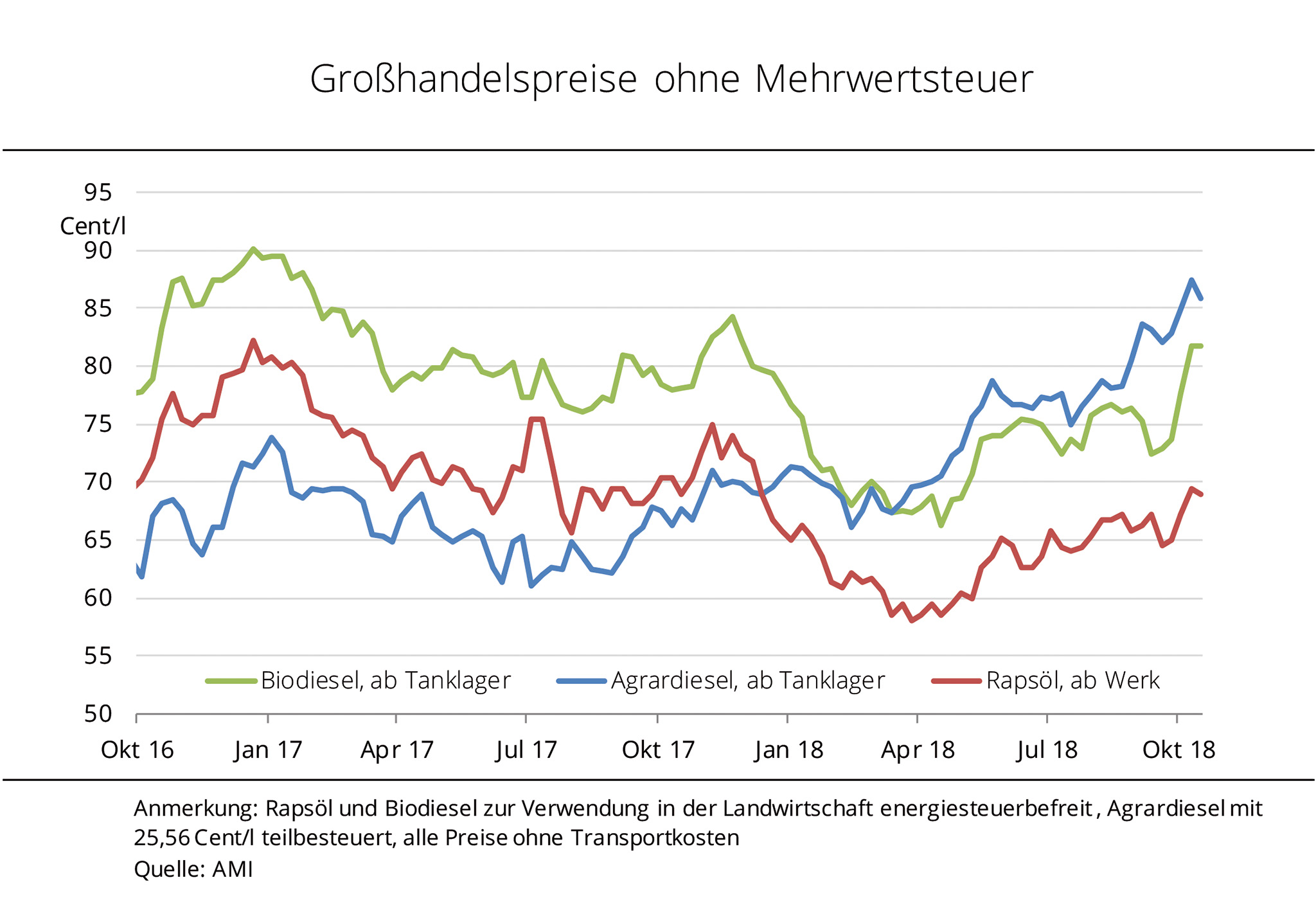 Die Großhandelspreise für Agrardiesel, Biodiesel und Rapsöl sind in den vergangenen Monaten kräftig gestiegen, aber keiner der drei Kraftstoffe hat sich so stark verteuert wie Agrardiesel. Im Oktober erreichten die Rohölpreise ein Vierjahreshoch, was dazu führte, dass sich Agrardiesel, die steuervergünstigte Alternative der landwirtschaftlichen Betriebsmittel, auf 87,50 Cent/l verteuerte. Noch im März 2018 lagen Agrardiesel und Biodiesel preislich gleich auf, schon seit Ende des Jahres 2017 war Rapsölkraftstoff günstiger als Agrardiesel. Zwar weisen die Preiskurven einen ähnlichen Verlauf auf, aber die Preisabstände sind teils deutlich gestiegen. Daher rechnet sich die Verarbeitung von Rapsöl zu Biodiesel und der wiederum findet nicht zuletzt durch die notwendige Erfüllung der Winterqualität flott Absatz in der Beimischung. Die unerwartet lebhafte Nachfrage hat – neben den Mineralölkursen – auch die Preise für Biodiesel nach oben getrieben. Dieser kostet nach Angaben der Agrarmarkt Informations-Gesellschaft mbH (AMI) jetzt 22 % mehr als noch im Frühjahr 2018. Aber auch Niedrigwasser, die kleinere Ernte 2018 und die schwache Aussaat für 2019 verteuern den Raps.