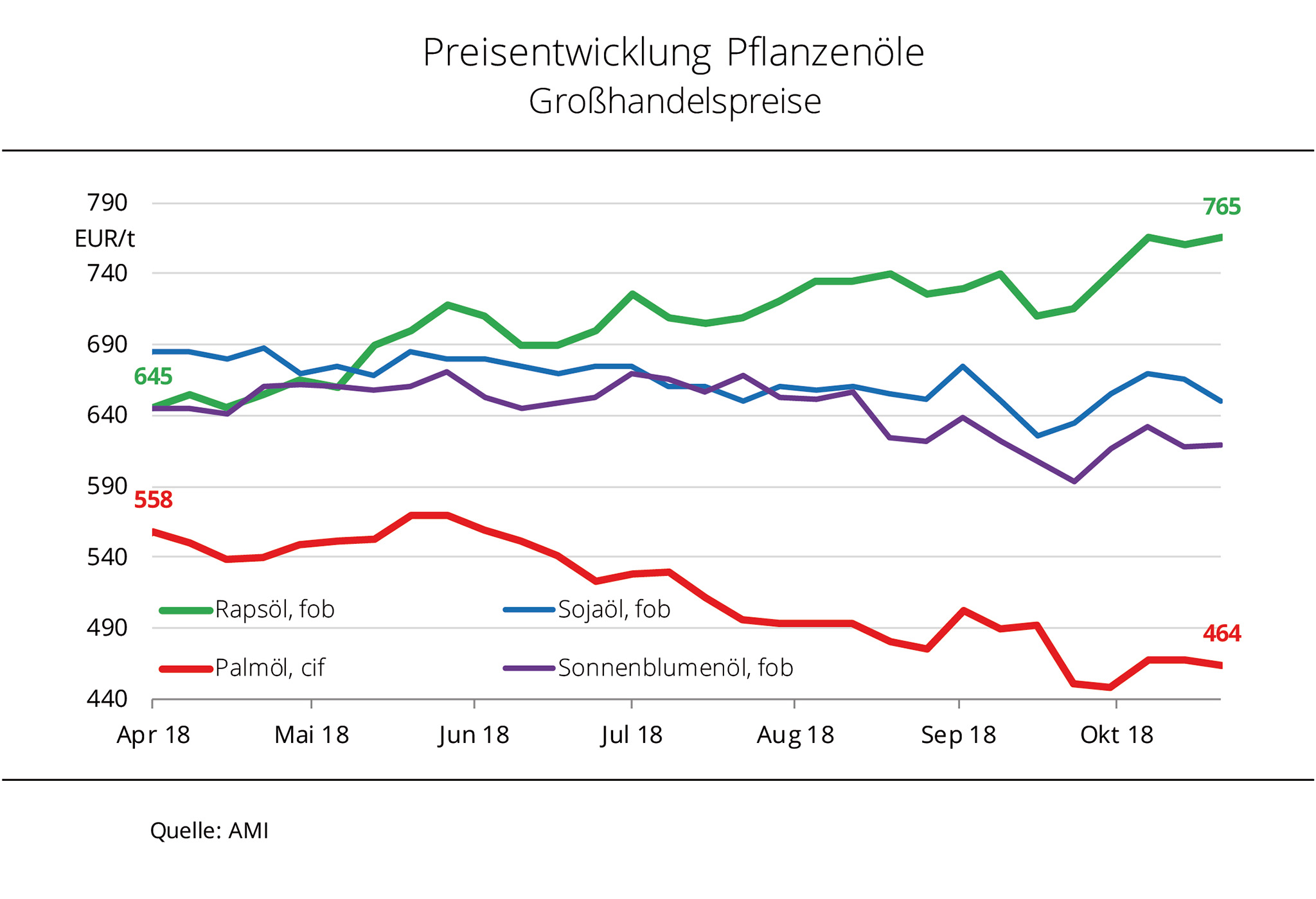 Seit 7 Monaten entwickeln sich die Großhandelspreise für Rapsöl und Palmöl in entgegengesetzte Richtungen. Die Preisdifferenz zwischen Rapsöl fob Deutschland und Palmöl cif Rotterdam, stieg im Zeitraum April bis Ende Oktober von 87 EUR/t auf mehr als 300 EUR/t. Die Agrarmarkt Informations-Gesellschaft mbH (AMI) stellte zuletzt im Dezember 2012 einen so ungewöhnlich großen Abstand fest. Hauptgrund für die ungleiche Preisentwicklung ist die unterschiedliche Angebotsentwicklung: Rapsöl ist gesucht und erntebedingt knapp; dagegen ist das Palmölangebot reichlich. Das Kaufinteresse der Beimischer ist bei Rapsmethylester-Biodiesel aufgrund seiner besseren Wintereigenschaften ungebrochen. Auch wenn sich die Nachfrage bis zum Jahresende beruhigen dürfte, werden weiterhin Bedarfslücken zu füllen sein, die für Marktimpulse sorgen. Nicht nur die kleinere Rapsernte ließ die Preise steigen. Denn auch die seit Wochen niedrigen Pegelstände auf den Wasserwegen verteuern die Frachten für die Saatanlieferung, aber auch für den Abtransport der Produkte insbesondere Rapsschrot. Demgegenüber haben sich die Forderungen für Palmöl sukzessive abgeschwächt und erreichten Ende Oktober ein 3-Jahrestief. Ausgelöst wurde dies durch steigende Vorräte in den Produktionsländern infolge geringer Exporte. Denn die Erzeugung war zeitweise kleiner als in den Vorjahresmonaten. Außerdem steigt die Produktion in der zweiten Jahreshälfte saisonal an und wird voraussichtlich sogar deutlich über den Vorjahresmengen liegen. Profiteure dieser gegenläufigen Preisentwicklung sind die Unternehmen, die Palmöl in der Lebensmittel- und in der chemischen Industrie weiterverarbeiten. Eine Marktpreisdifferenzierung zwischen als nachhaltig und nicht zertifiziertem Palmöl hat sich in den Marktpreisnotierungen bisher nicht durchsetzen können, stellt die Union zur Förderung von Oel- und Proteinpflanzen (UFOP) fest. Die vom Bundeslandwirtschaftsministerium geförderte Branchenplattform „Forum Nachhaltiges Palmöl“ (FONAP) beklagte kürzlich zurecht, dass sich insbesondere der Anteil an nachhaltig zertifiziertem Palmöl zur stofflichen Nutzung nicht weiter entwickle und bei 27% verbleibe, trotz eines Überangebotes an zertifiziertem Palmöl. Die UFOP stellt die Frage, ob bei 464 EUR/t eine nachhaltige Palmölproduktion überhaupt möglich ist, wenn insbesondere soziale Kriterien in die Betrachtung einbezogen werden.