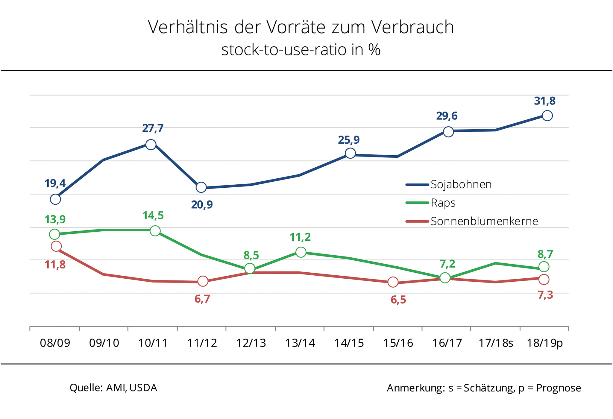 Während die größere globale Soja- und Sonnenblumenernte zu einem besseren Verhältnis zwischen Vorräten und Verbrauch führt, wird es für Raps etwas knapper. Das Verhältnis zwischen Vorräten und Verbrauch (auch „Stock-to-Use-Ratio“ genannt) ist eine wichtige Kenngröße zur Einschätzung der Versorgung und infolgedessen auch für die mögliche Preisentwicklung. Die Stock-to-Use-Ratio für Raps und Sonnenblumenkerne ist seit Jahren rückläufig. Anders sieht es für Sojabohnen aus. Rekordernten lassen Angebot und Vorräte kräftig steigen. Allerdings gibt es auch einen stetig wachsenden Bedarf an Sojaprotein für die Tierfütterung, ganz besonders in China. Durch die positive Konjunktur- und Einkommensentwicklung im bevölkerungsreichsten Land der Welt wächst die Kaufkraft und damit die Nachfrage nach Fleisch und folglich auch die Nachfrage nach Ölschroten zur Versorgung der steigenden Viehzahlen. Dem wachsenden Sojabedarf Chinas stehen 2018/19 Rekordernten in den USA und Brasilien gegenüber. Dieses Wechselspiel sorgt zwar für eine dynamische Preisentwicklung, die sich angesichts der gut versorgten Märkte jedoch abschwächt.